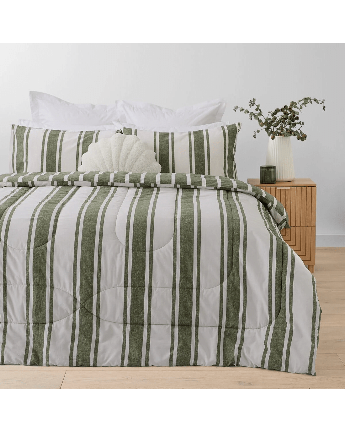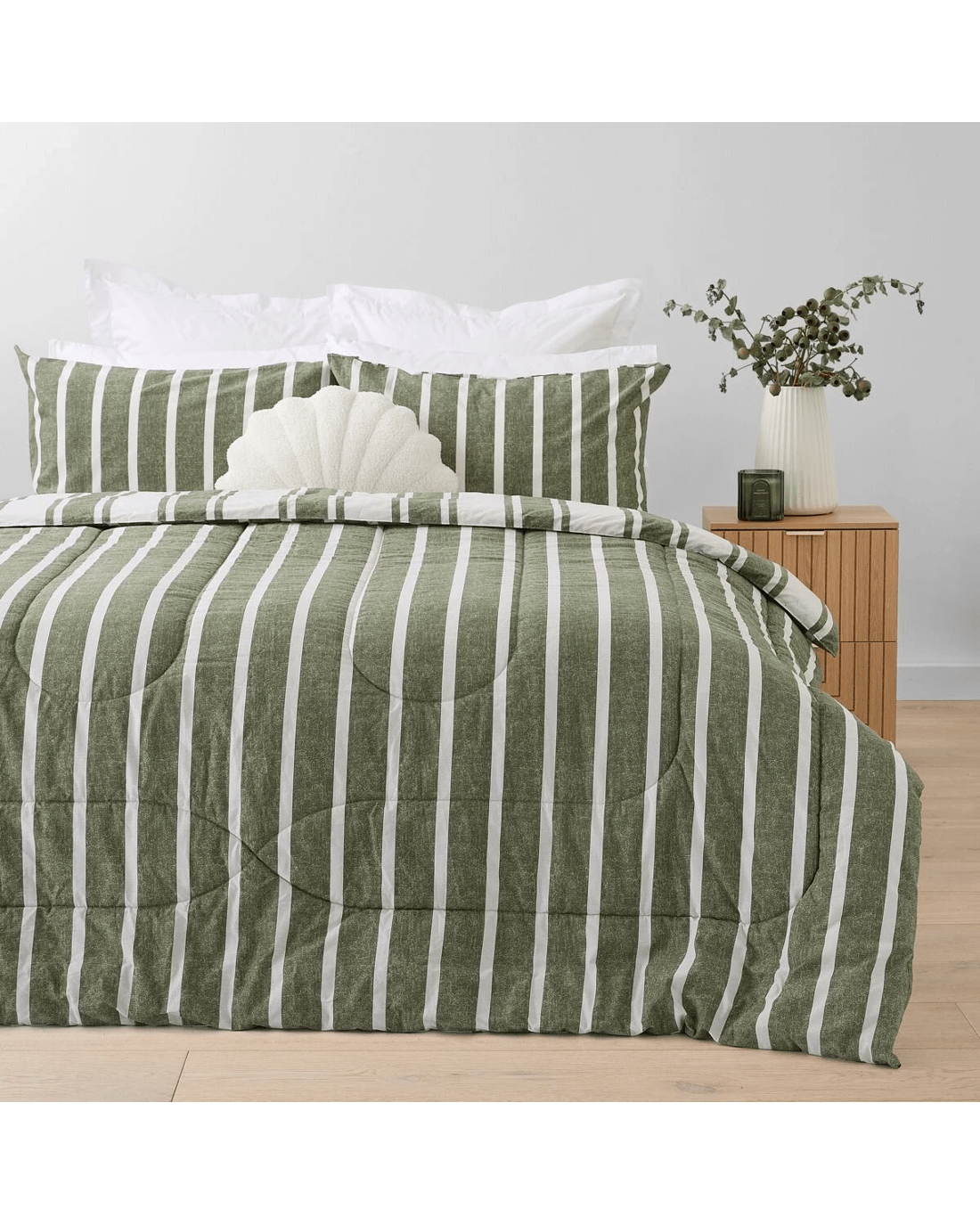 Elevate your bedroom decor with the Eden Reversible Comforter Set. Its elegant striped print adds a touch of sophistication, making it a perfect blend of style and comfort.