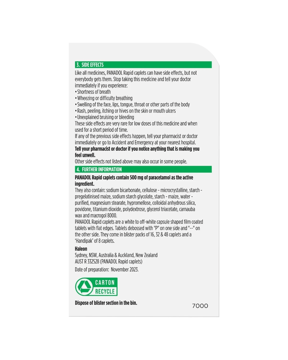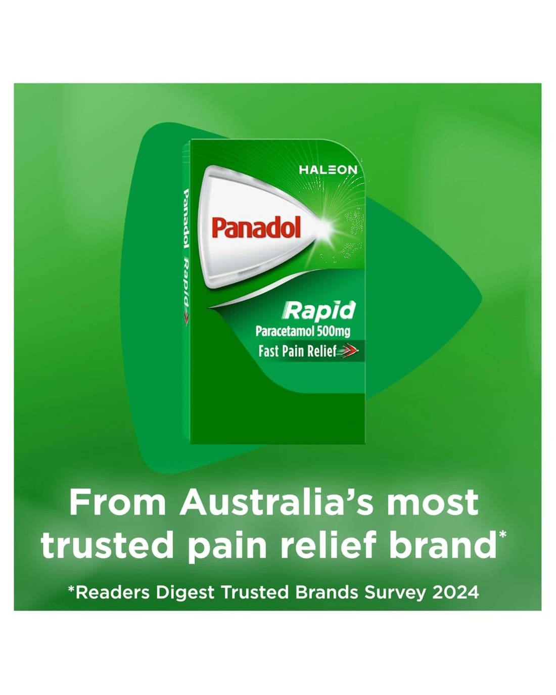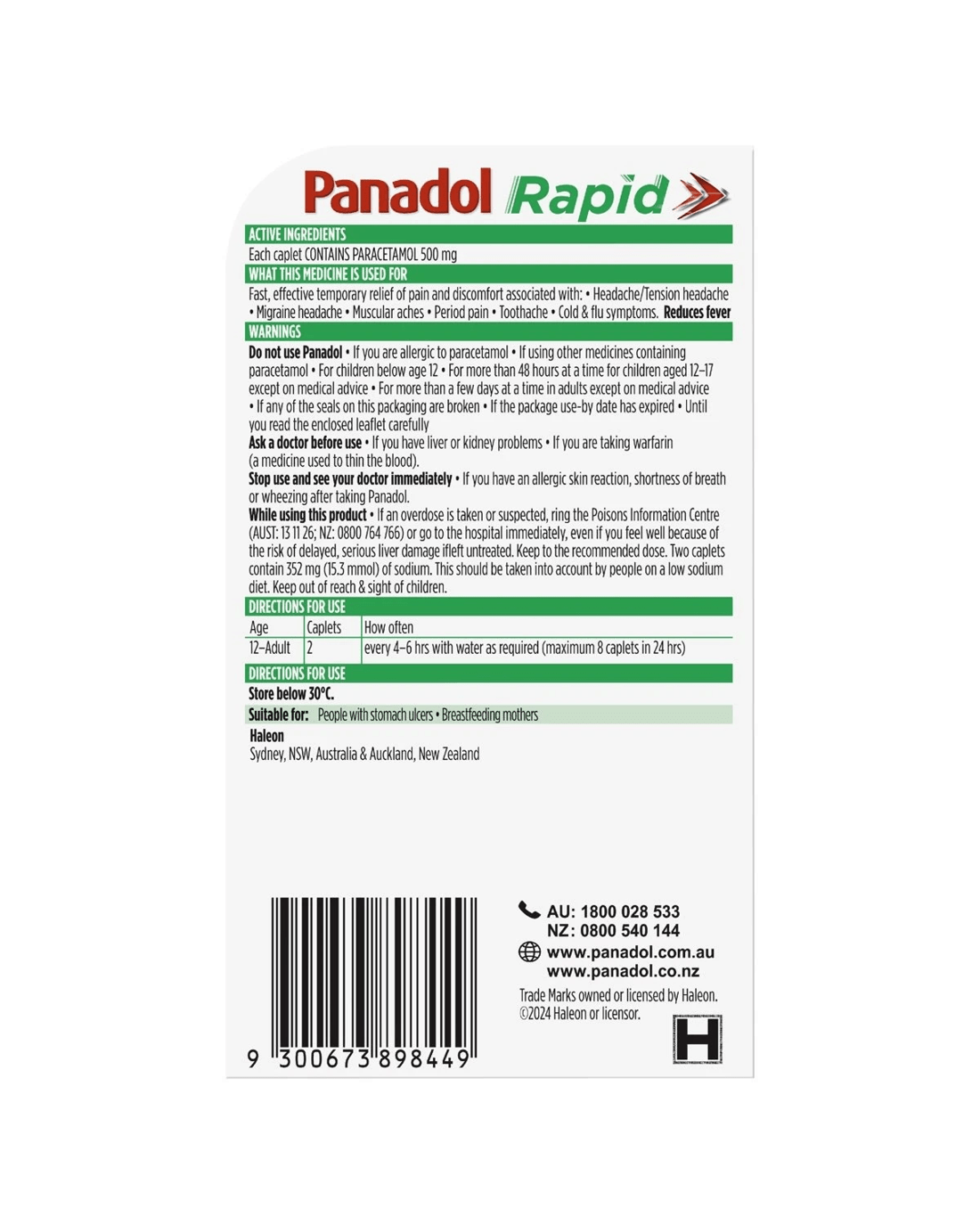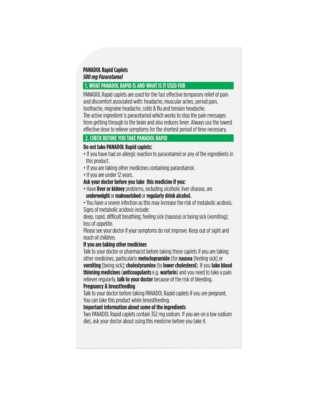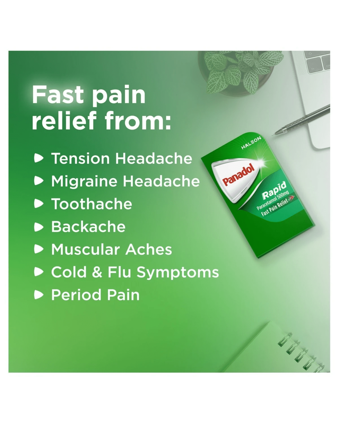 Panadol Rapid Paracetamol 500mg is a fast, effective temporary relief of pain and discomfort associated with headache/tension headache, migraine headache, muscular aches, period pain, toothache, cold and flu symptoms. Reduces fever.