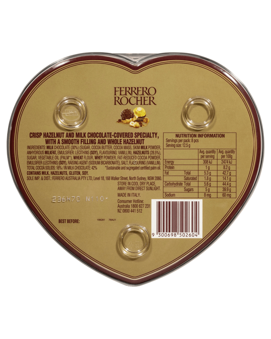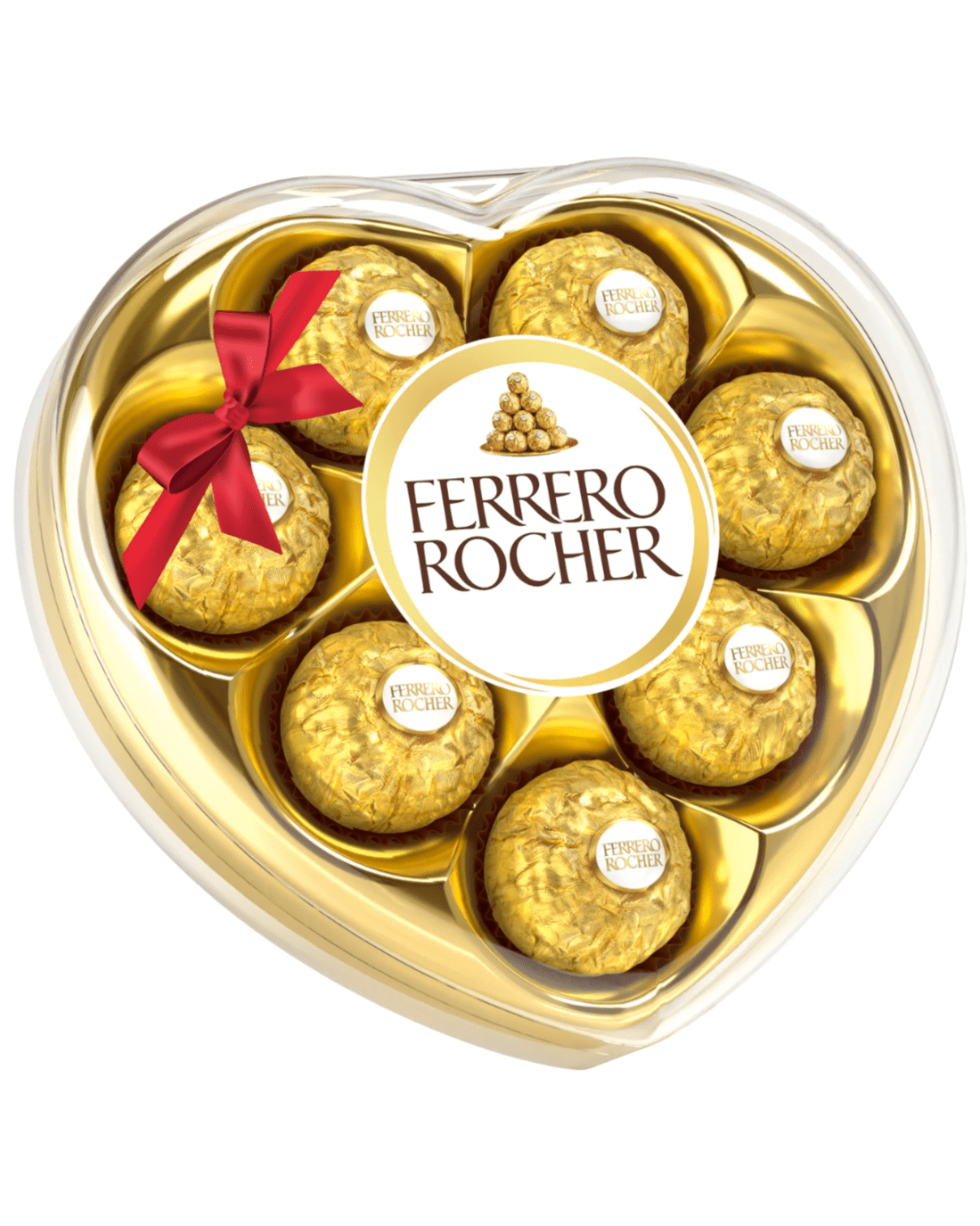 8 delicious Ferrero Rocher pralines in a transparent, heart shaped box ideal as a gift to your loved one or to show your appreciation.