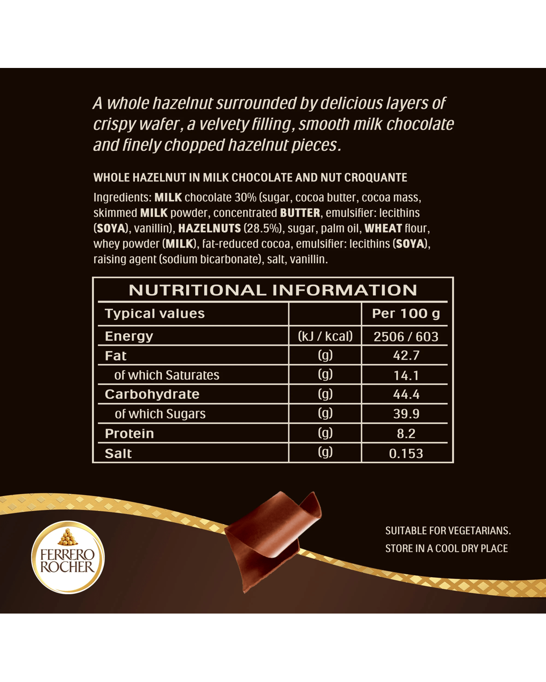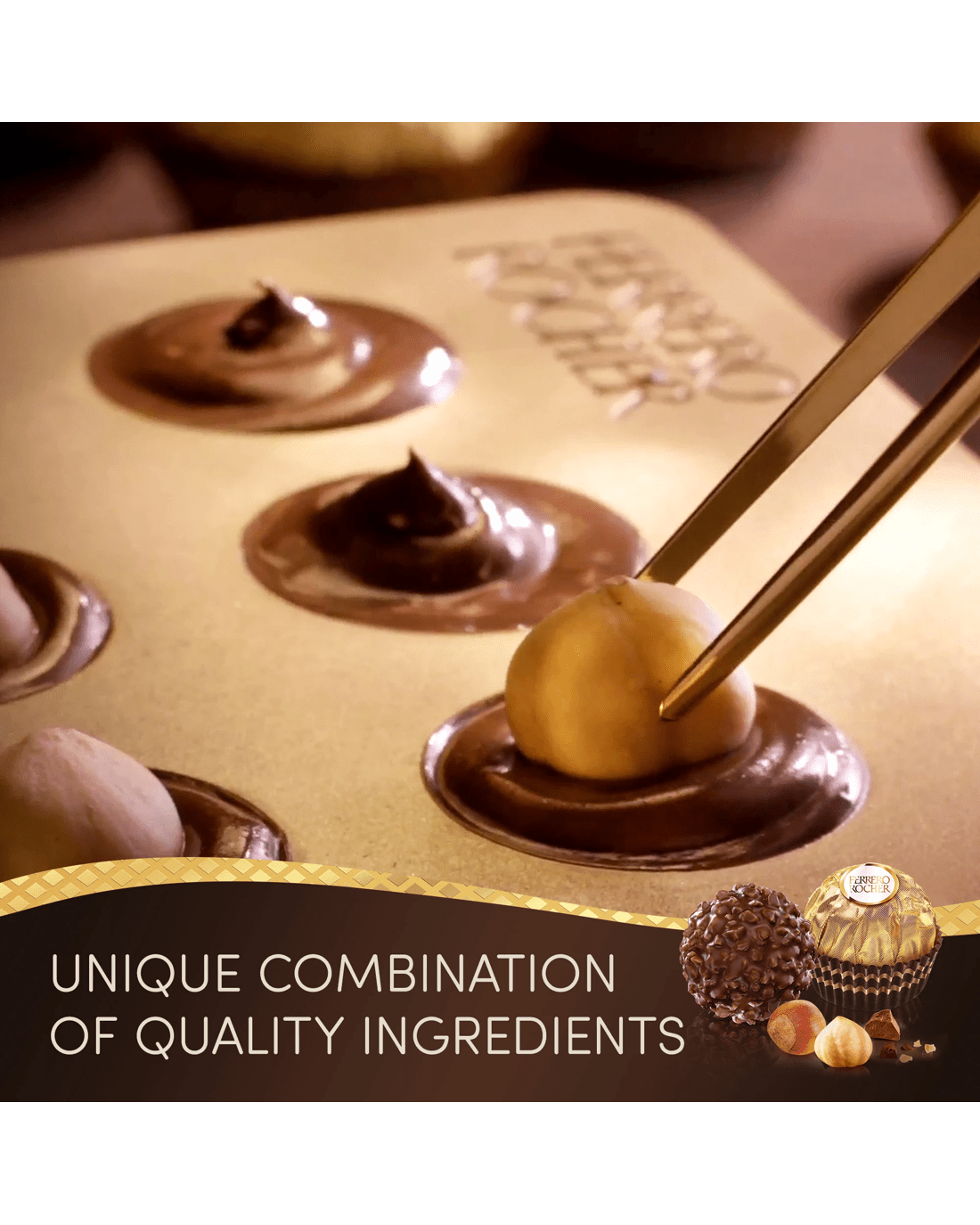 Each Ferrero Rocher has a stylish golden wrapper and paper cup that makes it even more special. Always presented in an elegant box.