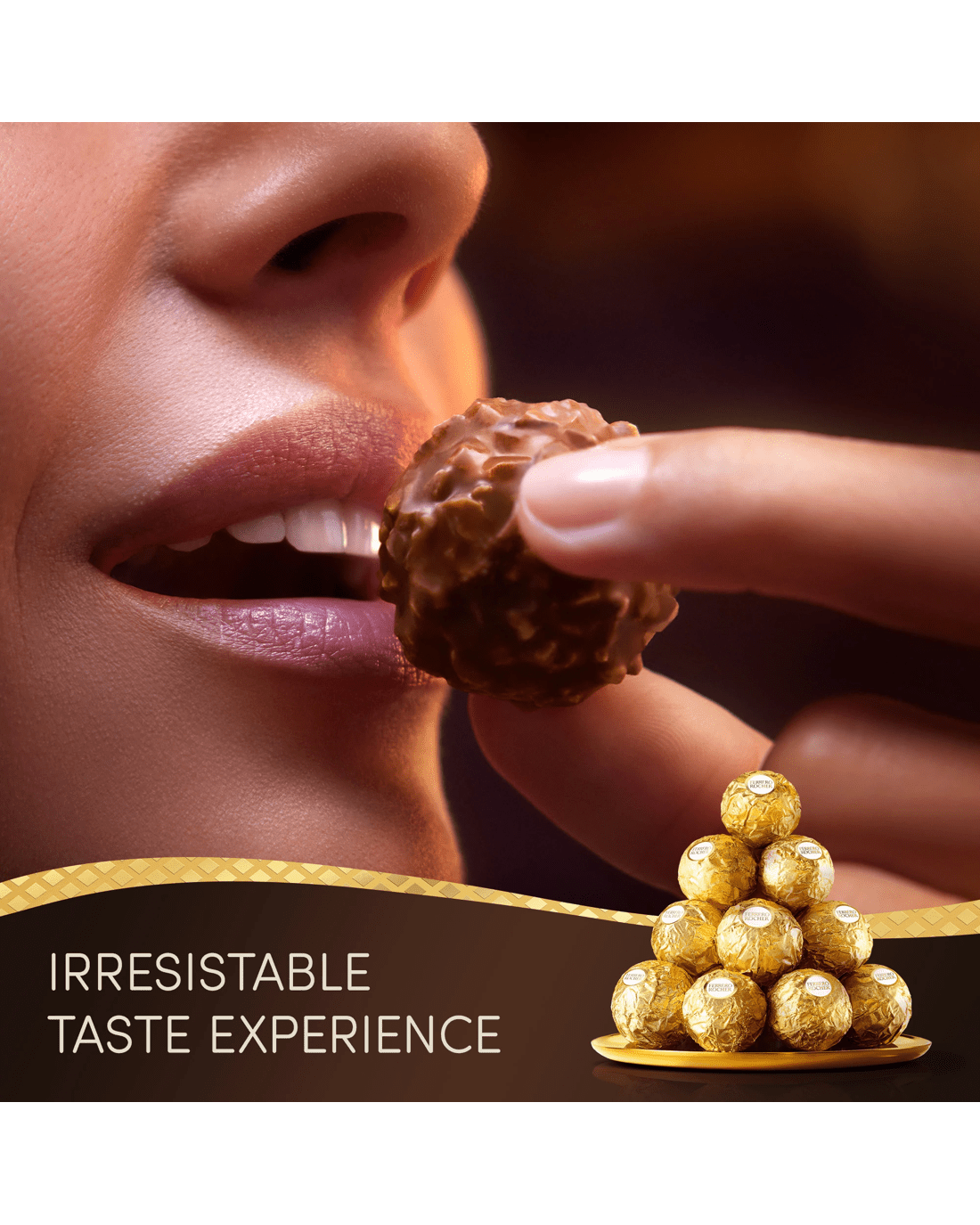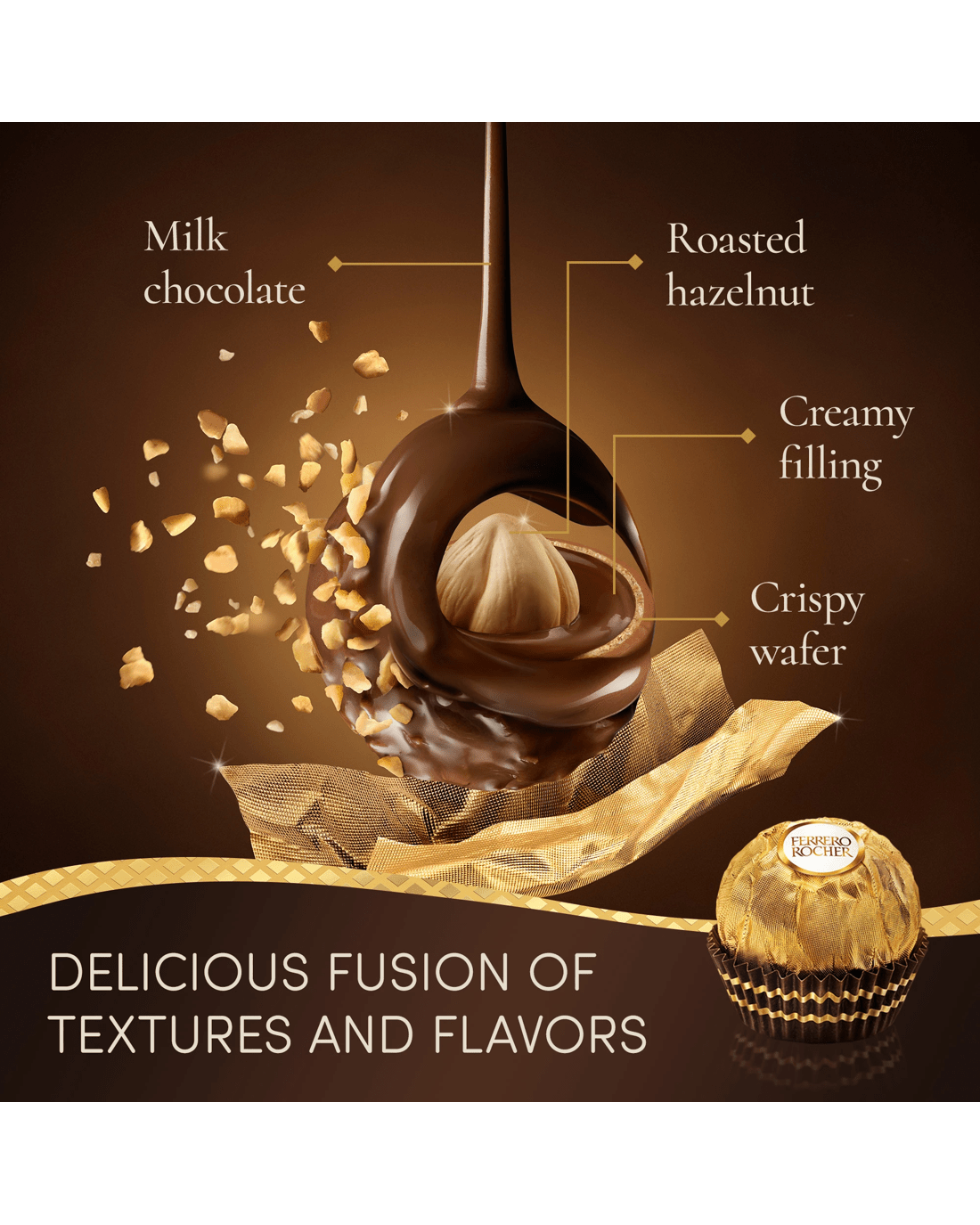 A tempting combination made of a whole crunchy hazelnut in the centre, a delicious creamy chocolate hazelnut filling, a crisp wafer shell covered with chocolate and gently roasted hazelnut pieces.