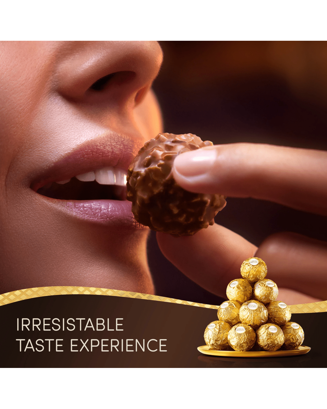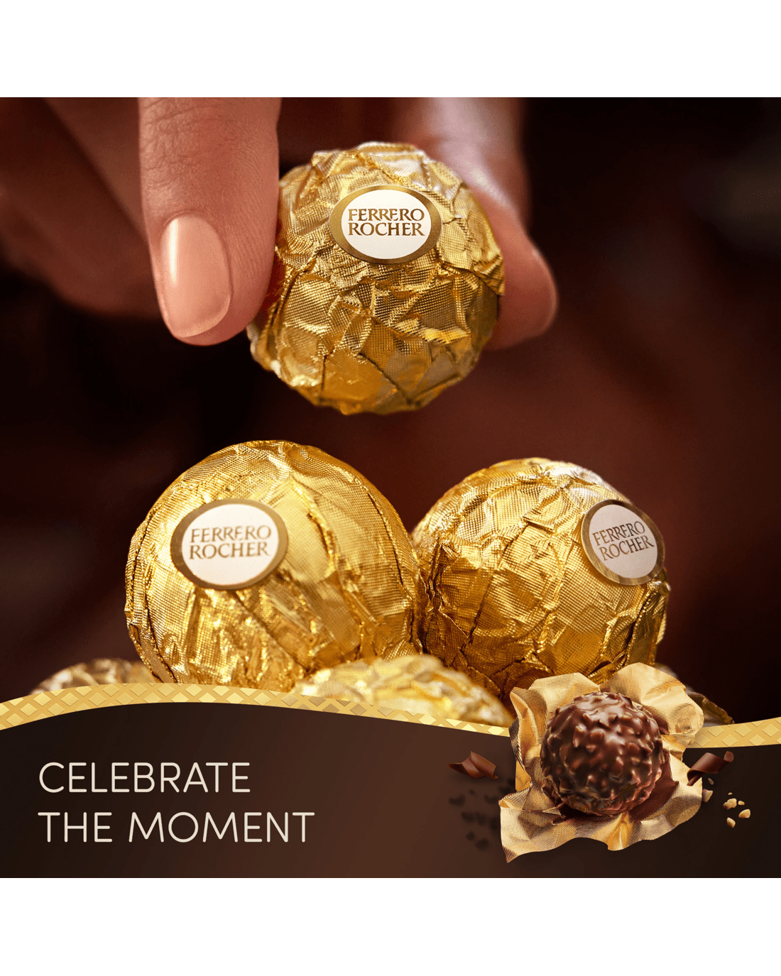 Each Ferrero Rocher has a stylish golden wrapper and paper cup that makes it even more special. Always presented in an elegant box.