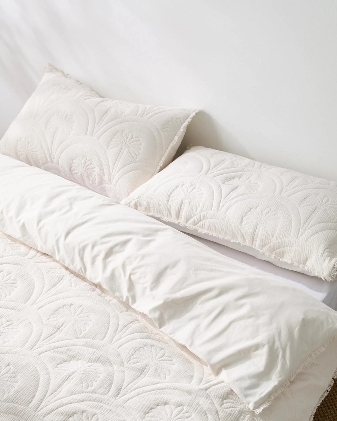 Sink into relaxation every night with the Palm Quilted Australian Cotton Quilt Cover Set. Made from soft Australian cotton and featuring gentle quilting, this set provides a delightful sense of comfort each time you slip into bed. The palm-patterned stitching and playful fringe detail add a cheerful touch to your room’s atmosphere. Easy to look after and including both a quilt cover and two matching pillowcases, this set makes it simple to refresh your space or surprise someone you care about. Bring a light, welcoming feel to your bedroom and enjoy bedtime even more with this inviting bedding set.