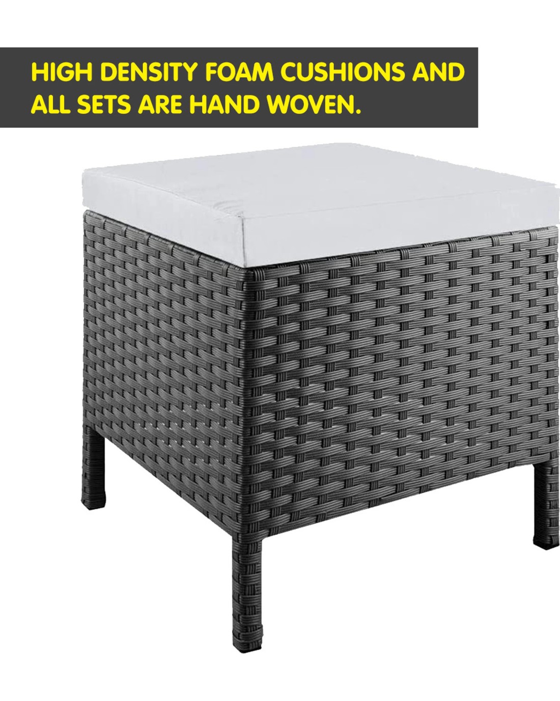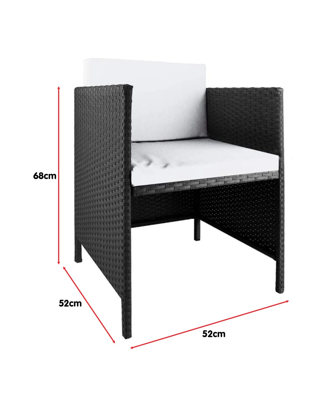 The black-and-white design is simply sophisticated - the perfect centrepiece for a chic outdoor space. This dining set comes with 4 chairs and 4 ottomans, which can be stored right under the table when not in use. Whether you want to enjoy an al fresco breakfast or you're hosting a dinner for all your friends, this outdoor furniture set provides a beautiful setting. After use, simply wipe the glass tabletop clean.