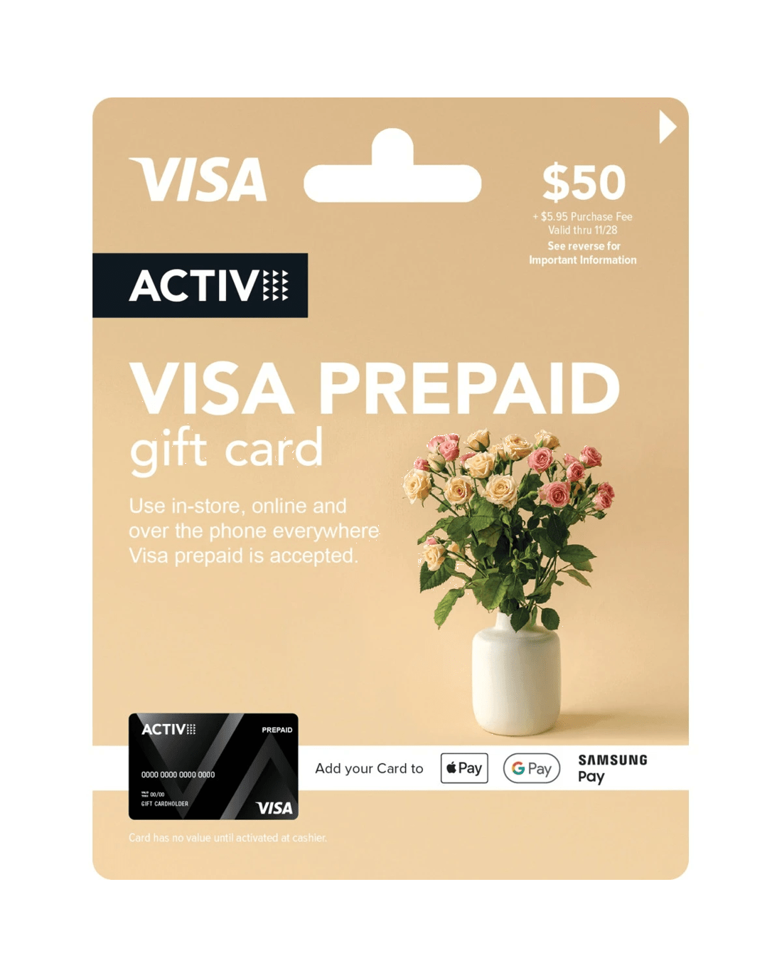 The Activ VISA Gift Card is the perfect way to say 'Happy Birthday', 'Congratulations', 'Thank You' and many more. This card can be used in-store (When added to mobile wallet) online, over the phone or for mail orders where VISA prepaid is accepted. Use your gift card as many times as you would like - the amount of every purchase you make is automatically deducted from your available balance.
