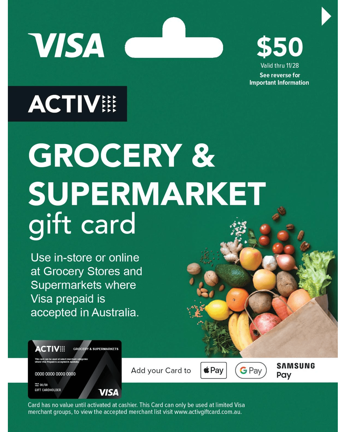 - Use in-store or online at grocery stores and supermarkets where VISA prepaid is accepted in Australia