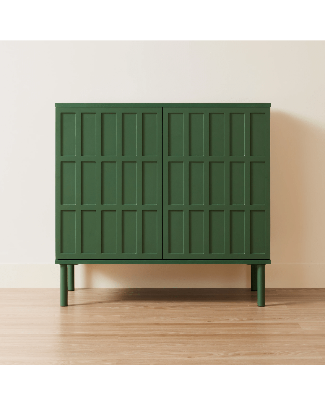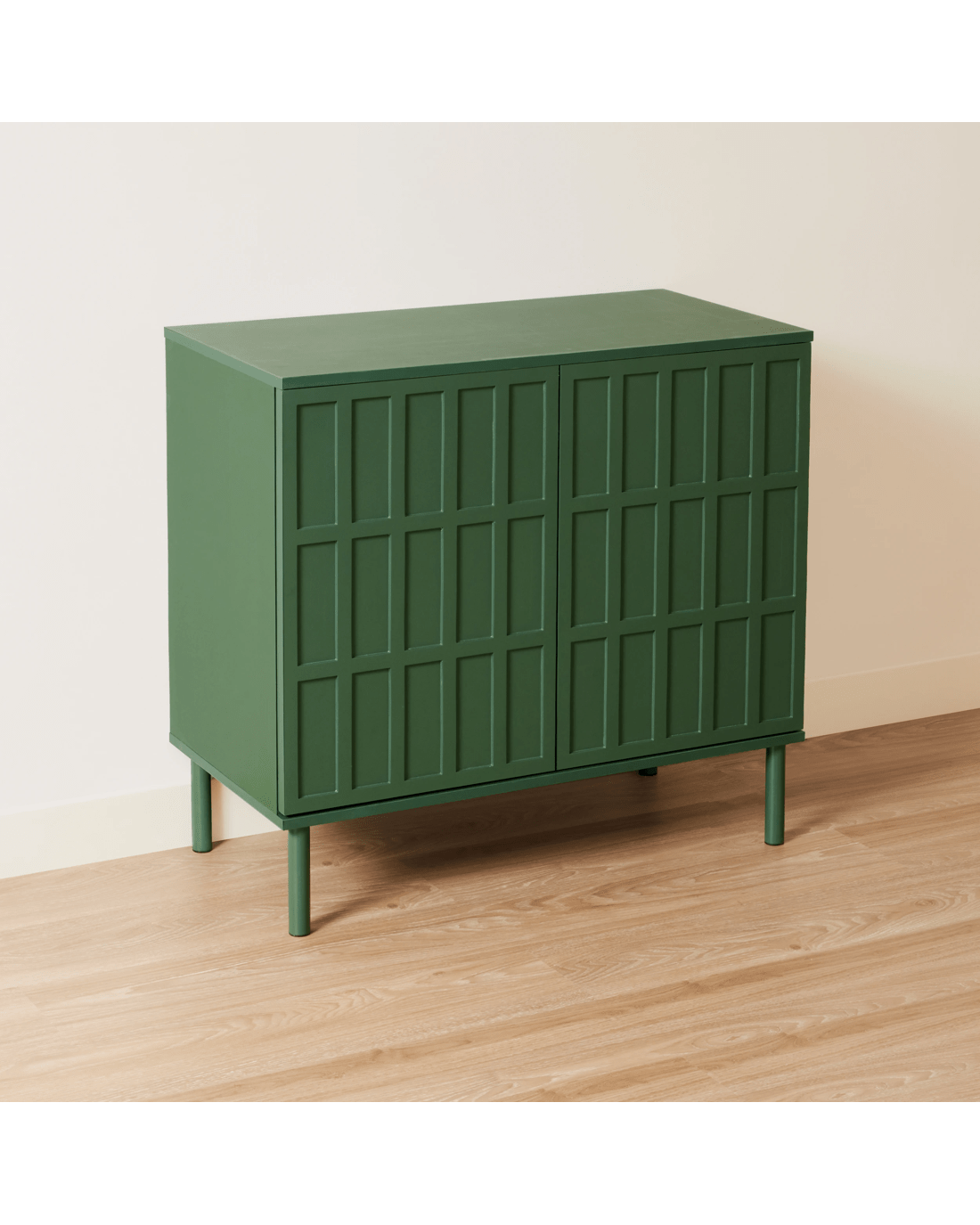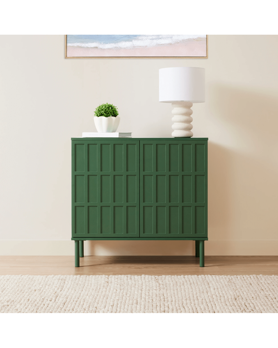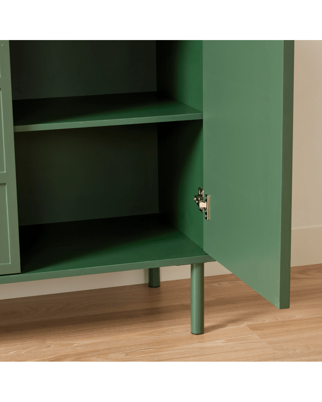 Behind its doors, the cabinet features spacious shelving to help keep your belongings organised and out of sight. The top surface provides room for displaying decorative pieces, photos or plants. Both practical and stylish, the Adrian Cabinet is ideal for living rooms, bedrooms or entryways.