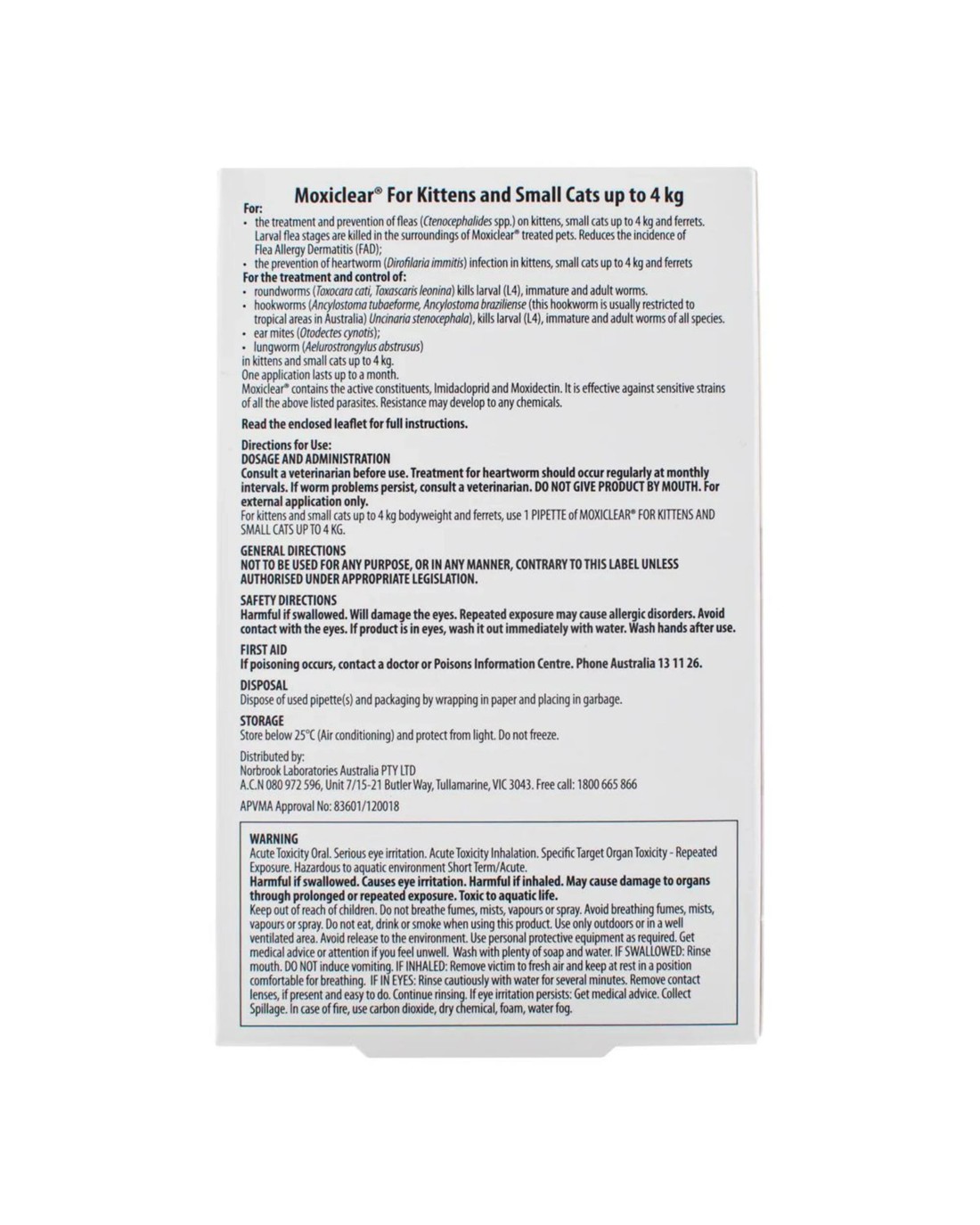 Moxiclear’s combination of Moxidectin and Imidacloprid has been shown to be safe in kittens when given from 9 weeks of age.