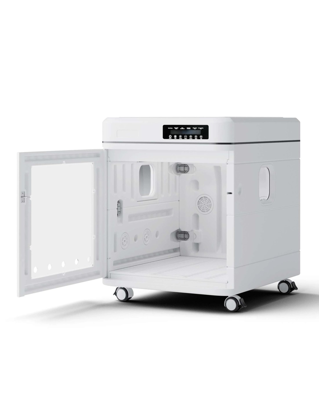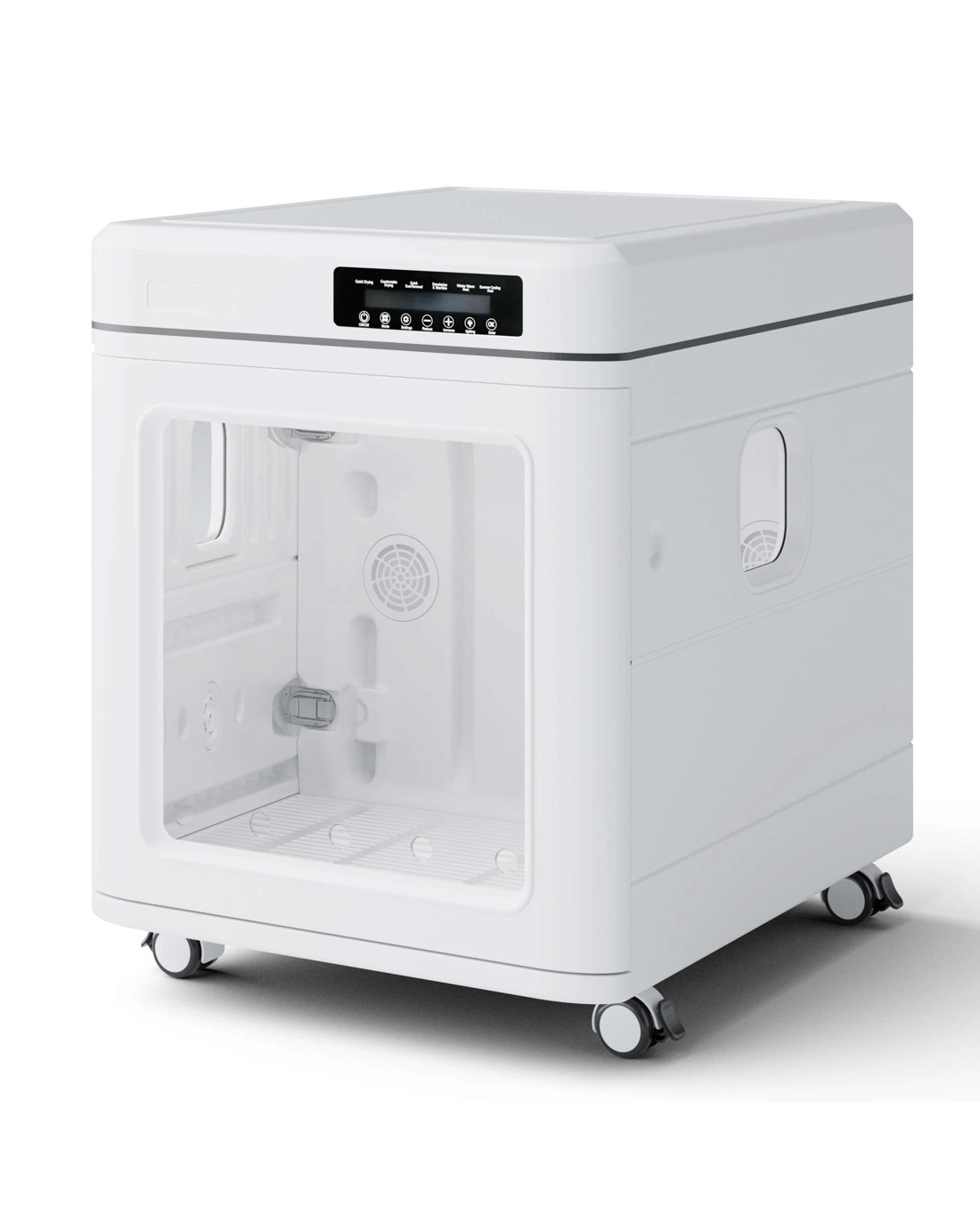 Make pet grooming faster, easier, and more comfortable with this All-in-One Pet Dryer and Care Station. Designed with a powerful turbo fan and innovative 5-sided airflow system, it delivers fast and even drying for thick or hard-to-reach fur. Beyond drying, it helps remove dust, eliminate odors, and release high-concentration negative ions to support a cleaner, healthier coat. The smart touch control panel allows you to easily adjust wind speed, temperature, and drying time for a customized grooming experience. With a spacious interior, foldable design, and smooth rolling wheels, this pet dryer box is a convenient and professional solution for home pet care.
