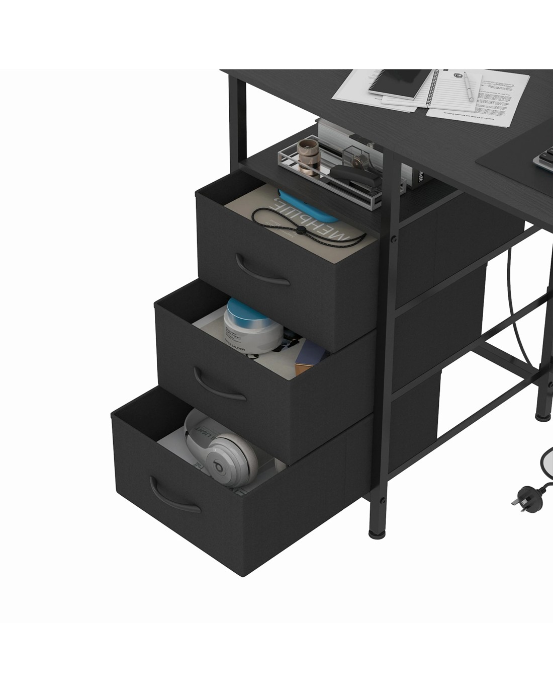 Featuring 2 AC outlets and 2 USB ports, it ensures your devices stay charged while keeping the workspace neat. The reversible design allows drawers to be installed on either side, offering flexibility to fit any space. With 3 spacious fabric drawers, a raised monitor shelf, and a sturdy metal frame with a particle board top, the office desk provides durability, ample storage, ergonomic comfort, and easy assembly for everyday use.