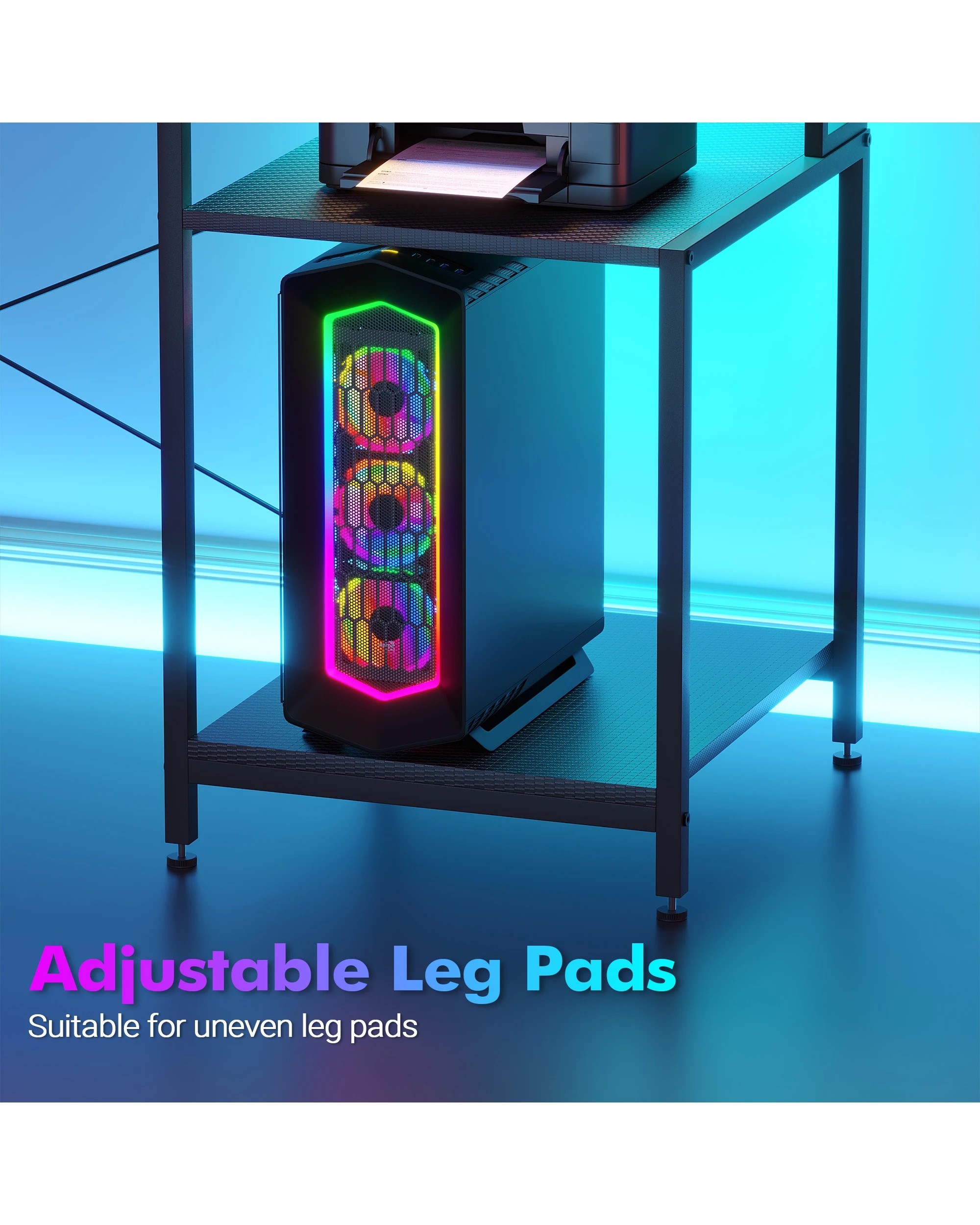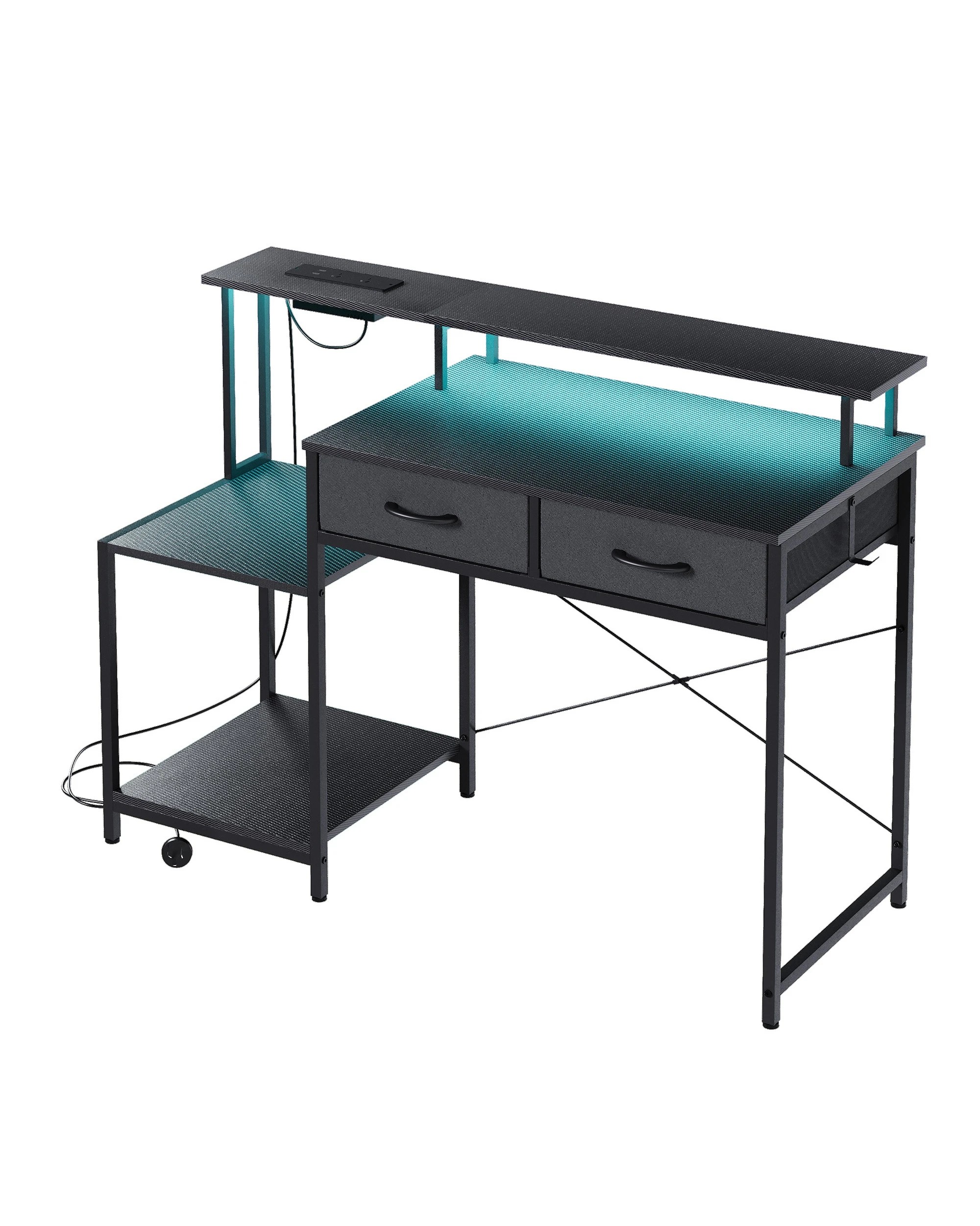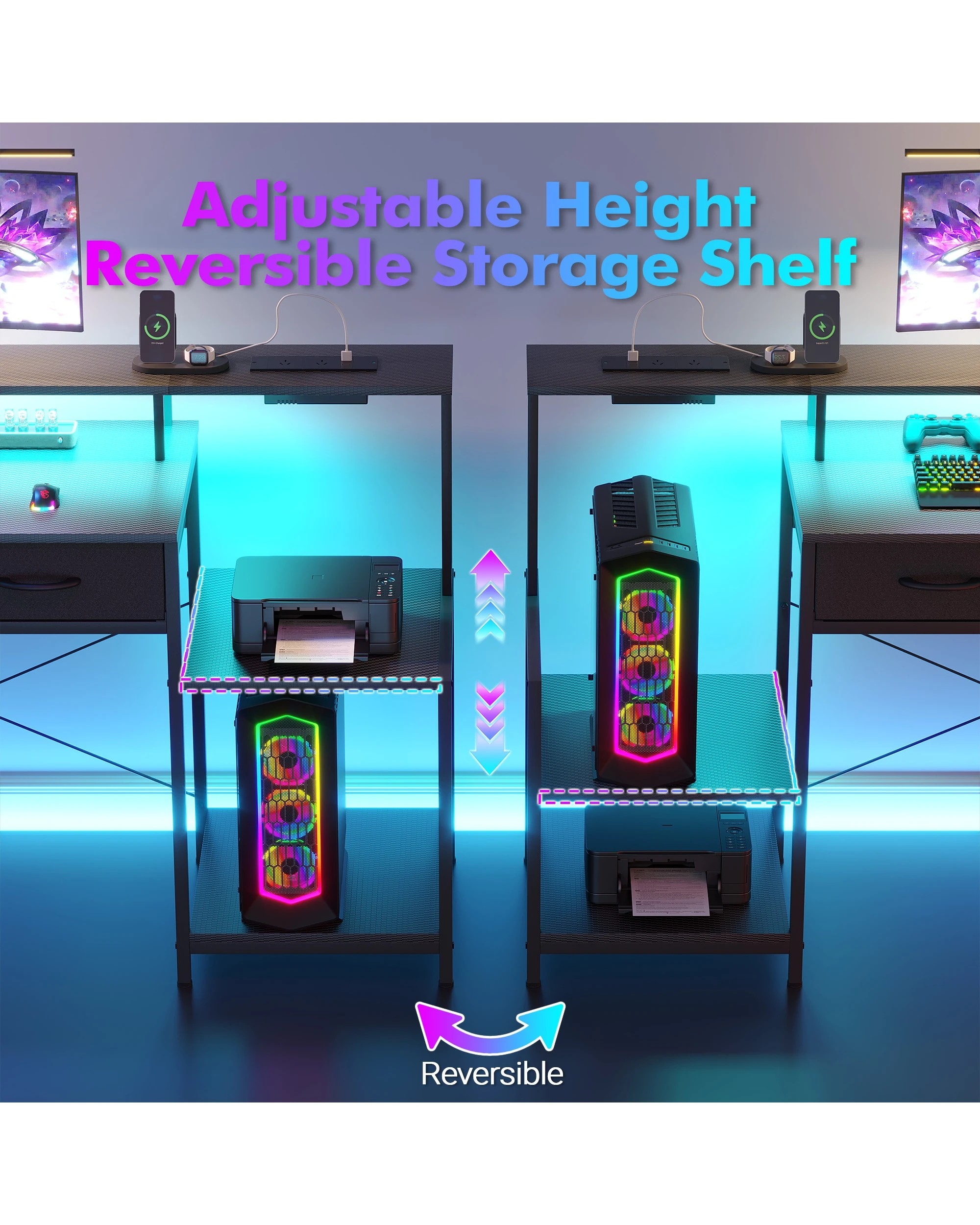 Advwin 120cm Computer Gaming Desk With Led Lights Power Outlets Reversible Printer Storage Shelf Black