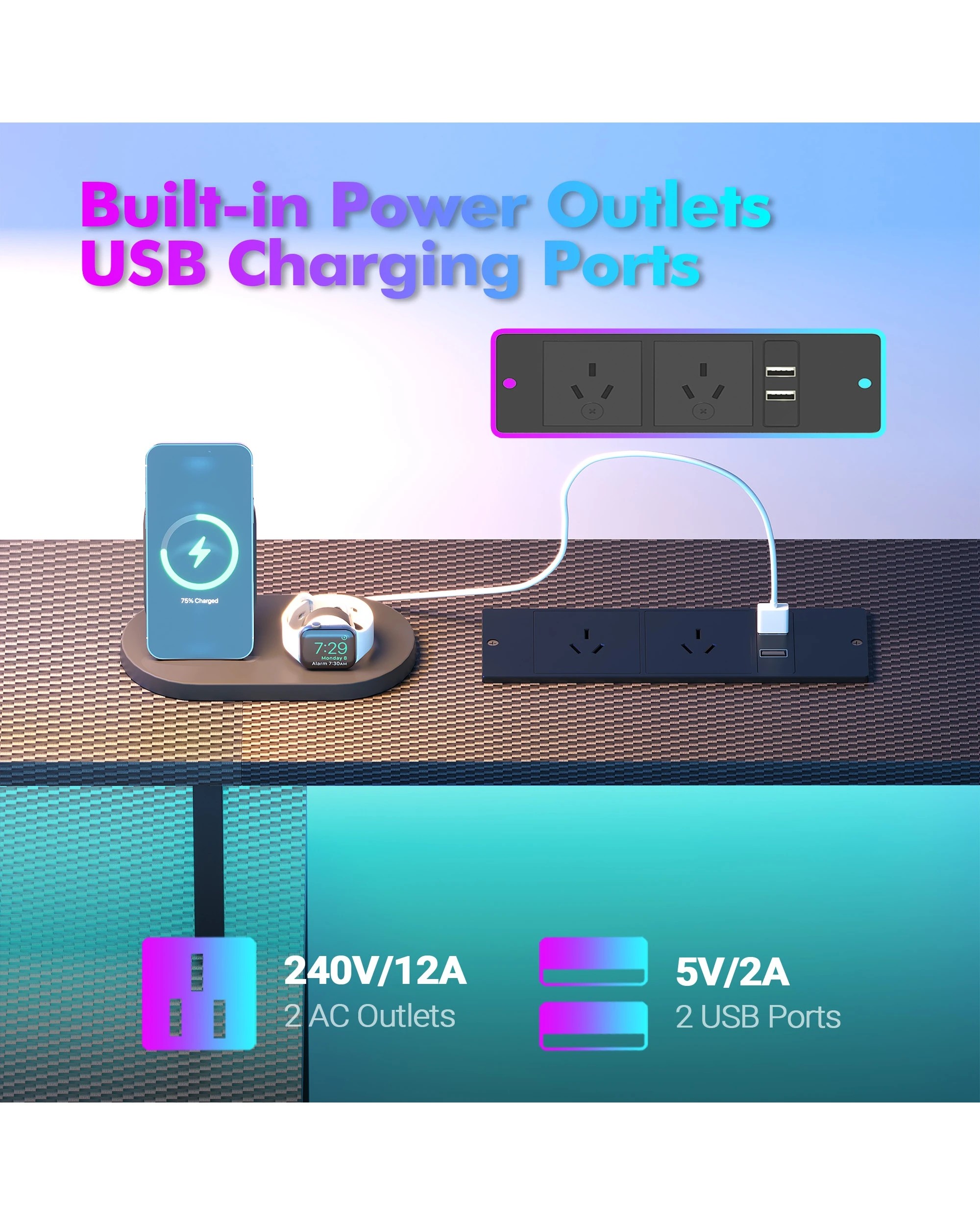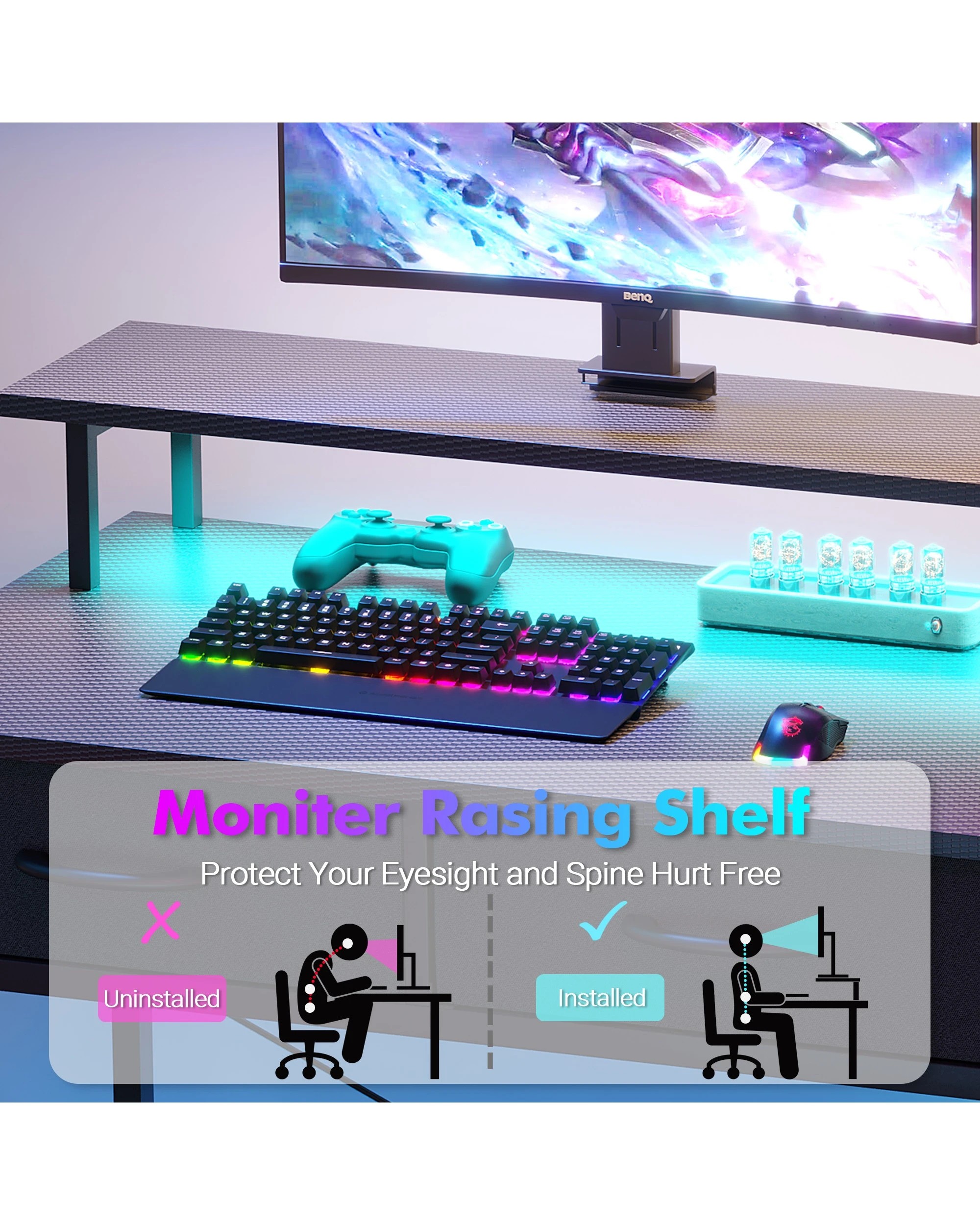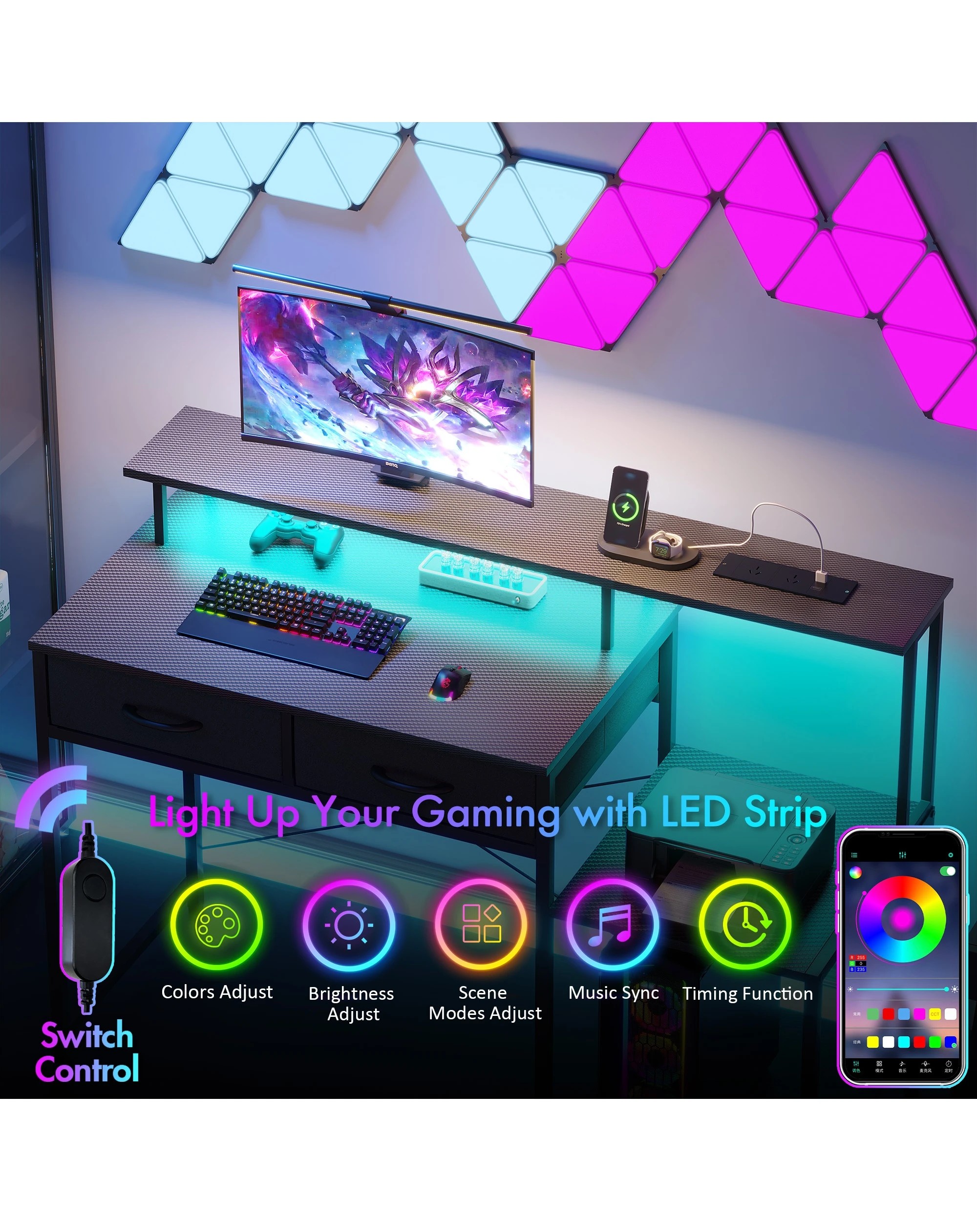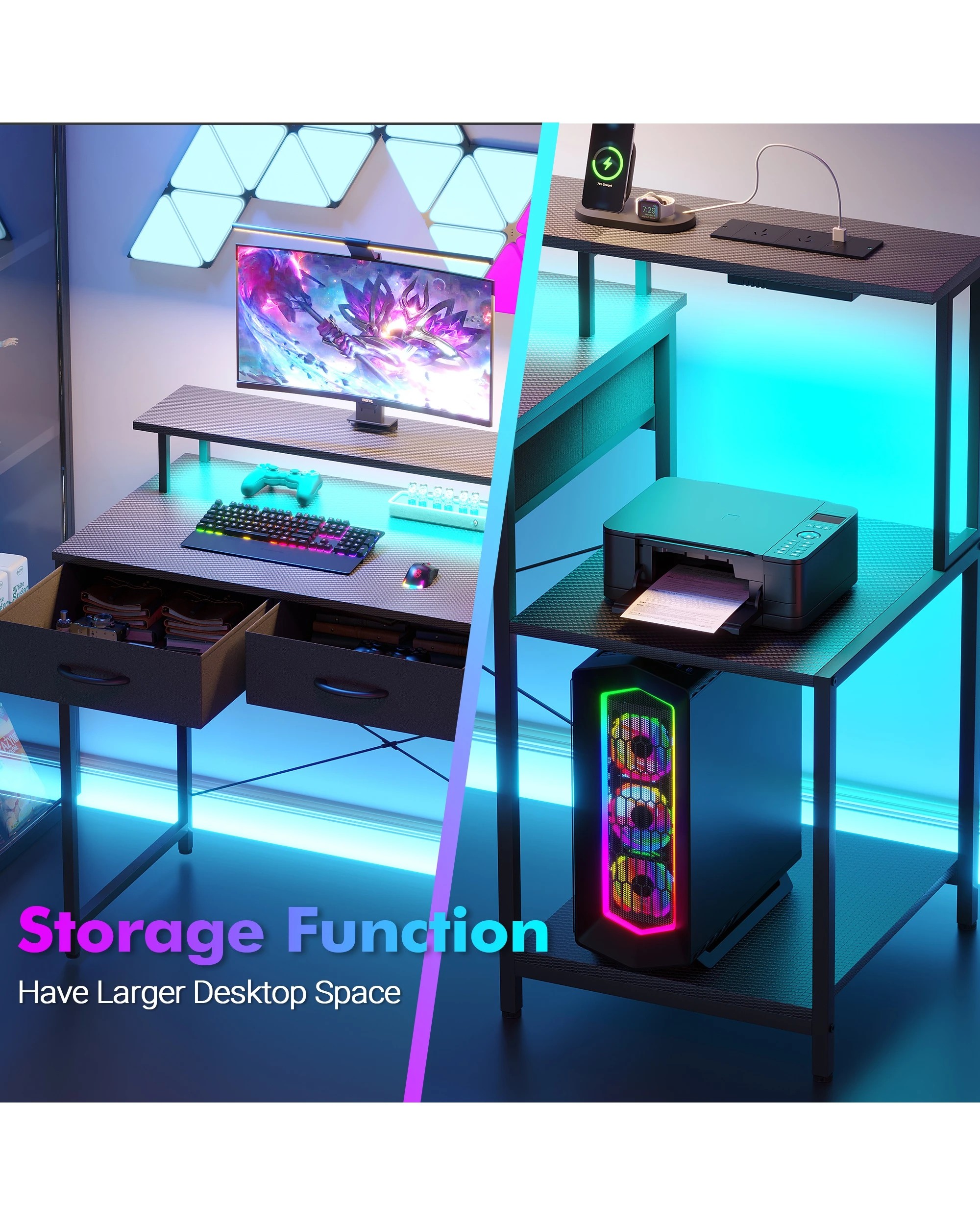 Advwin 120cm Computer Gaming Desk With Led Lights Power Outlets Reversible Printer Storage Shelf Black