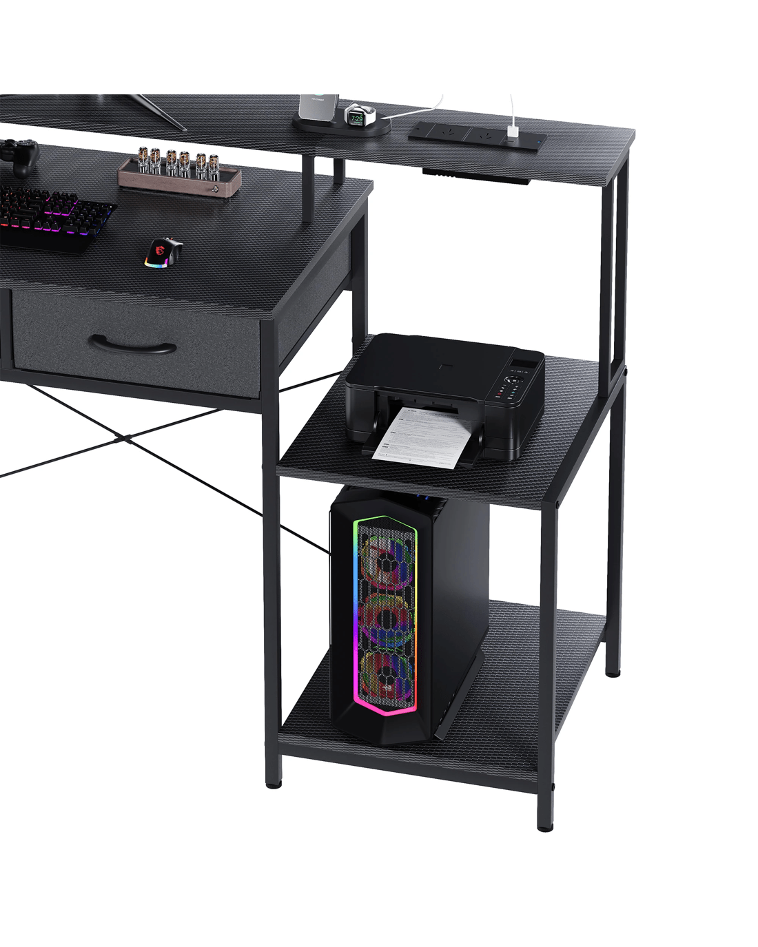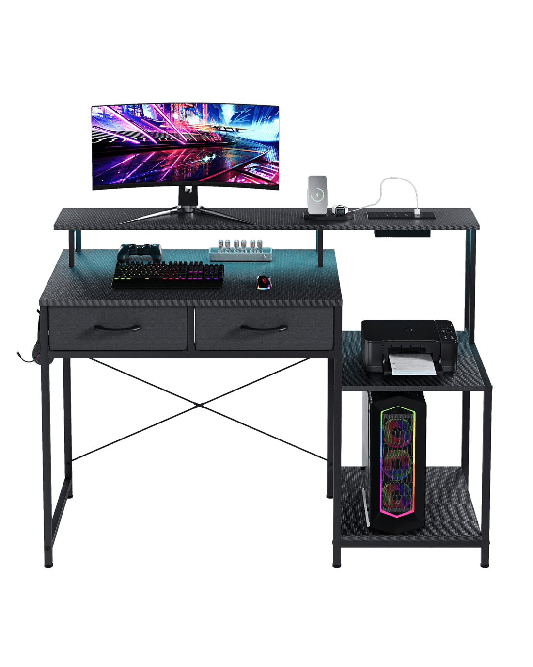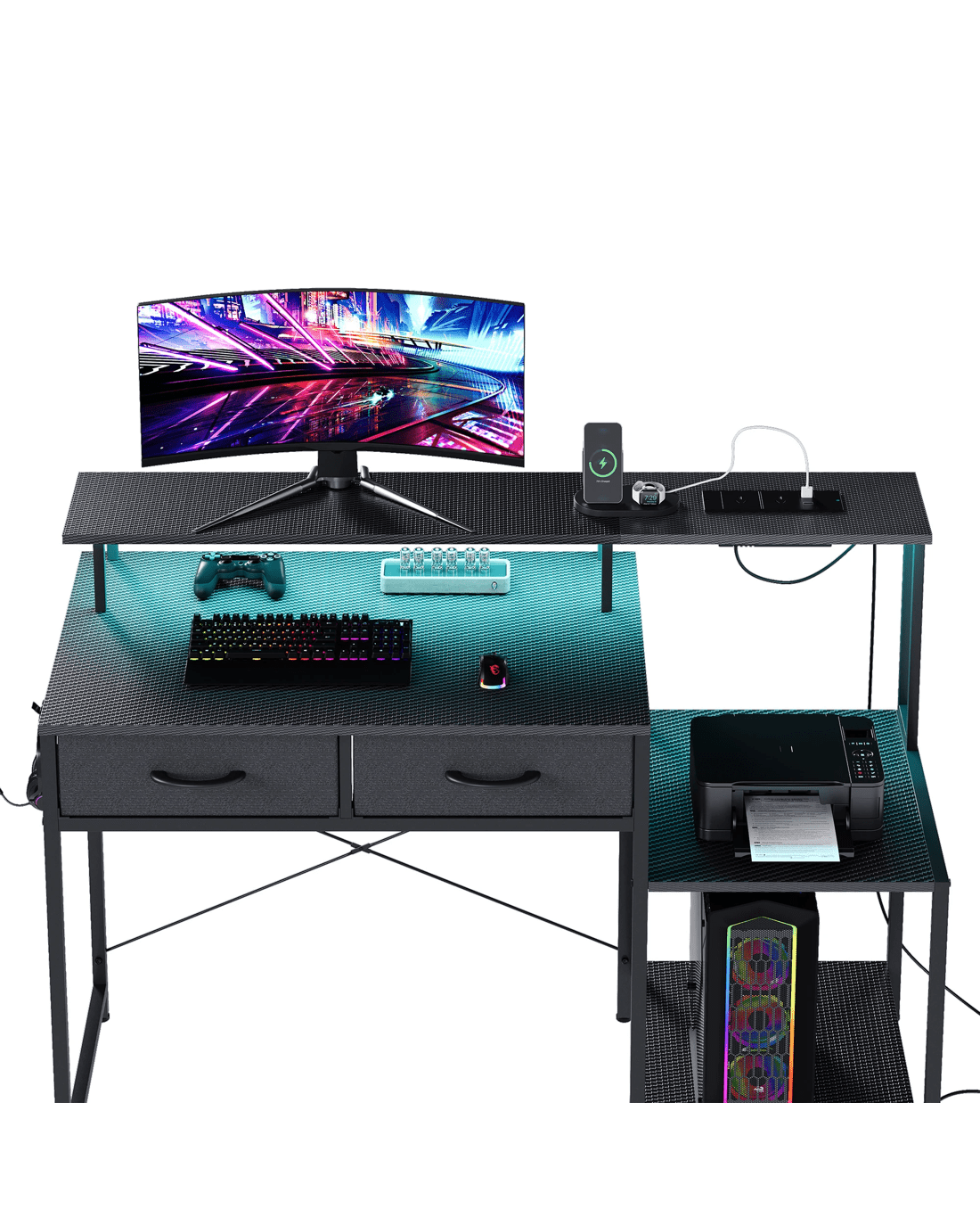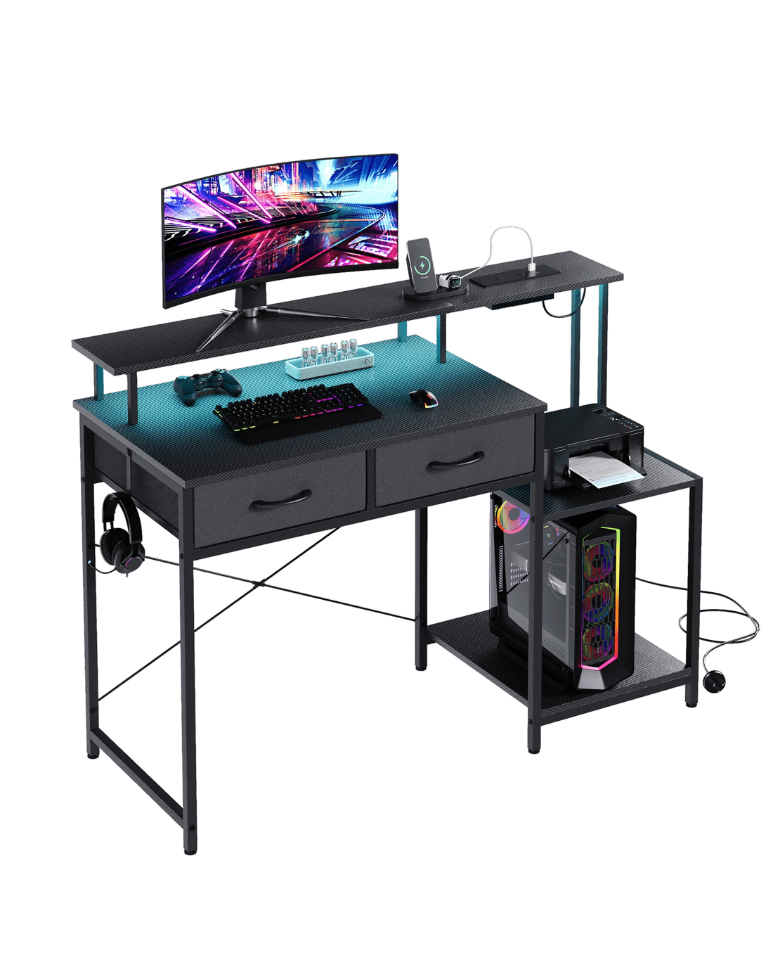 The integrated LED lights add an immersive ambiance, while the built-in power outlets and USB ports ensure your devices are always charged and ready. Perfect for gamers, workers, and professionals, this desk features built-in drawers and printer storage, blending practicality with sleek design.