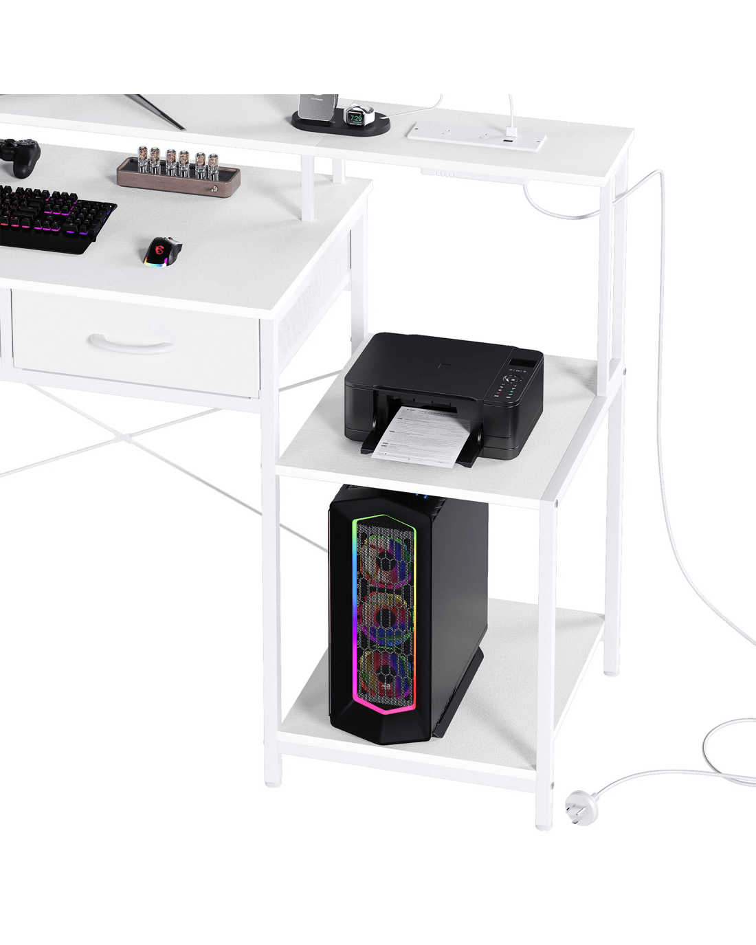The integrated LED lights add an immersive ambiance, while the built-in power outlets and USB ports ensure your devices are always charged and ready. Perfect for gamers, workers, and professionals, this desk features built-in drawers and printer storage, blending practicality with sleek design.