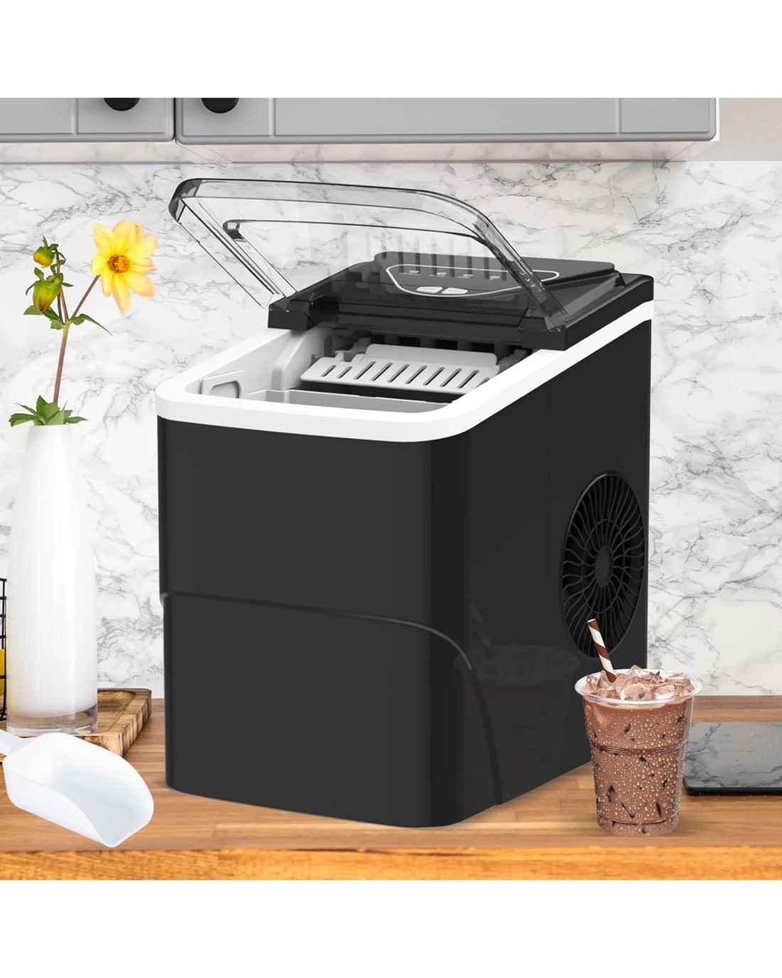 Quiet and User Friendly: When making ice cubes, the noise is lower than 35dB, similar to a working refrigerator. The transparent lid allows you to monitor the ice capacity. The sensor automatically detects when ice is full and stops producing to prevent overflowing.