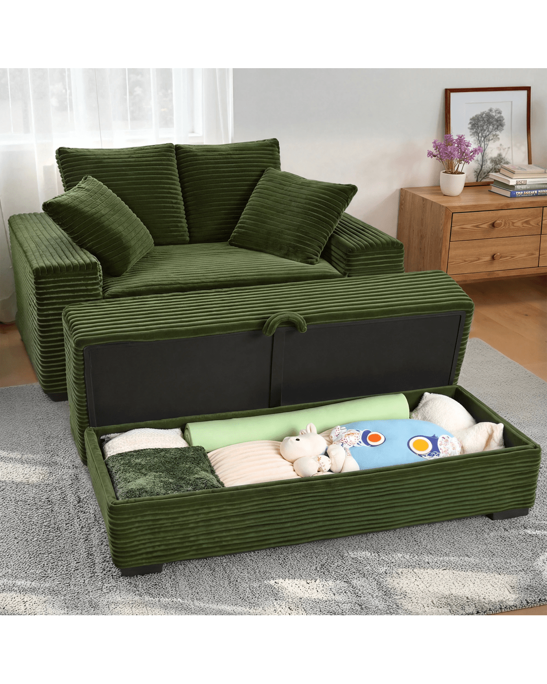 Sold by AdvwinAdvwin 146cm Chaise Lounge Chair with Storage Ottoman Fluffy Upholstered Sofa Bed - Green