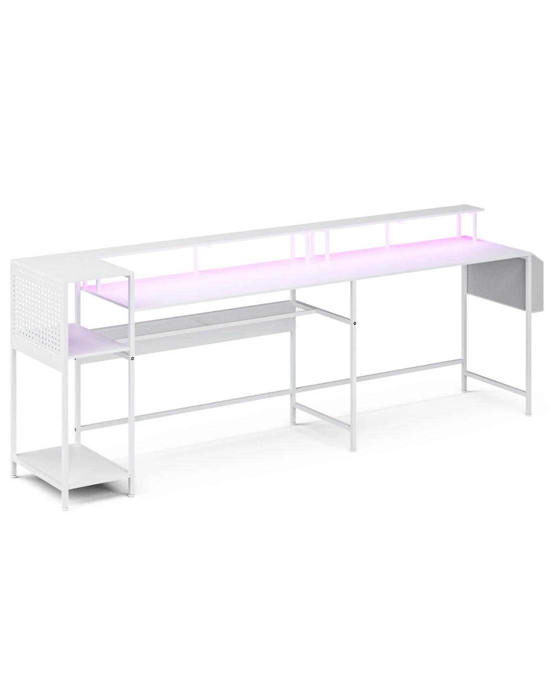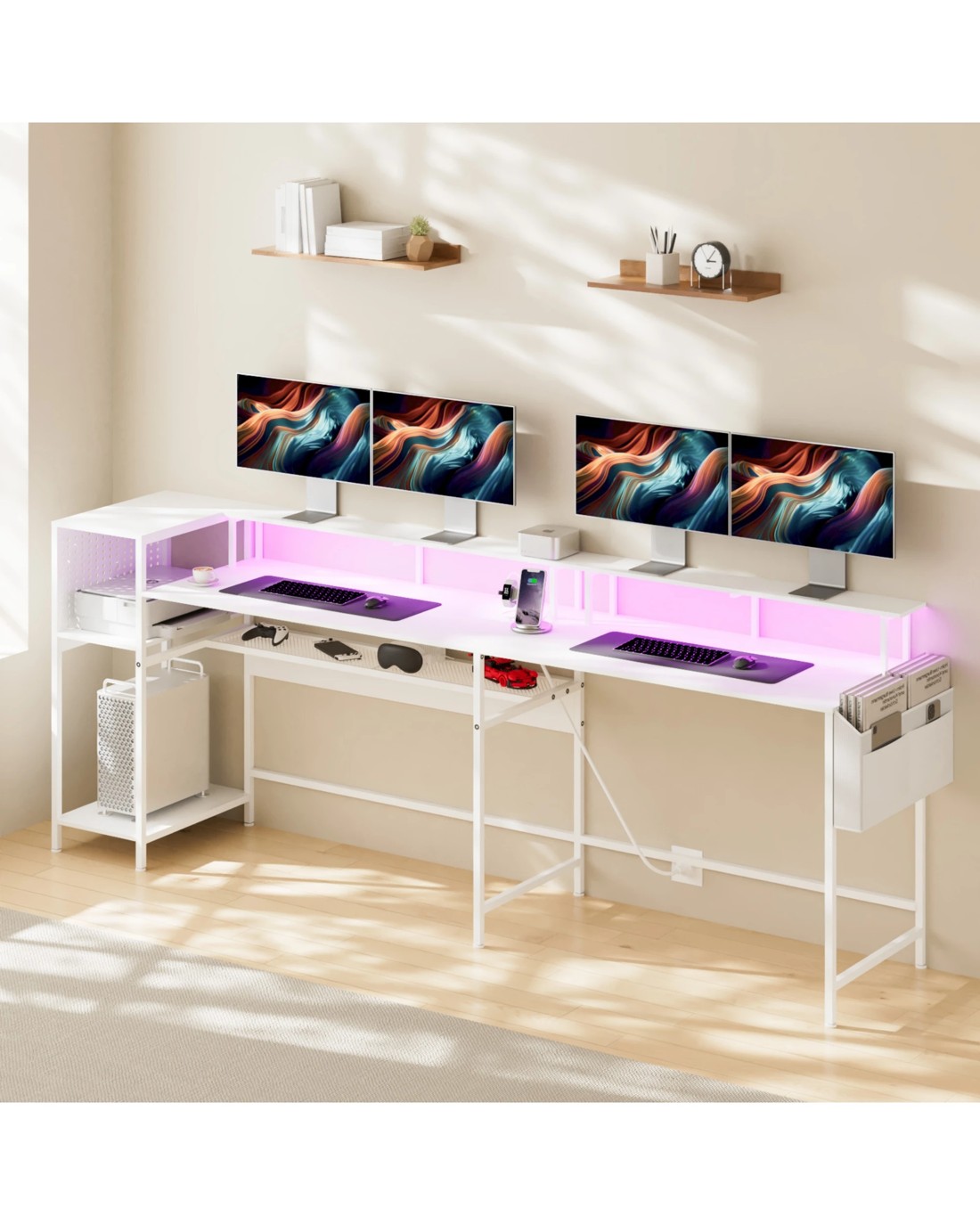 Integrated LED lighting creates an immersive atmosphere, while built-in power outlets, USB, and Type-C ports ensure your devices are always charged and ready to go. This stylish and practical all-in-one corner desk will elevate your workspace or gaming experience.