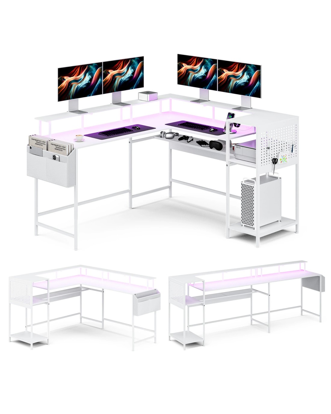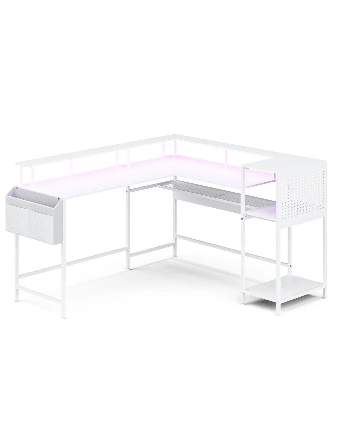 Introducing the ultimate gaming and productivity hub: L-shaped gaming desk equipped with LED lighting, power outlets, a monitor stand lift and a pegboard. This versatile desk seamlessly blends modern aesthetics with practical functionality.