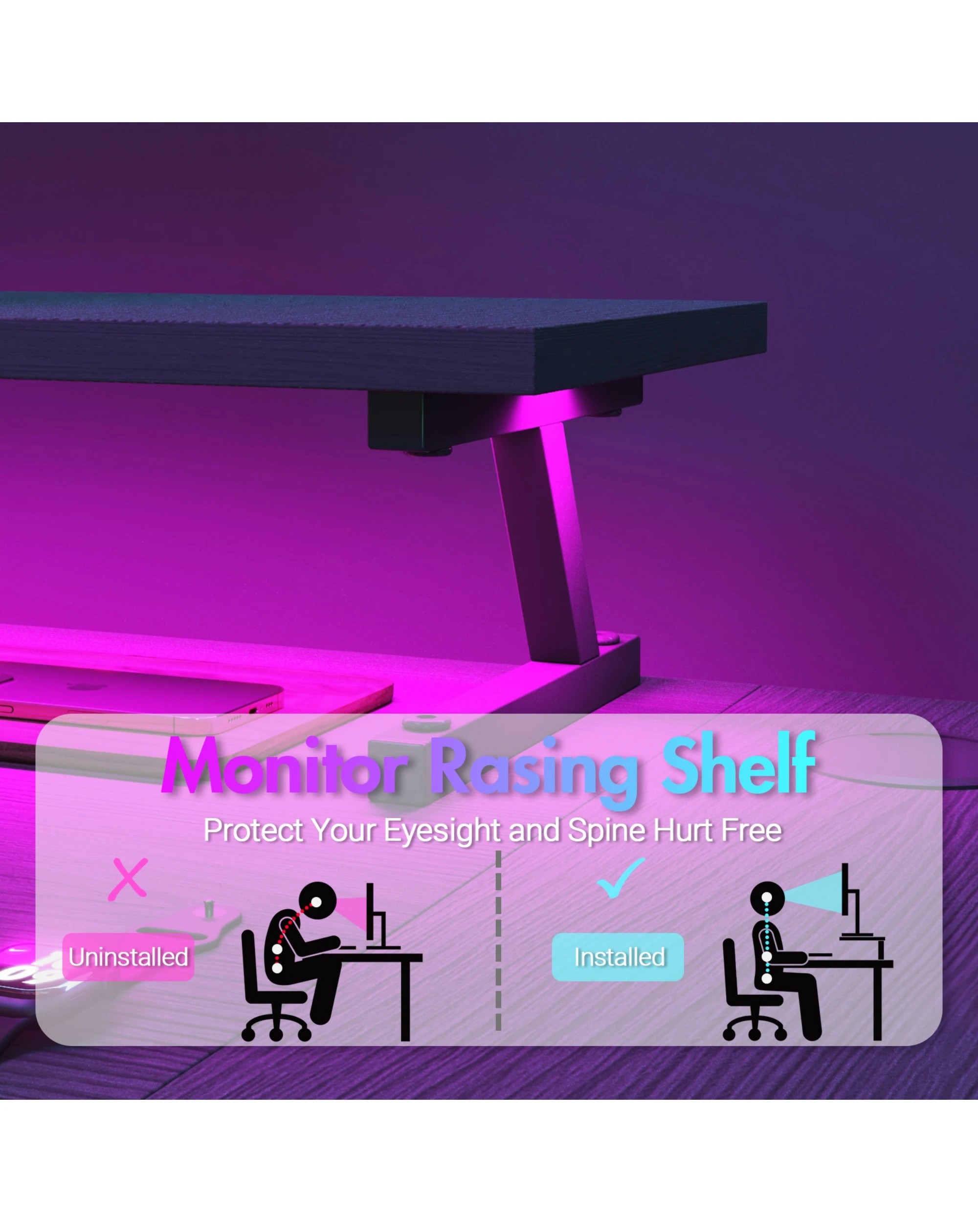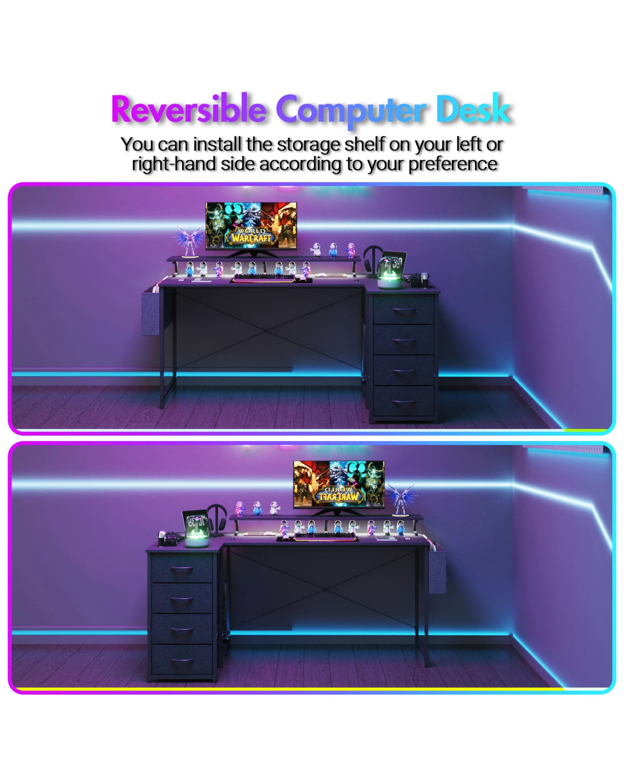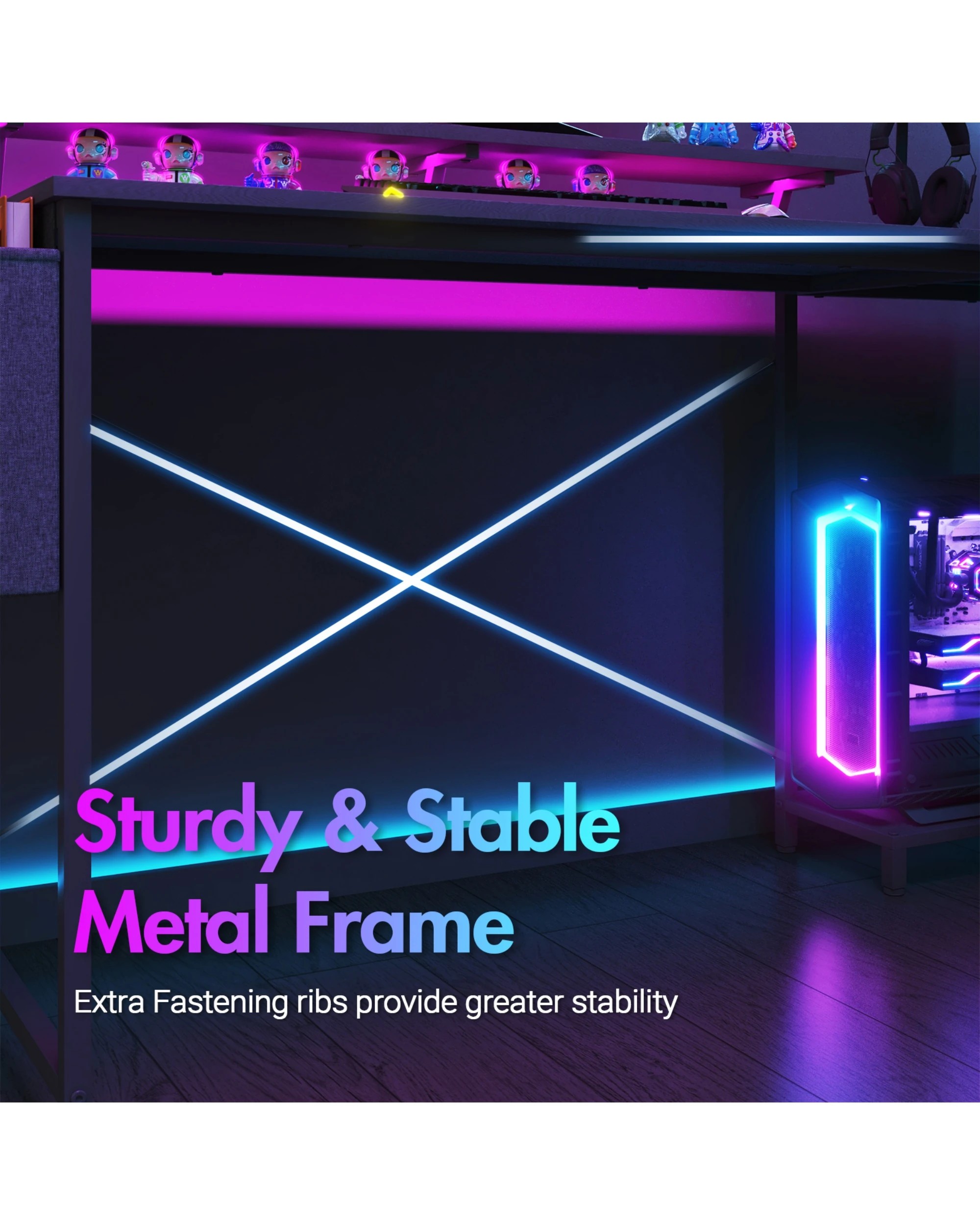 Advwin 160cm Black L Shaped Gaming Desk With Led Lights & Power Outlets Convertible Computer Desk With Monitor Stand