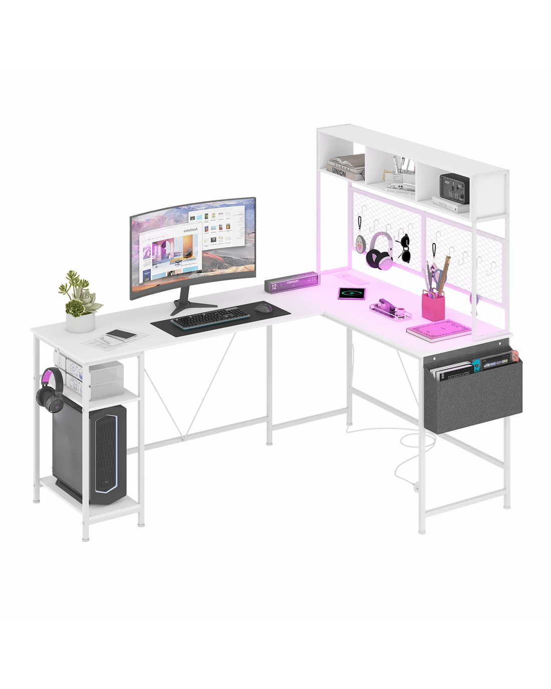 The integrated LED lights add an immersive ambiance, while the built-in power outlets and USB ports ensure your devices are always charged and ready. Elevate your workspace or gaming setup with this all-in-one corner desk designed for both style and functionality.