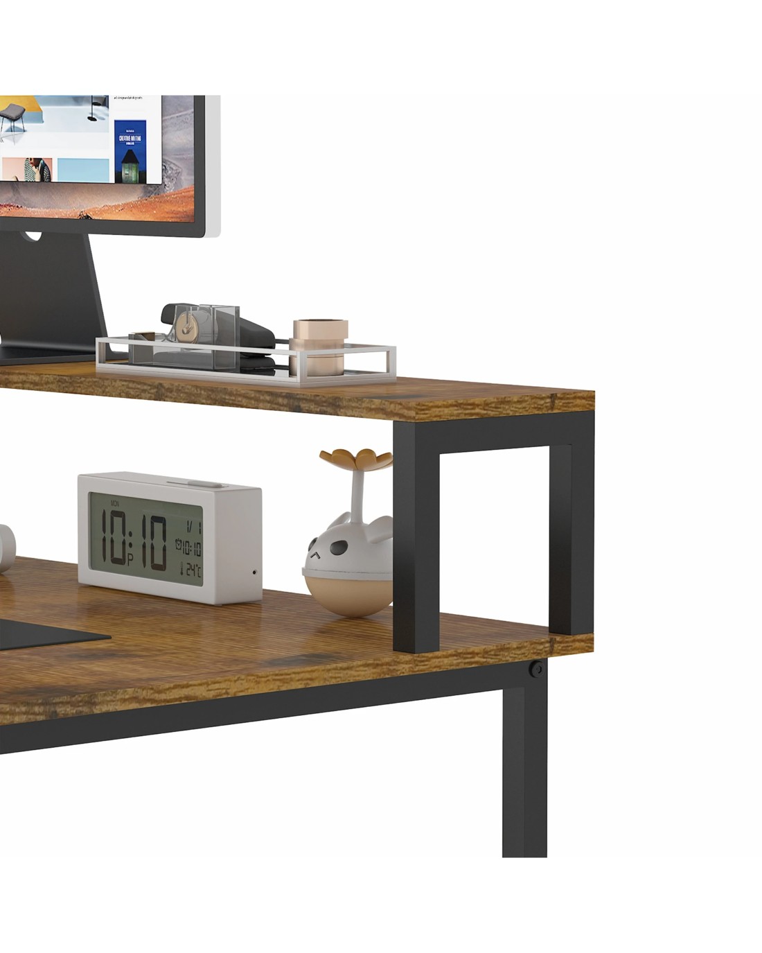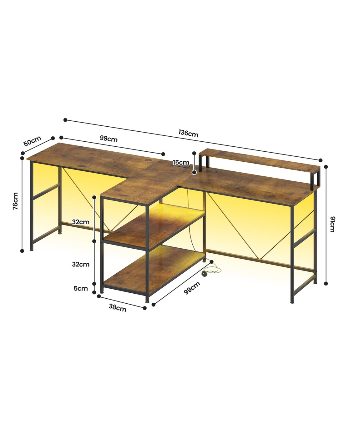 Integrated LED lighting creates an immersive atmosphere, while built-in power outlets, USB ports, and Type-C ports ensure your devices are always fully charged and ready to use. This stylish and practical double computer desk will elevate your workspace or gaming experience.