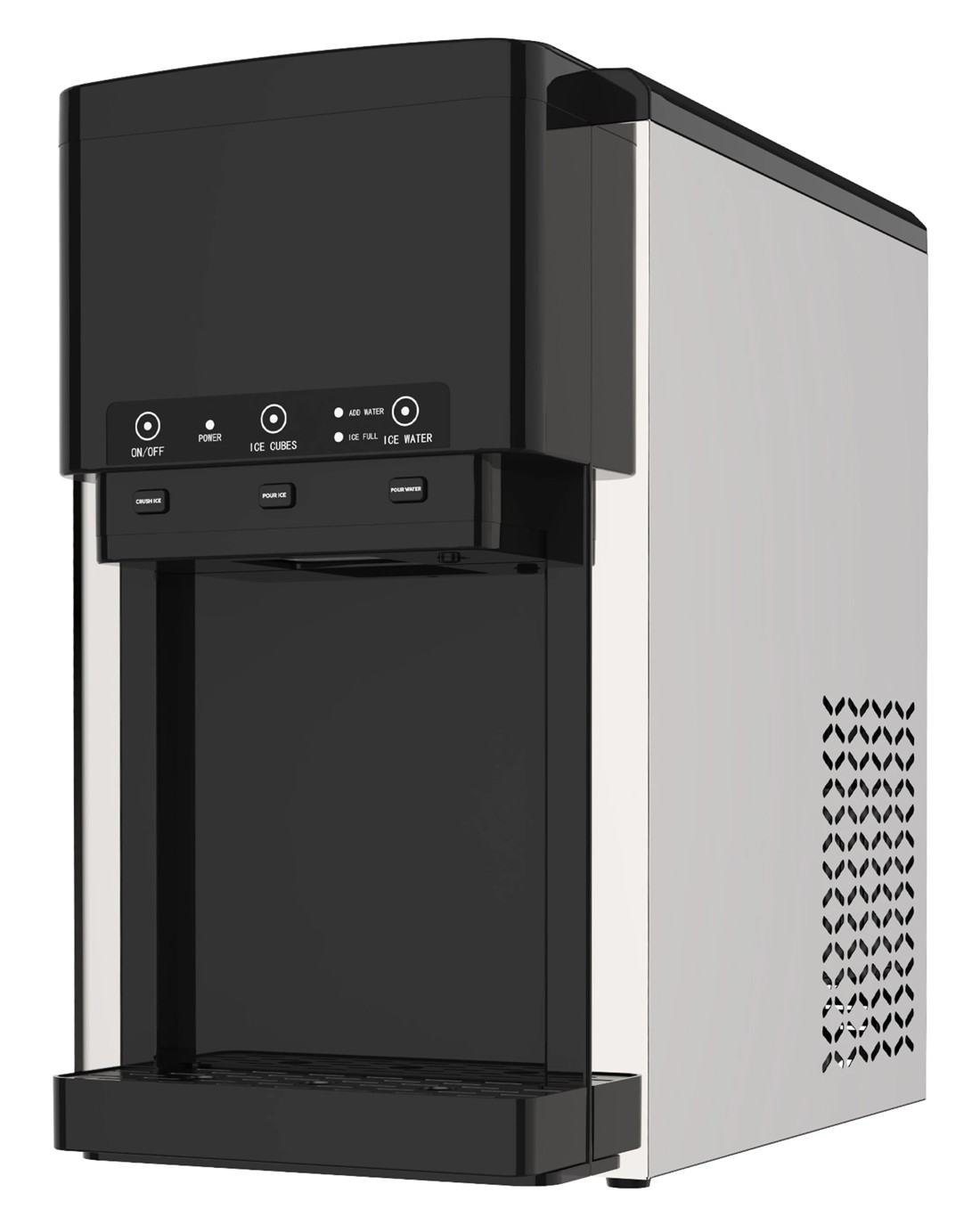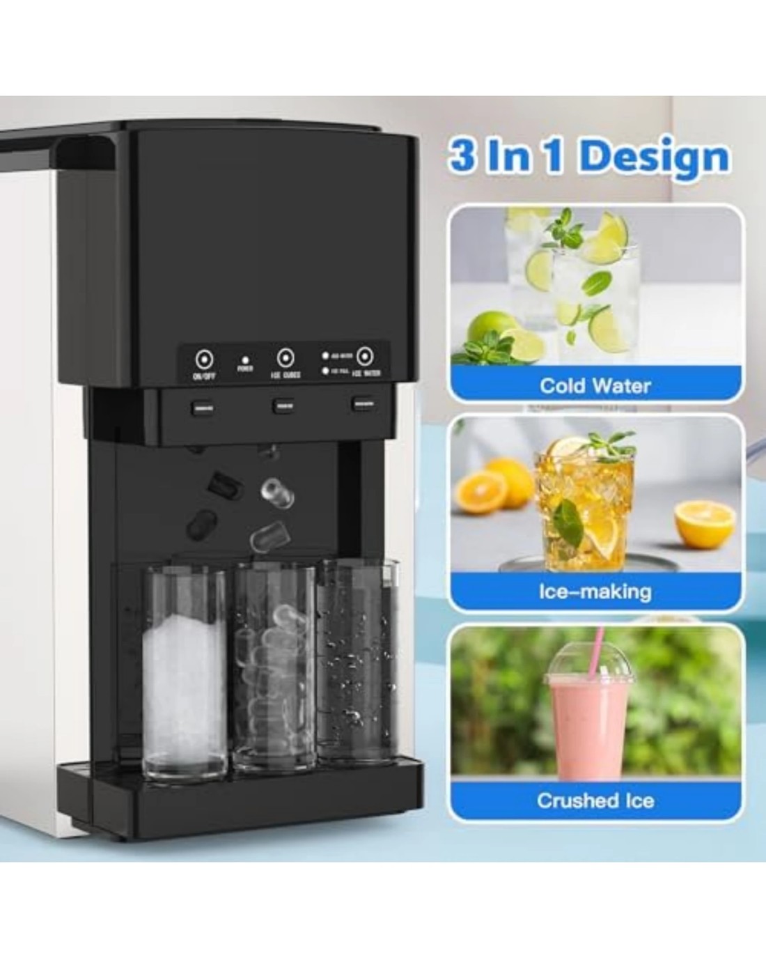 Stainless steel countertop ice maker machine combined with a water dispenser and ice crusher, ; truly getting ice cubes and cold water within the same machine, meet your different drinking needs. Perfect for your kitchen, living room, bedroom, office, or party.