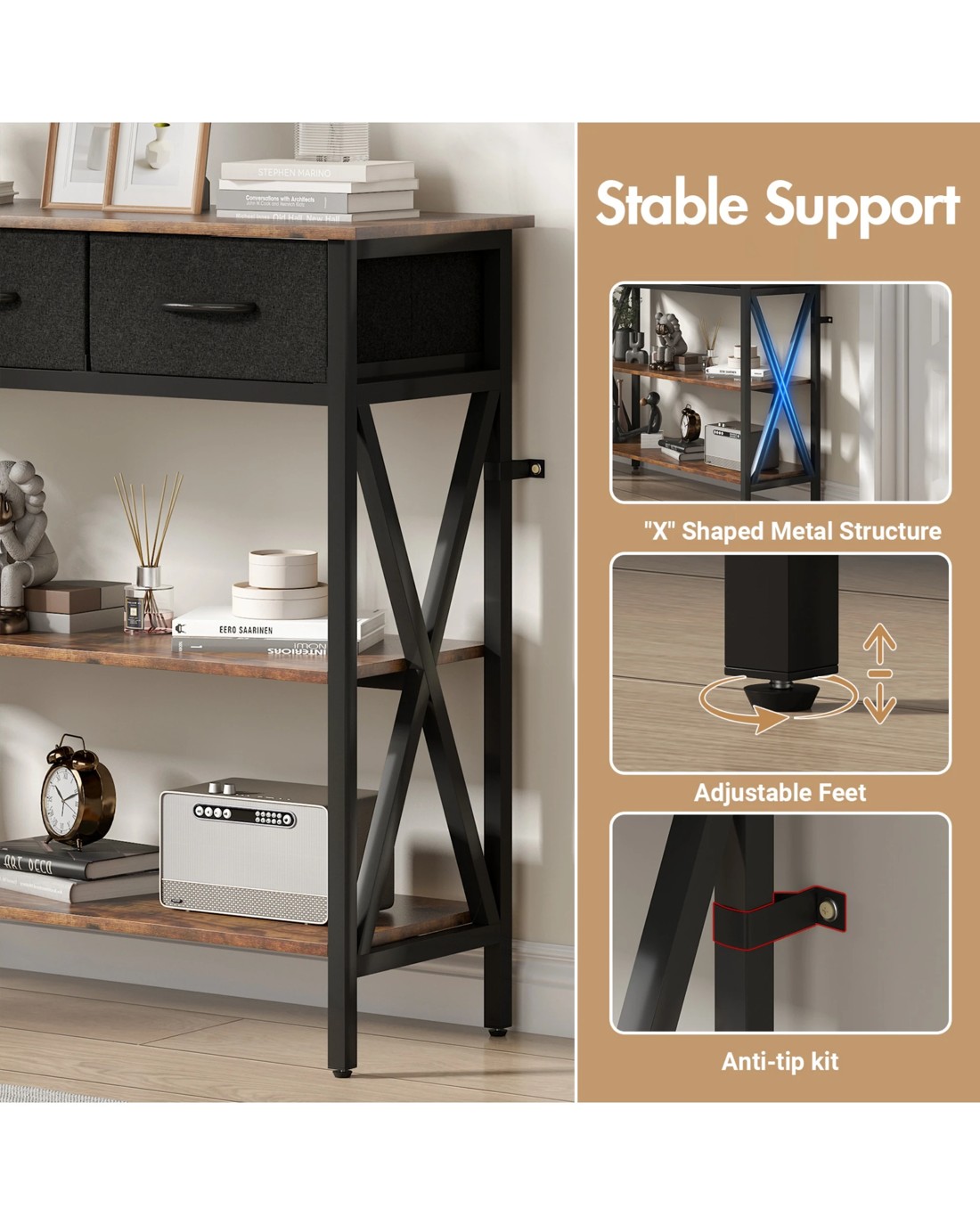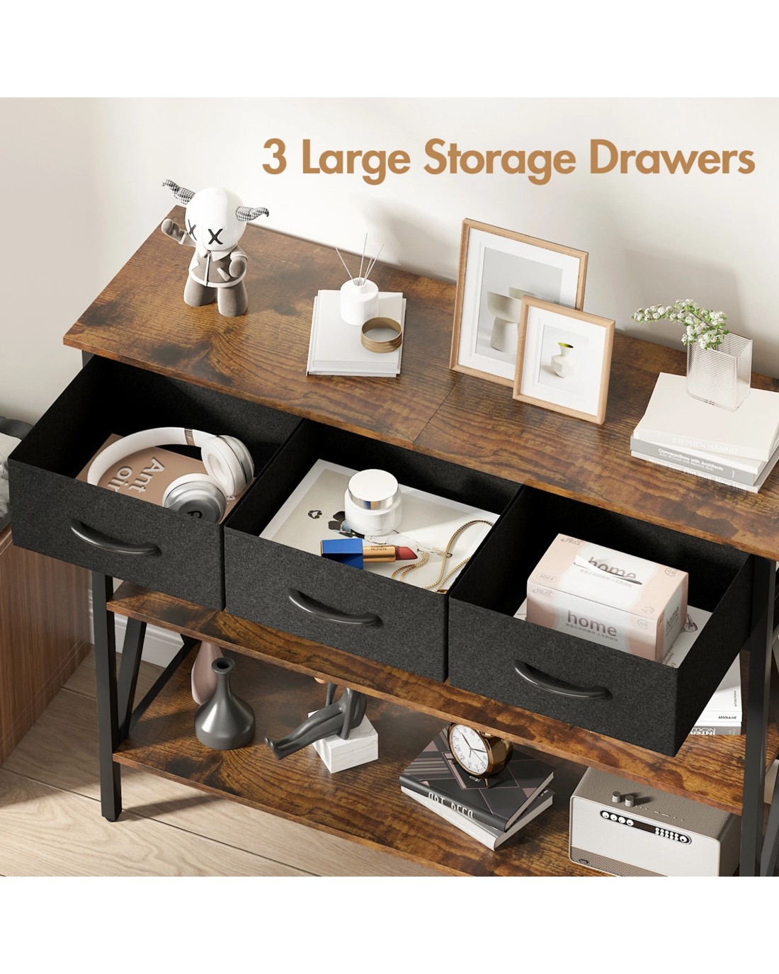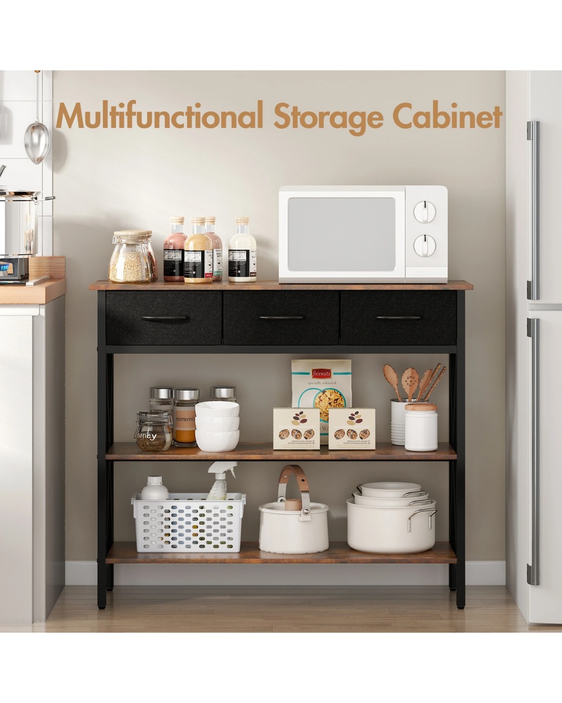 Perfect for entryways, living rooms, bedrooms or kitchens, it features 3 fabric drawers to securely store small items and spacious shelves for shoes, books, coffee machines, or heavy appliances.