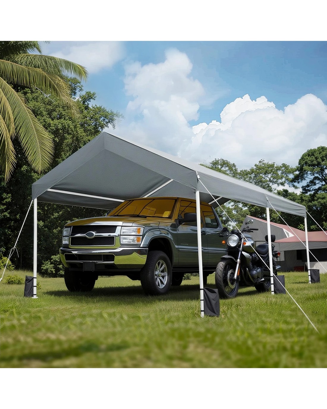 This 3.68x6m heavy-duty carport features a powder-coated steel frame reinforced with ground stakes, wind ropes, and sandbags for added stability and durability.
