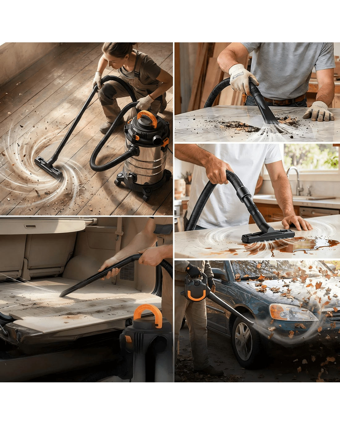 Uniquely designed as a 4-in-1 system, it transforms into a high-speed detachable blower delivering 80–85 MPH airflow—faster than competitors—making it ideal for clearing leaves, dust, and clippings outdoors. Complete with a full accessory kit, integrated storage, a 5-meter cable, and a water-resistant construction, it’s the reliable, all-in-one solution for workshops, garages, driveways, and demanding industrial environments.