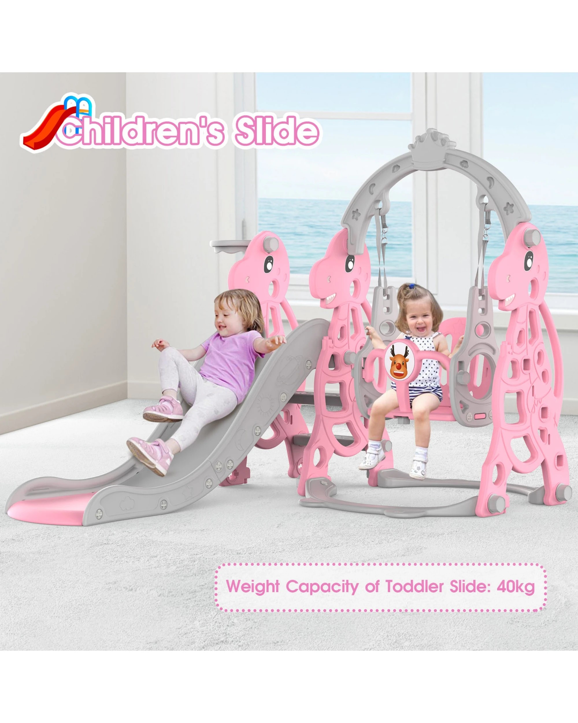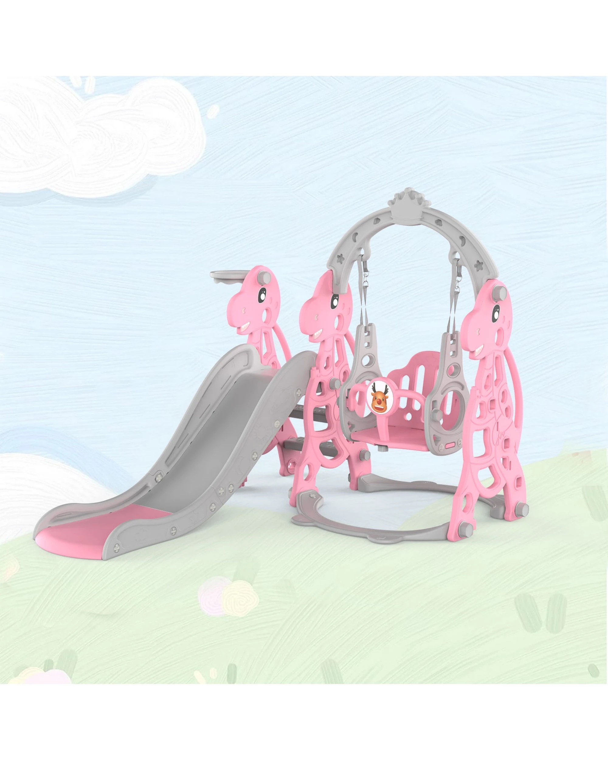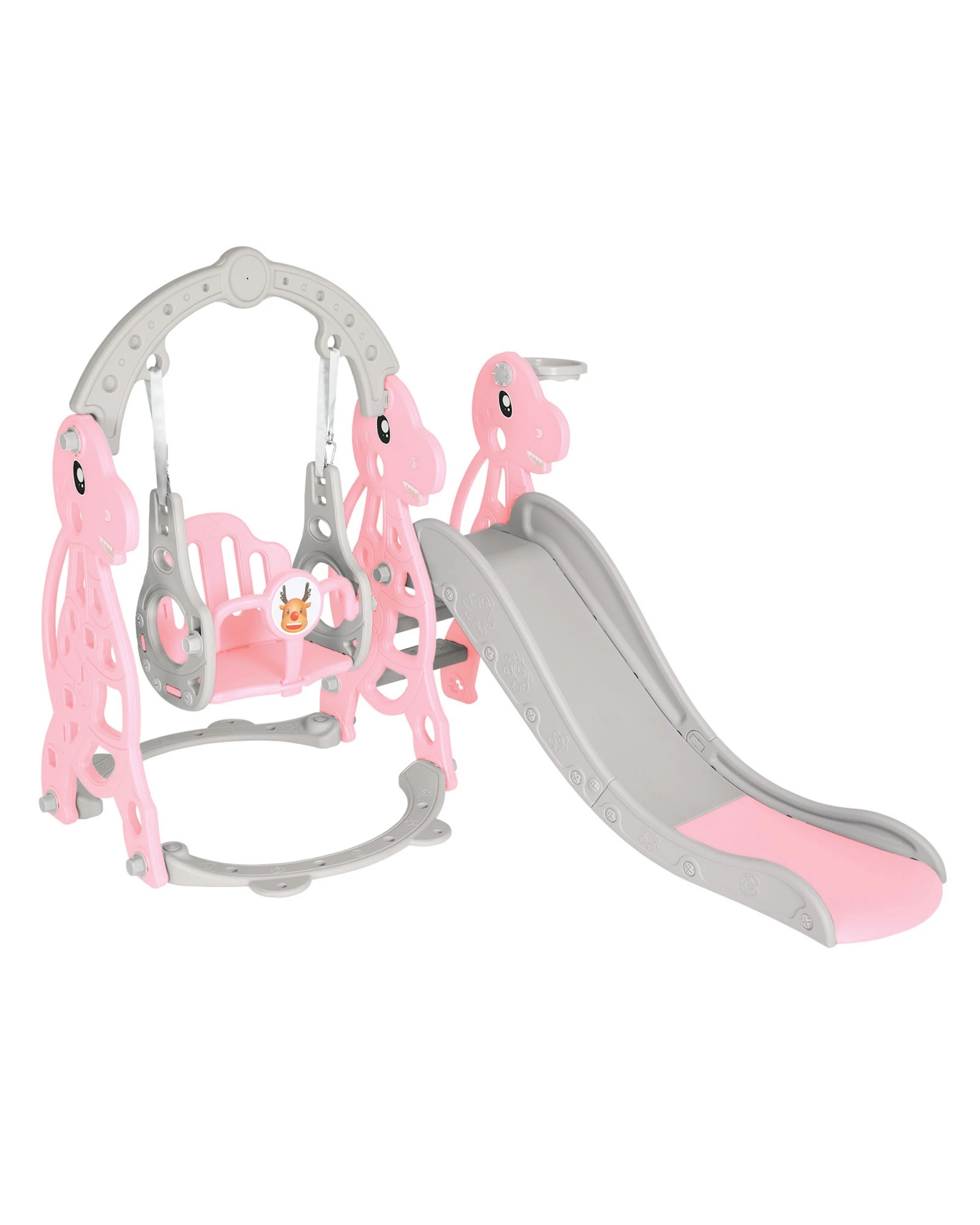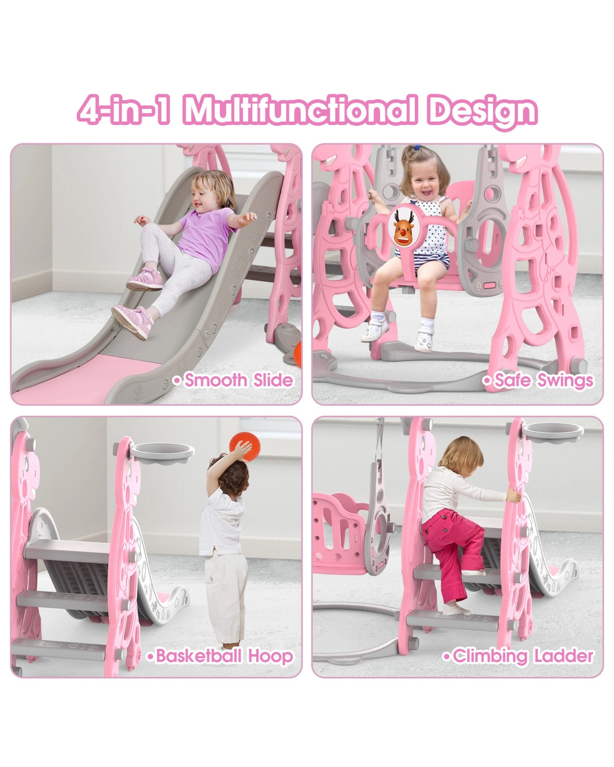 Advwin 4-in-1 Kids Slide Swing Set with Basketball Hoop Pink