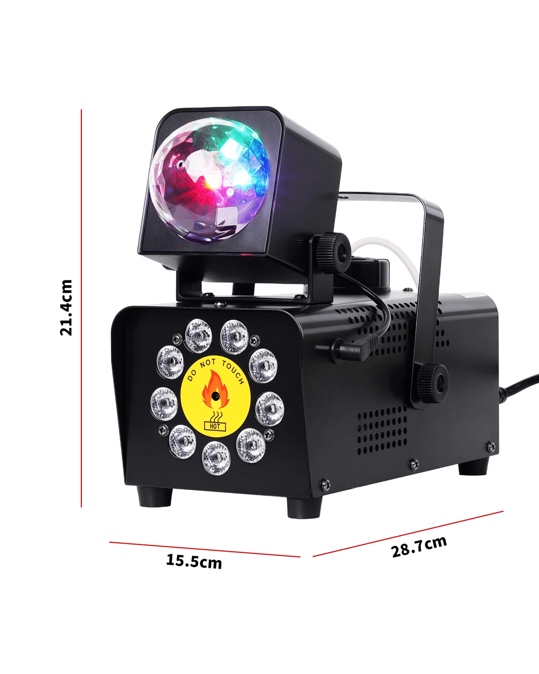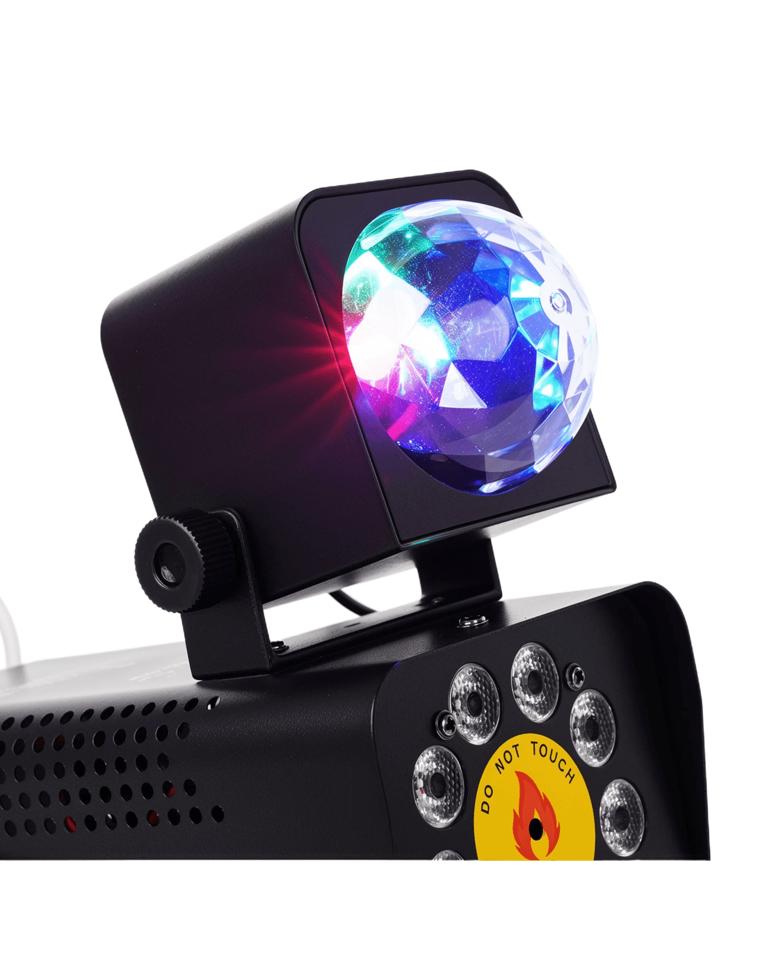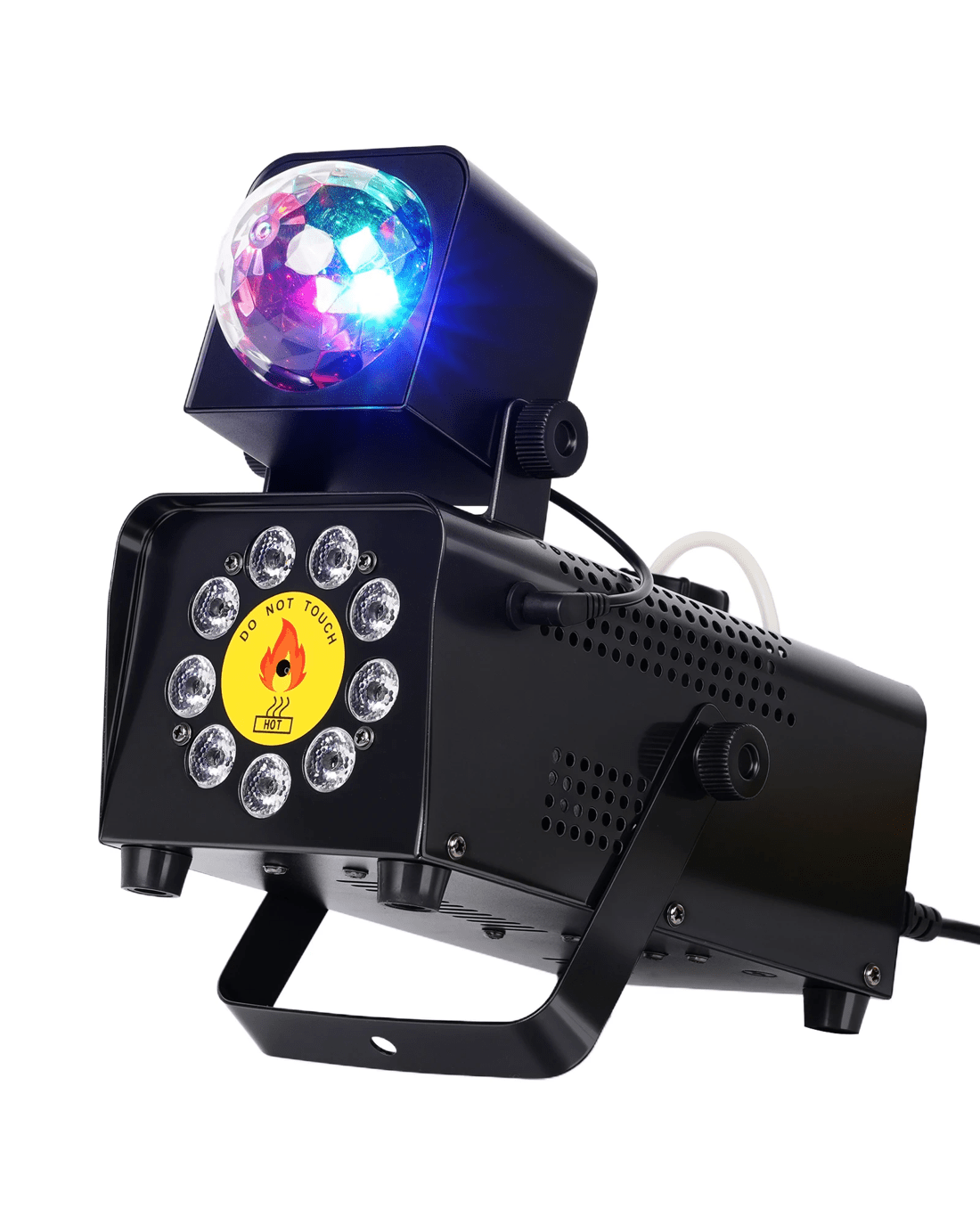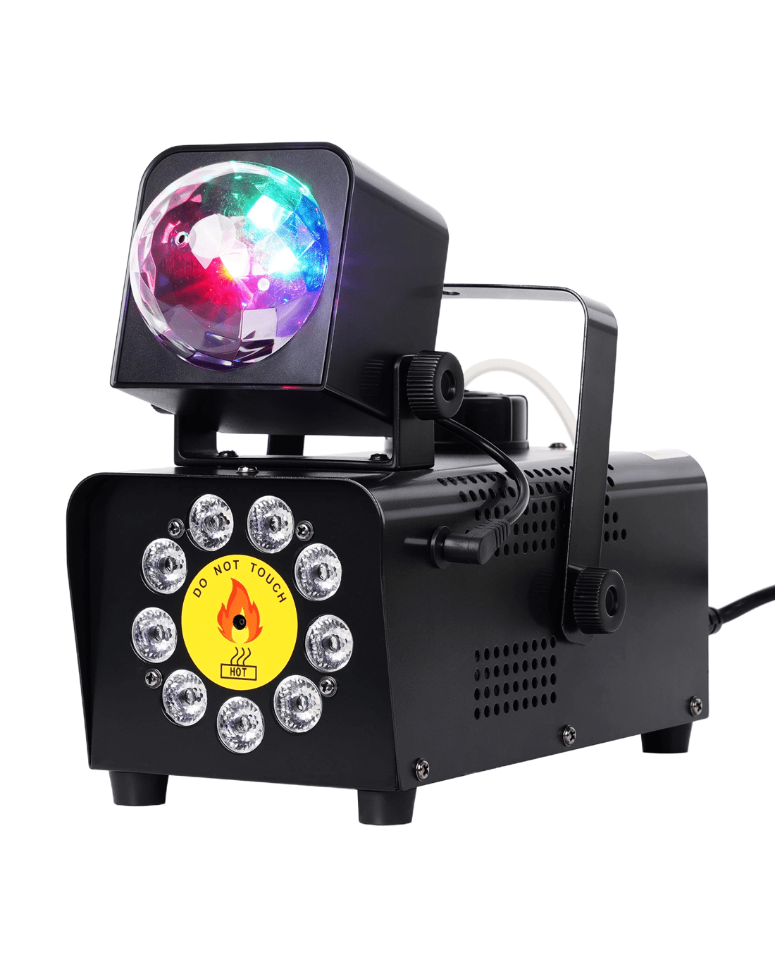 【 12 Colors and 4 RGB LED Effects 】 The smoke machine is equipped with 9 LED lights below, with 12 different colors and 4 different lighting modes. The magic ball light on the upper part automatically changes color in RGB, and the angle can be adjusted freely, enhancing the party effect and stage atmosphere.