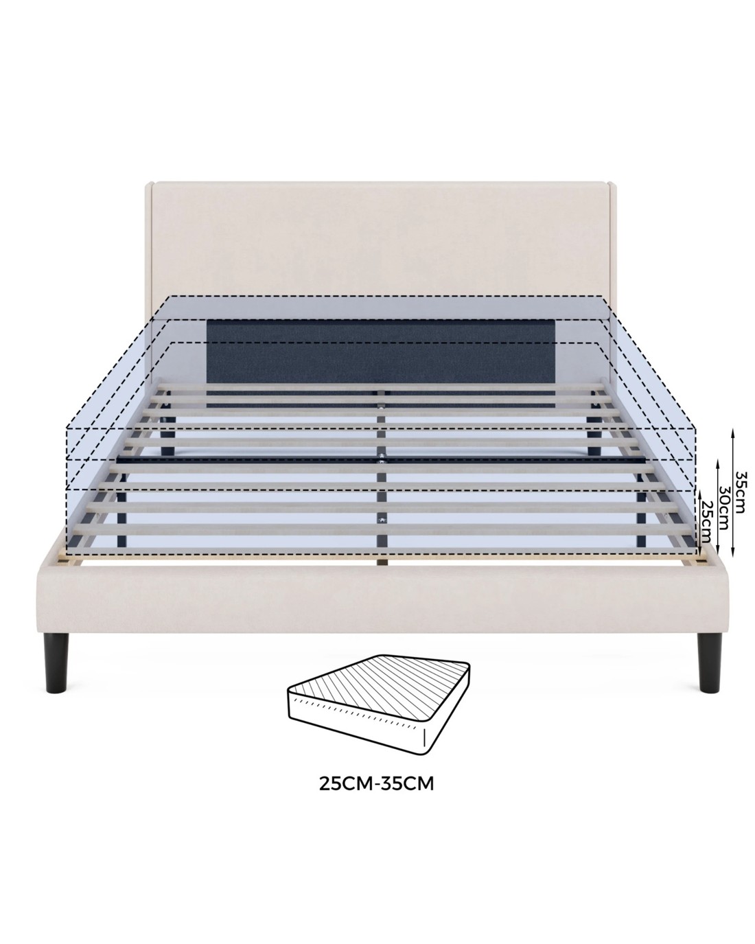 In addition, the height of the bed frame from the ground is 18cm, and the bed frame provides ample storage space for your bedroom and other household essentials. The bed frame is constructed with a metal frame and solid wood strips, and its maximum capacity is 300 kg, ensuring a stable and safe sleeping environment. The mattress base is designed to fit standard Australian mattresses, and the support legs feature a non-slip design to keep your bed frame in place. No noise.