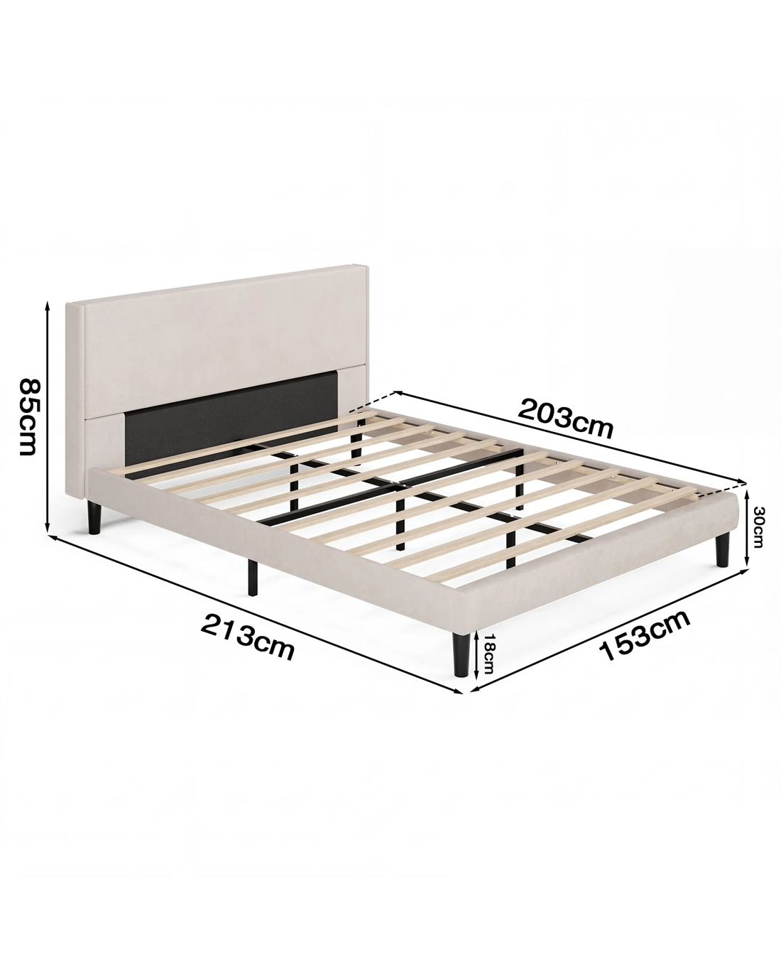 In addition, the height of the bed frame from the ground is 18cm, and the bed frame provides ample storage space for your bedroom and other household essentials. The bed frame is constructed with a metal frame and solid wood strips, and its maximum capacity is 300 kg, ensuring a stable and safe sleeping environment. The mattress base is designed to fit standard Australian mattresses, and the support legs feature a non-slip design to keep your bed frame in place. No noise.