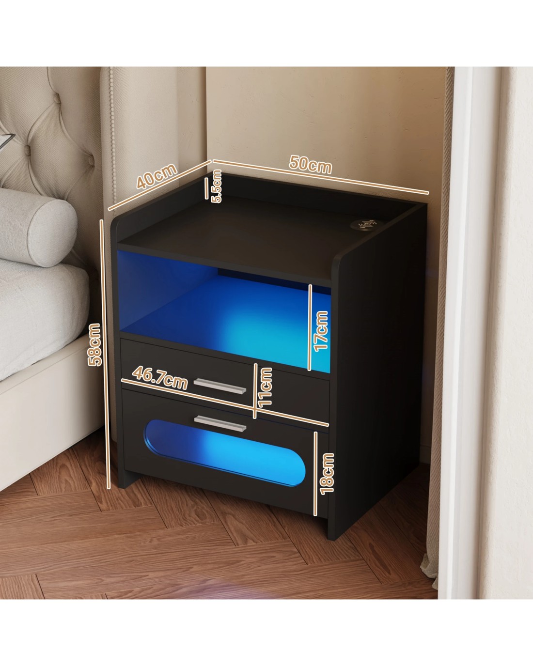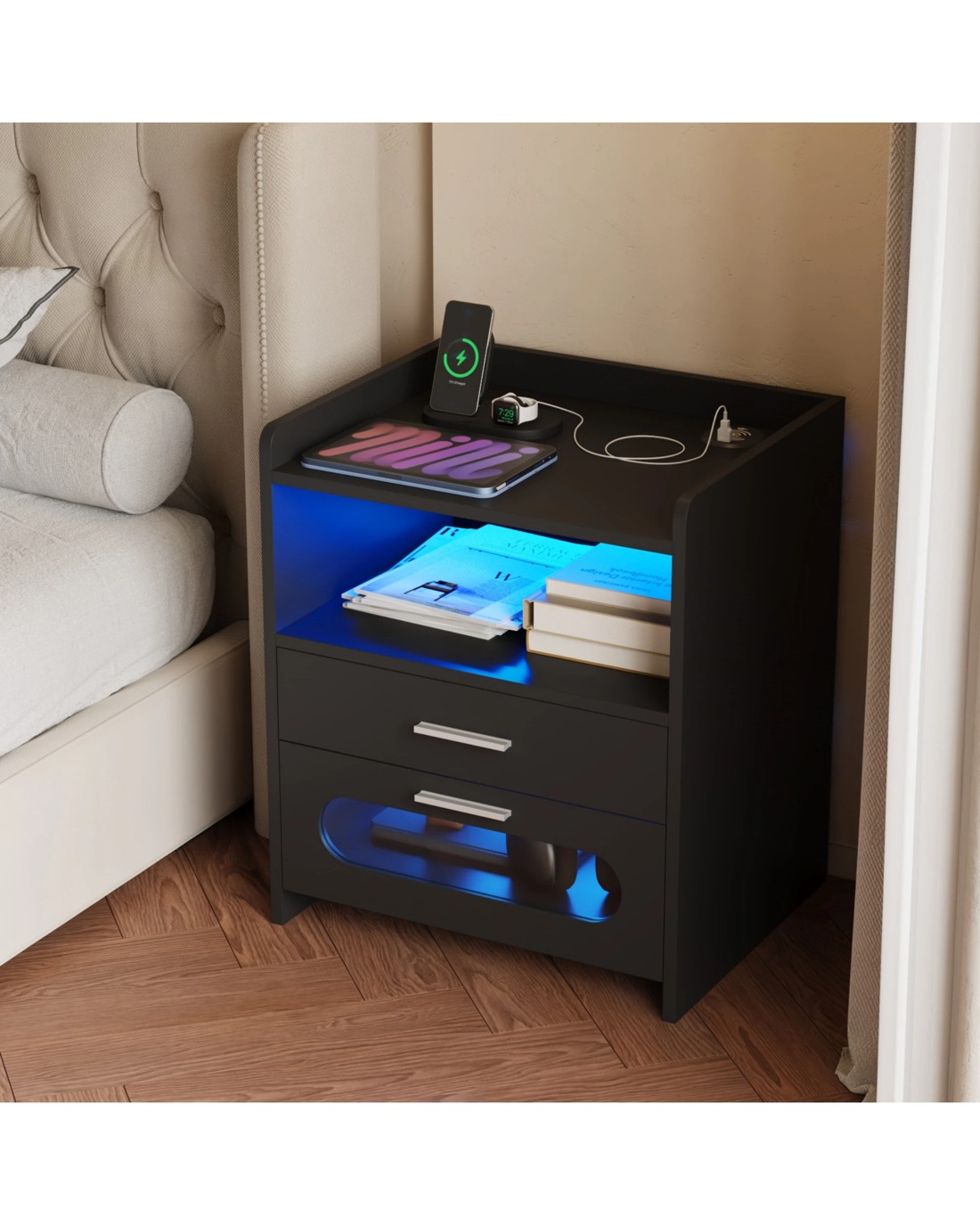 Advwin durable and functional bedside table, the perfect addition to your bedroom.Nightstand combines charging and storage functions into one, providing convenience and organization. It features two spacious storage drawers and an open compartment, providing ample space for organizing your essentials.Bedside table is equipped with wireless charging and USB port, enabling you to easily charge your devices without cluttering the space with numerous cables.Elevate your bedroom ambiance with the Advwin bedside table's integrated LED light.