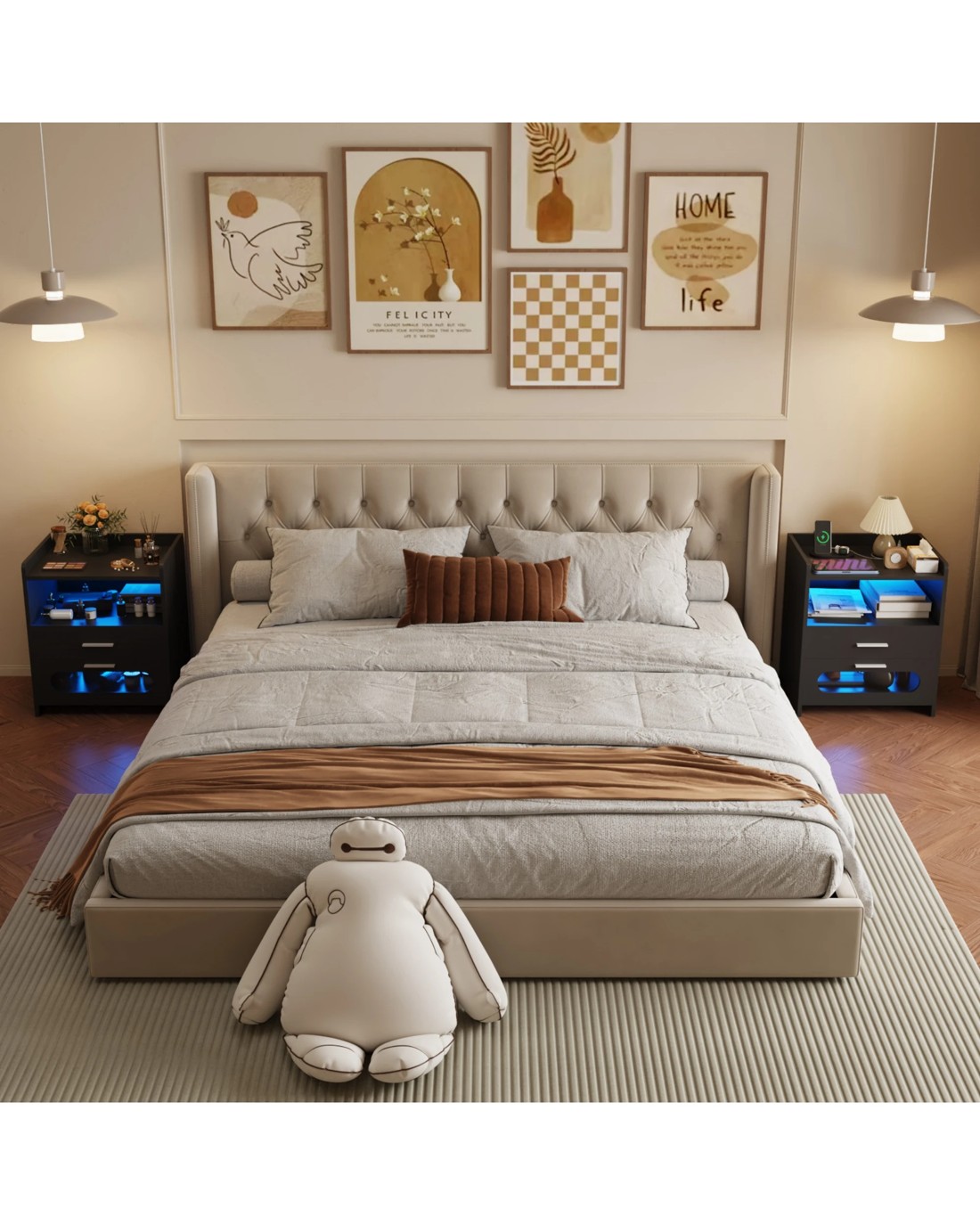 Wireless Charging +USB Interface: The bedside table is equipped with wireless charging and USB charging interface, and the power cord reaches 190cm, which is convenient for you to charge electronic products.