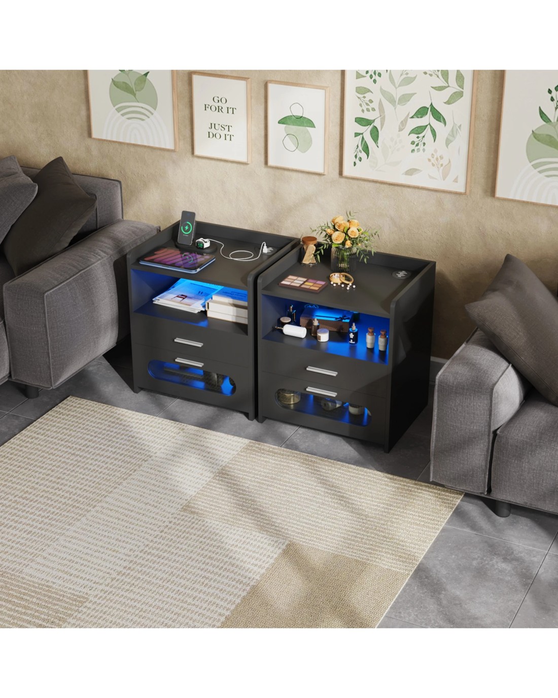 Sold by AdvwinAdvwin Bedside Table Set of 2 Wireless Charging Station Led Lights 2 Drawers Storage - Black