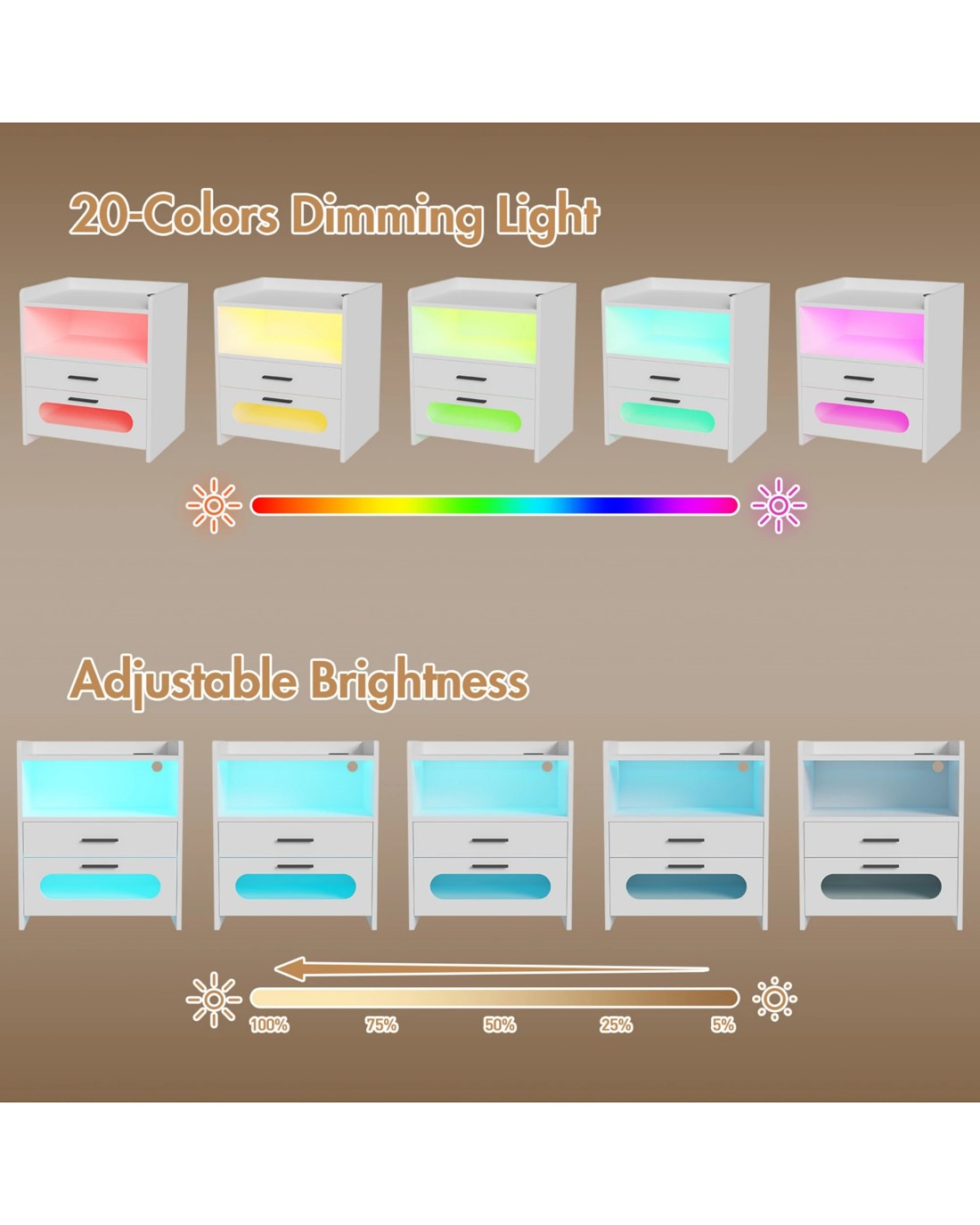 20 Colors RGB LED Lights: The nightstand is equipped with 20 RGB colors and 22 dynamic modes, 10 levels of dynamic speed, and 5 levels of brightness adjustment. 2 Light strips are controlled by remote control to match your mood.