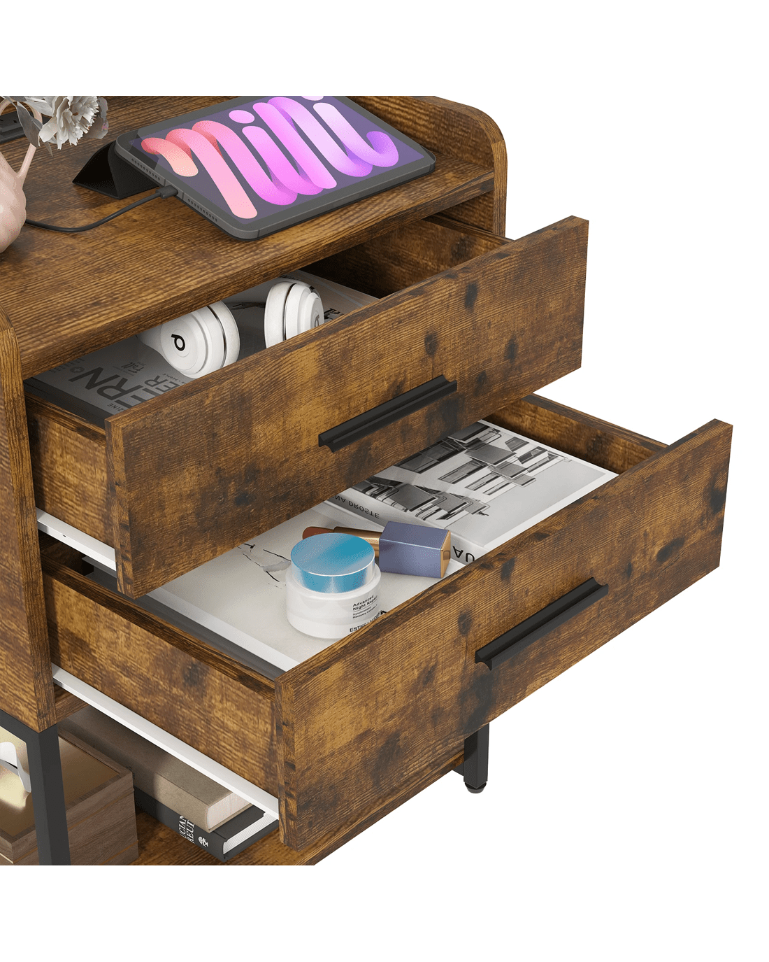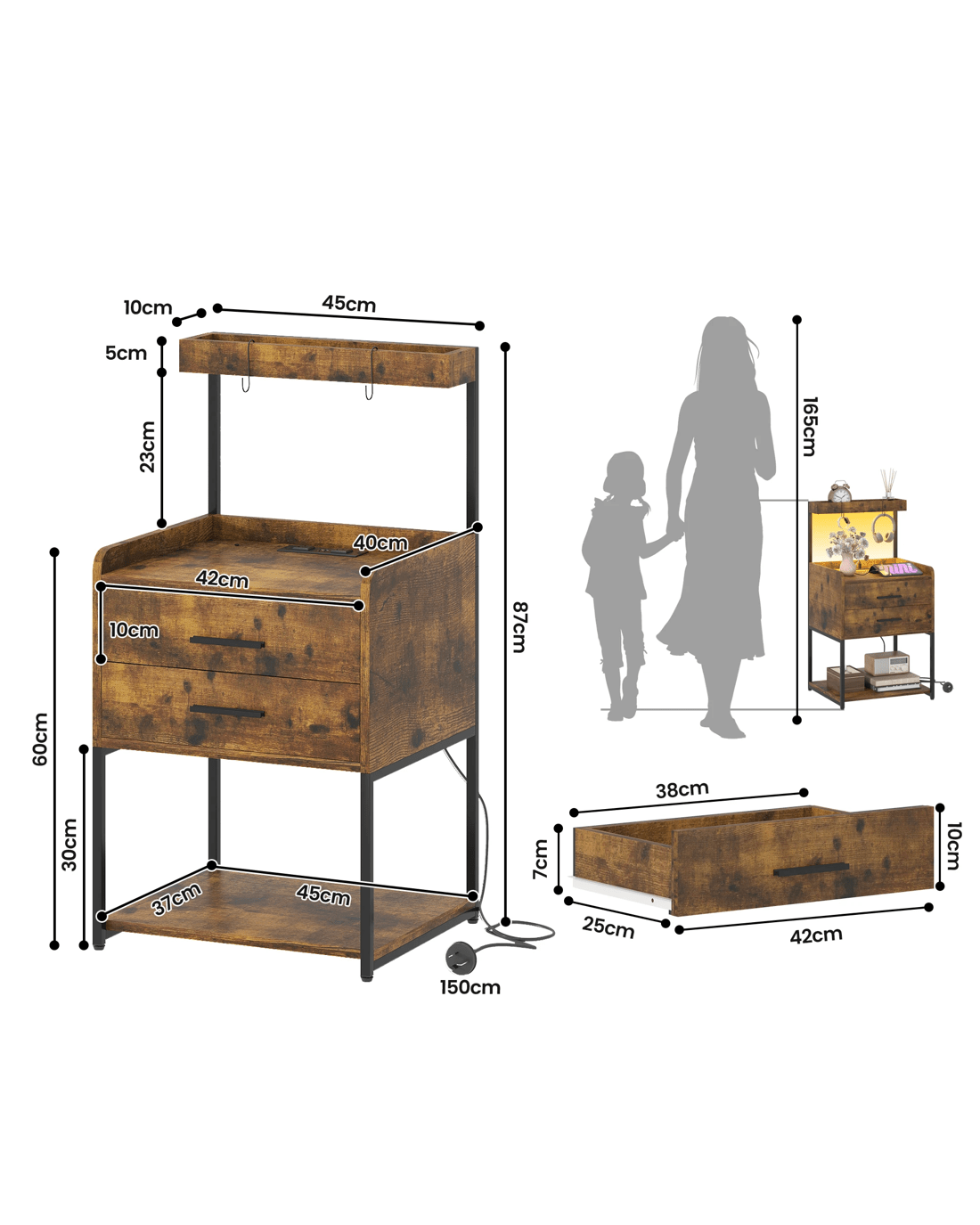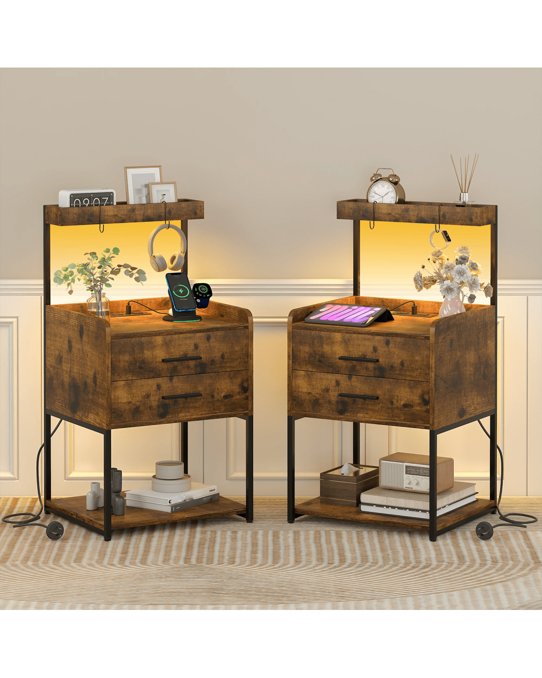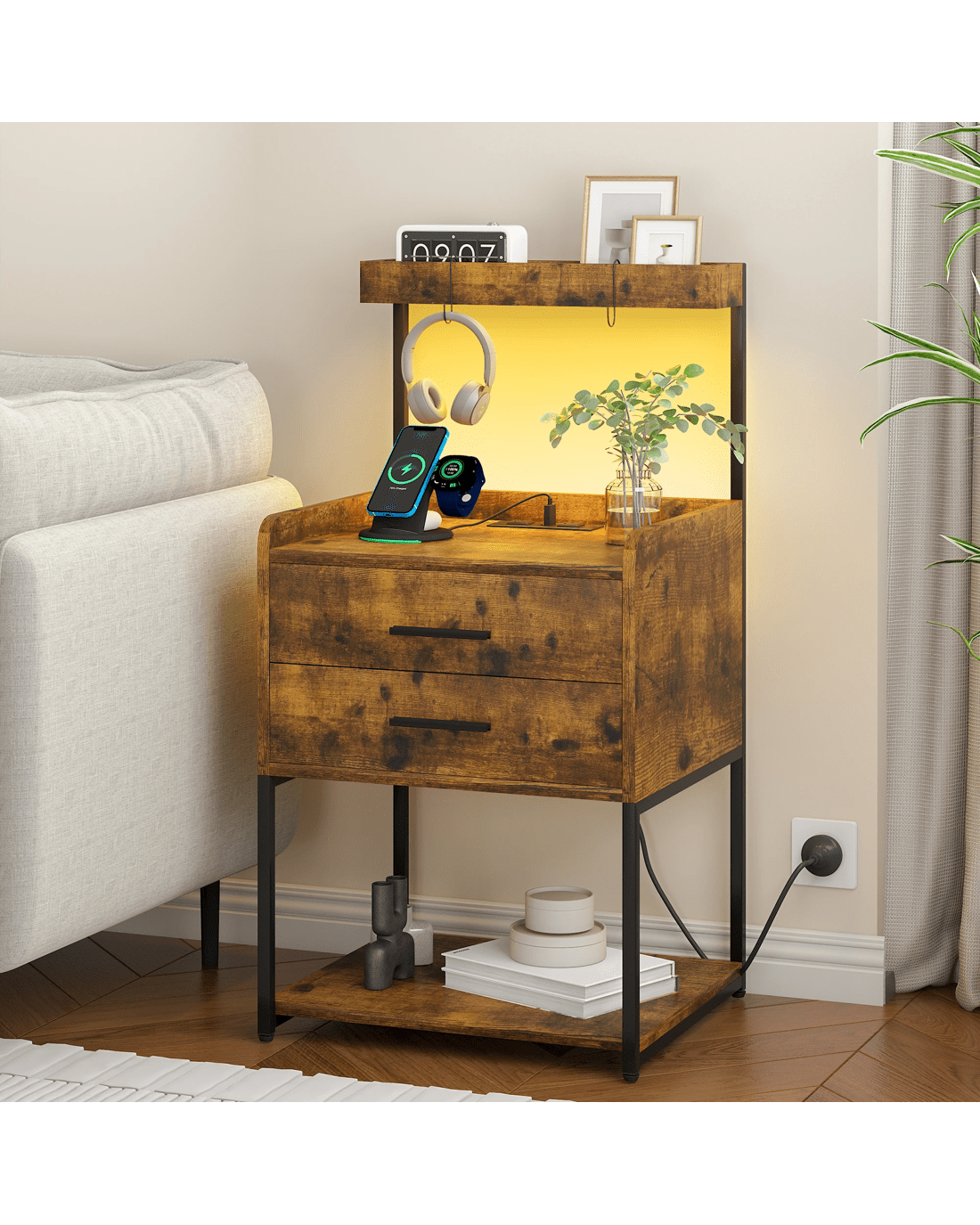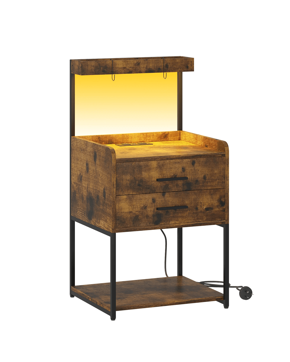 Advwin Bedside Table with Charging Station LED Lights 2 Drawers - Brown
