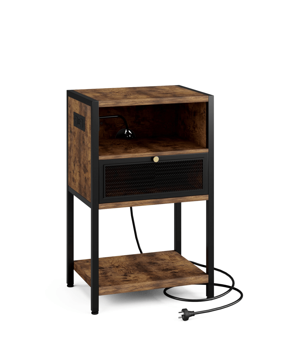 The Advwin Bedside Table combines modern functionality with rustic charm for your bedroom or living space.Stay connected with the built-in charging station (2 outlets + 2 USB ports), perfect for overnight device charging. Its practical storage includes a flip-down metal mesh drawer and two open shelves, keeping essentials organized yet accessible. Crafted from durable particleboard with a metal frame and adjustable protective feet, this 8 kg industrial-style table offers both stability and style. Easy to assemble and multi-functional, it works perfectly as a bedside table, living room side table, or office cabinet.