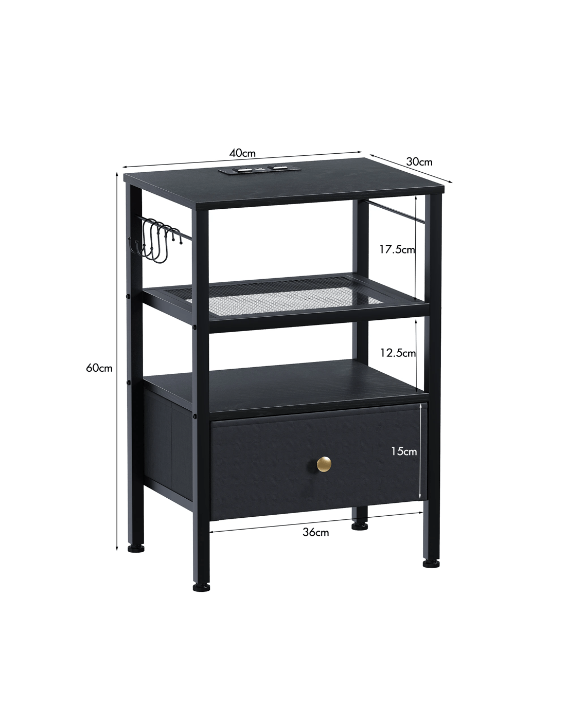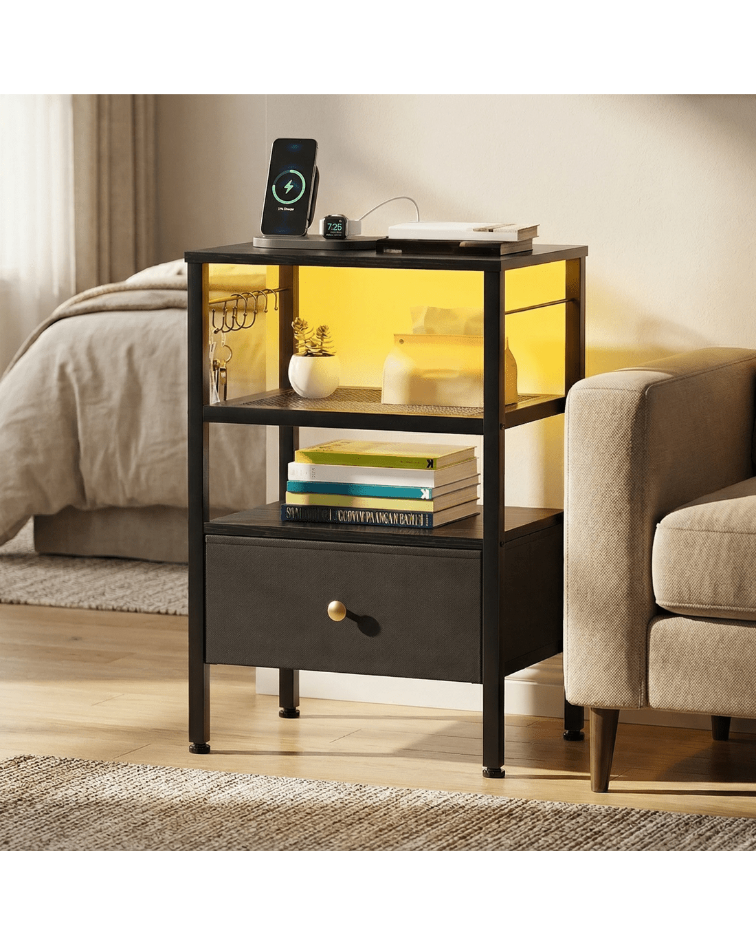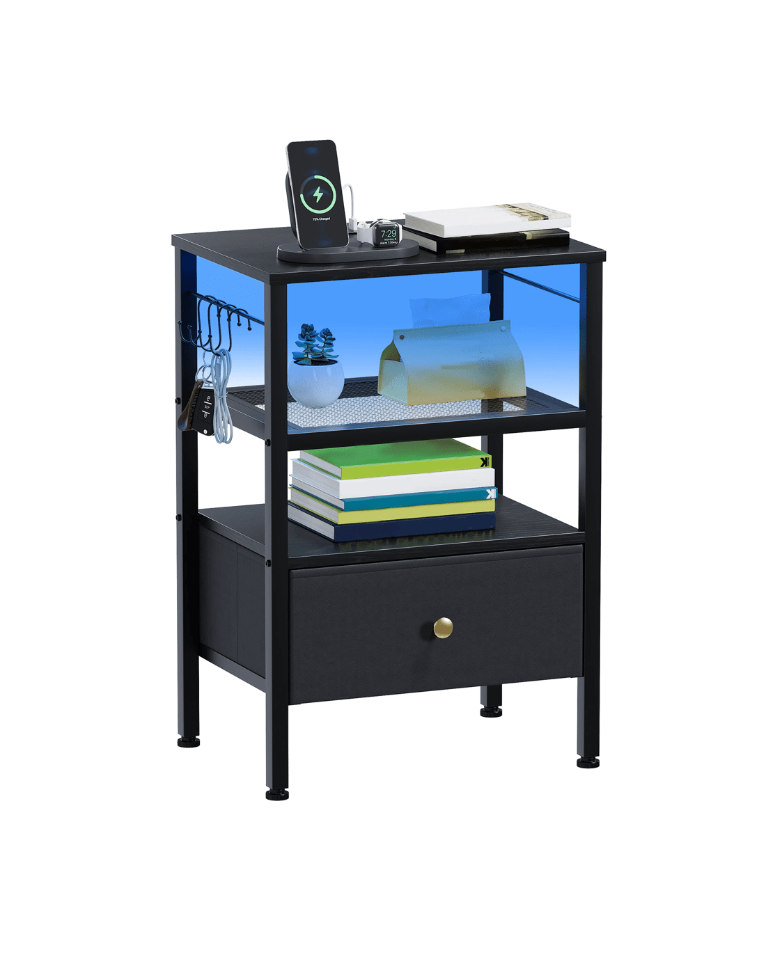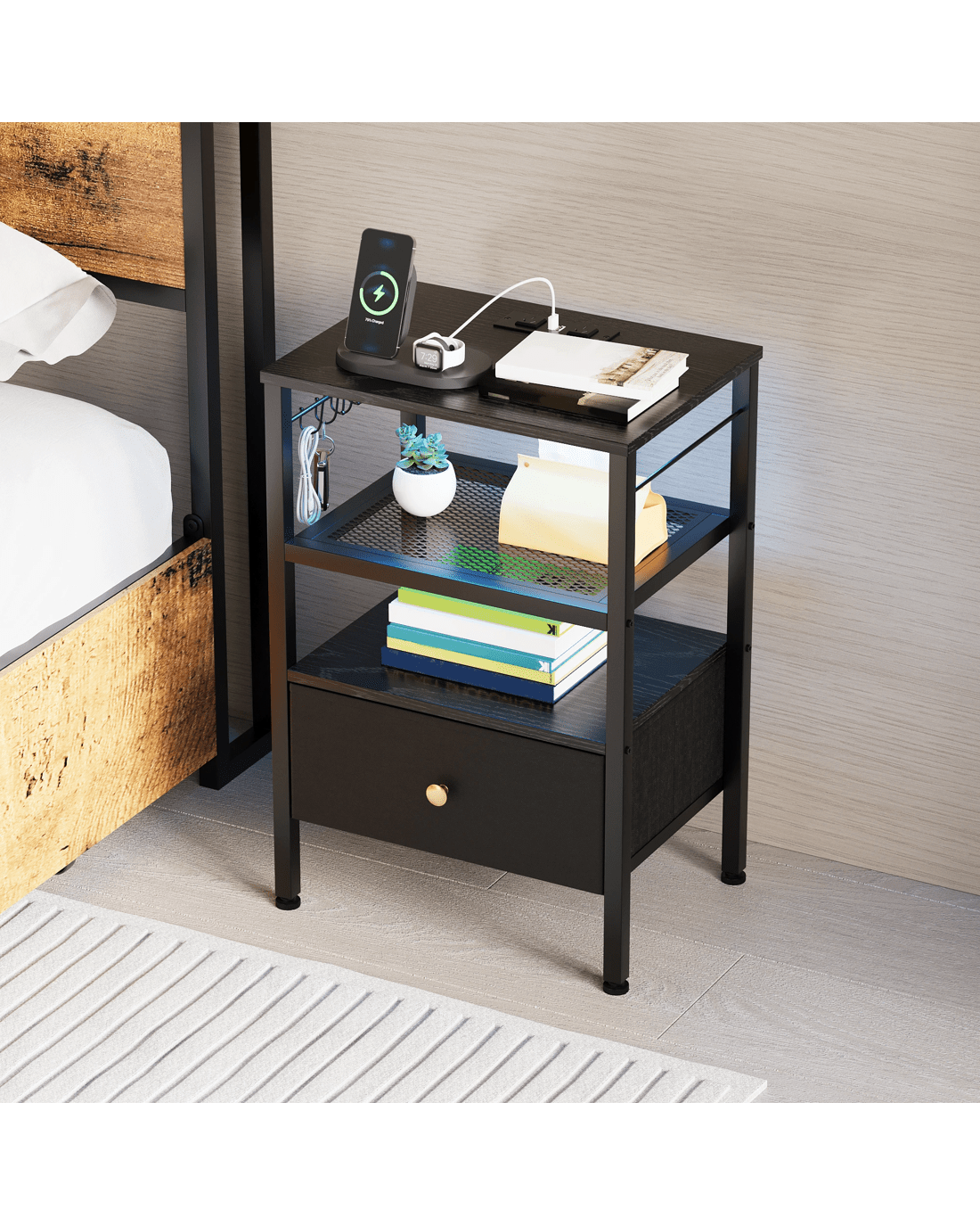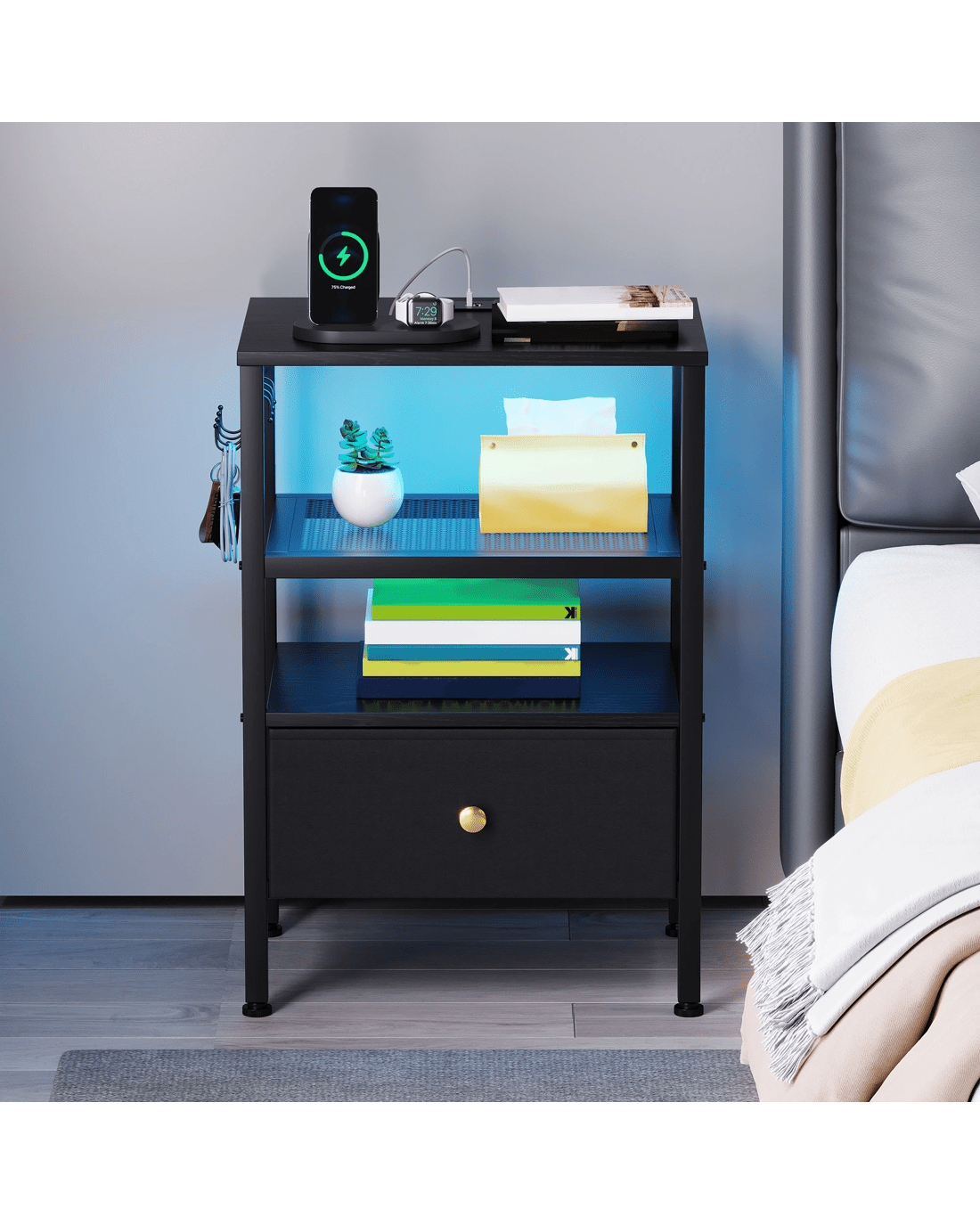 Sold by AdvwinAdvwin Bedside Table with Fabric Drawer Charging Station LED Lights - Black