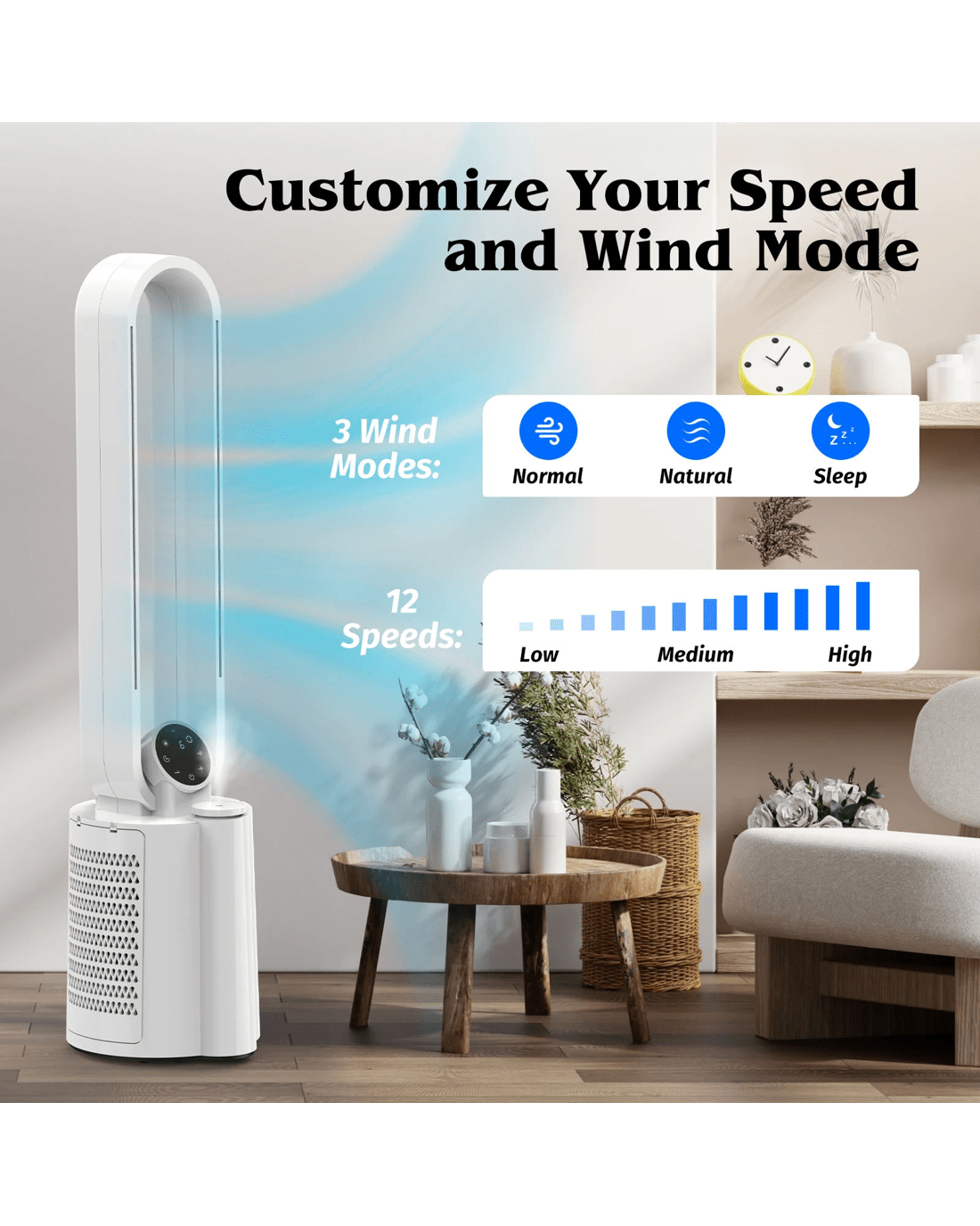 Our Bladeless Tower Fan with Humidifier combines the latest technology with sleek design to provide you with the ultimate cooling and comfort experience.