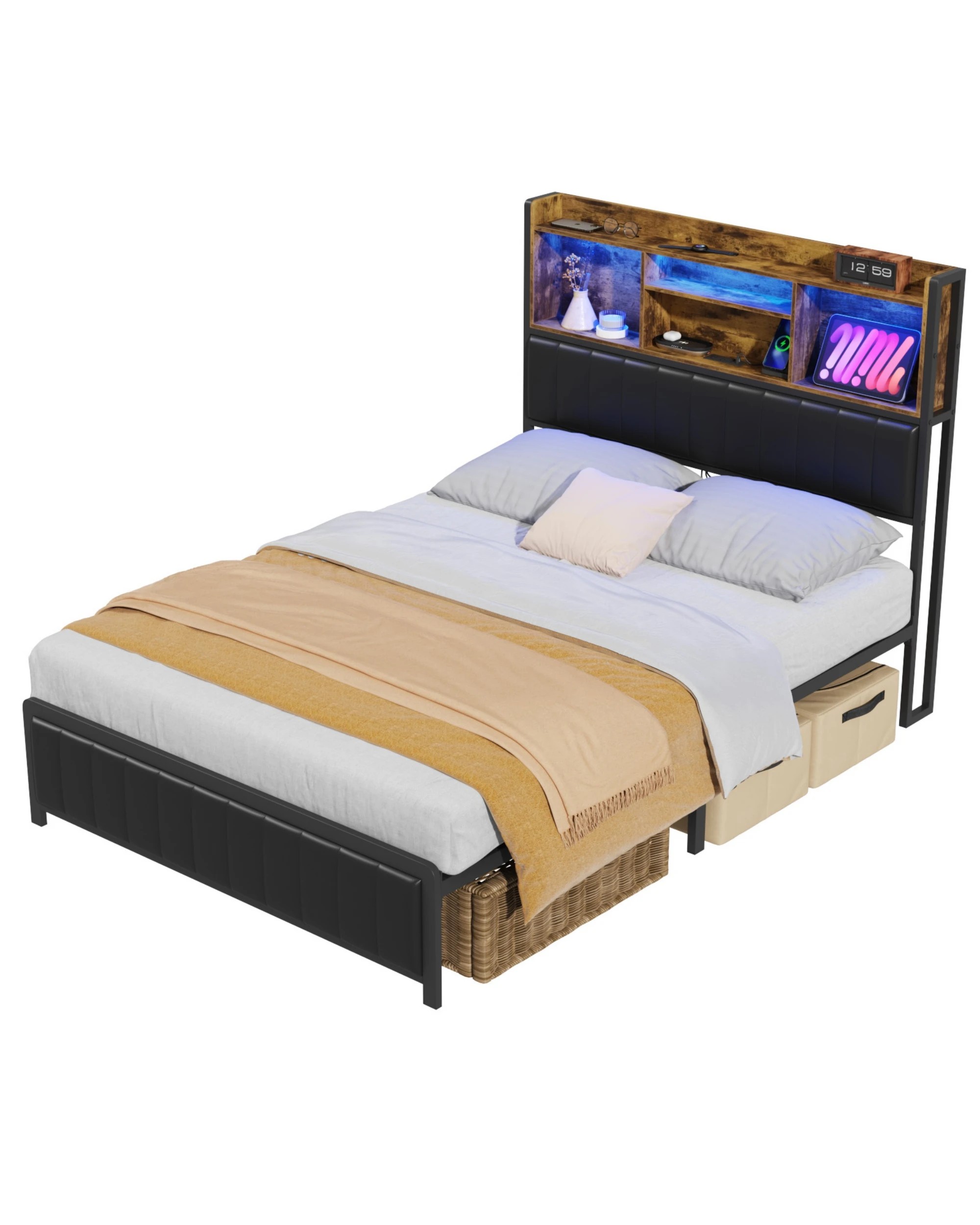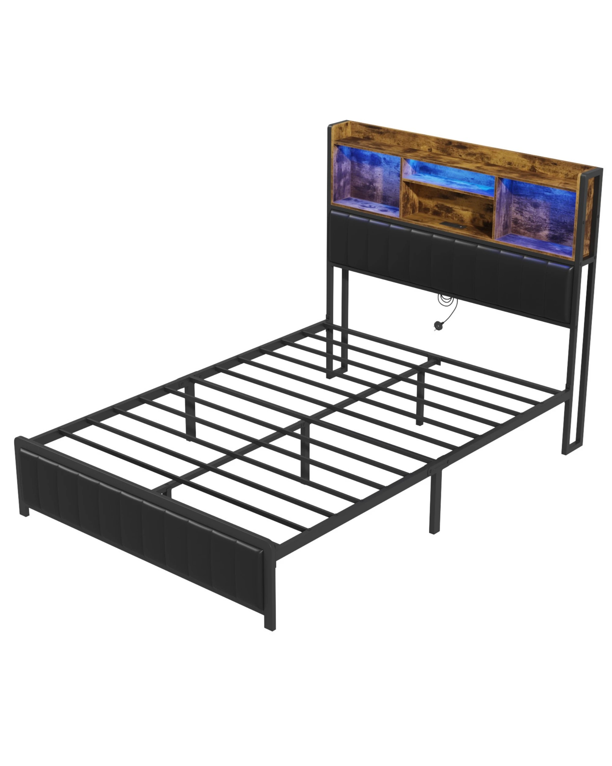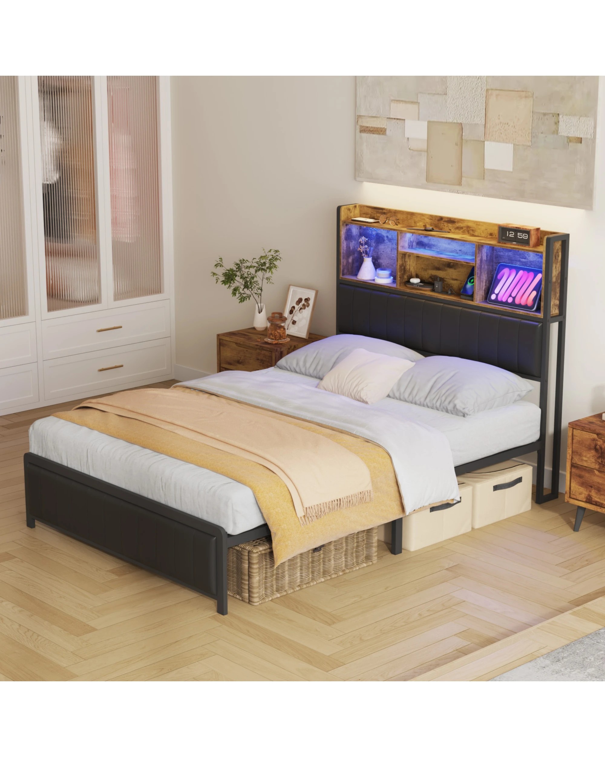 Advwin Double Bed Frame With Charging Station & Led Storage Bookcase