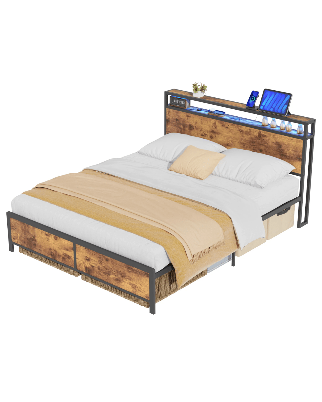 Featuring a modern industrial design, this bed frame adds a touch of contemporary charm to any room. The wooden headboard provides a comfortable and cozy space to rest your head. With built-in storage and display space on the headboard, you can conveniently store and showcase your favorite items. The metal bed frame is equipped with 2 power outlets and 1 USB & 1 Type C ports, allowing you to easily charge your devices without the need for extra adapters. Create the perfect ambiance with the multicolor LED light strip. With 16 different colors, adjustable brightness, and customizable lighting modes, you can set the mood for relaxation and enjoyment. The LED light strip can even sync to music, adding an immersive experience to your bedroom.