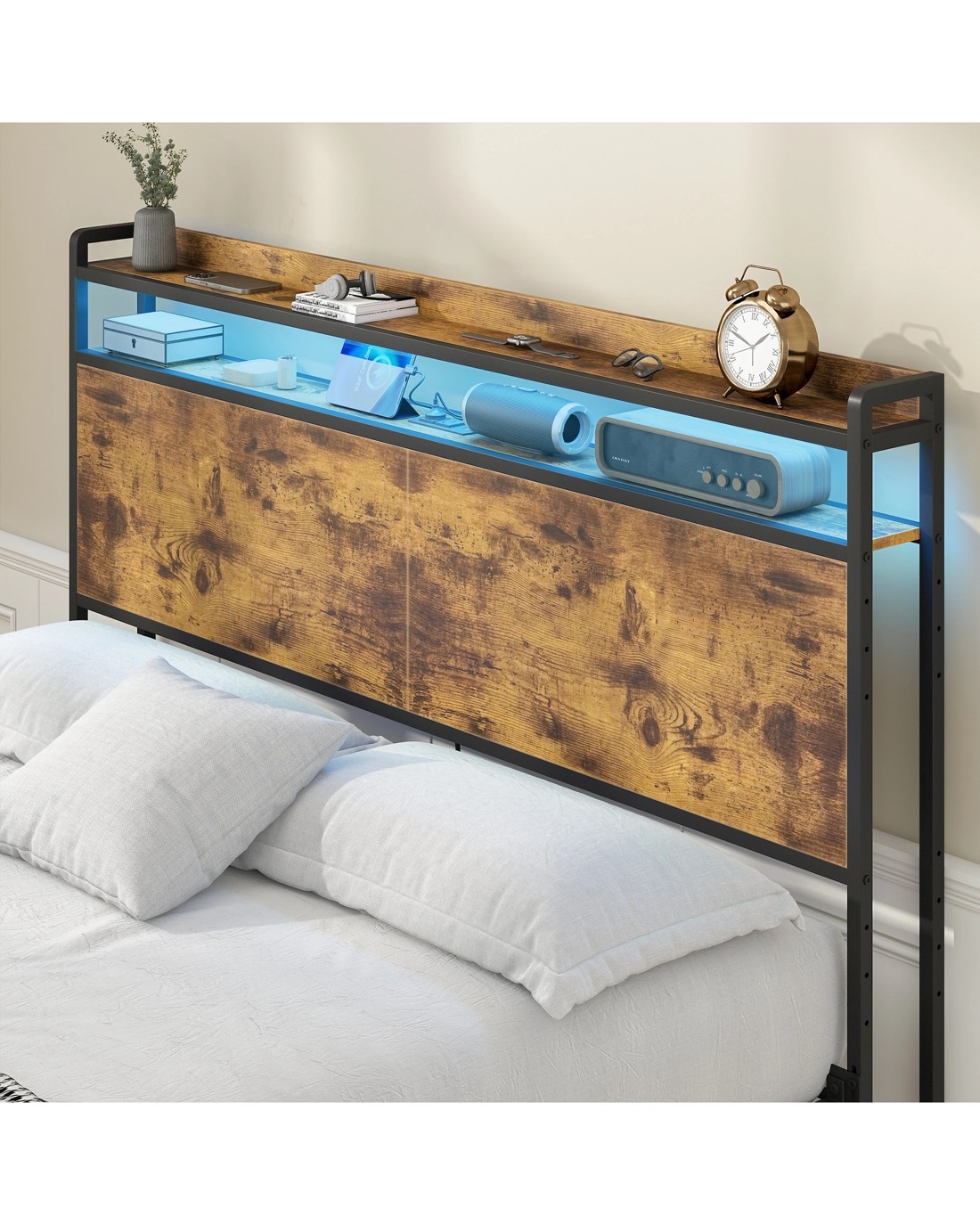 Upgrade your bedroom with the Advwin Double Size Storage Headboard, a multifunctional and stylish addition to your space. This headboard features a built-in charging station with 2 plug outlets, 1 Type-C port, and 1 USB port, keeping your devices charged without cluttering your nightstand. The RGB LED lights can be controlled by Bluetooth app, offering multi-color and adjustable brightness options that sync to music for a relaxing atmosphere. With a 2-tier storage shelf, it keeps your essentials within reach and your room organized. Crafted with sturdy industrial black metal and rustic brown wood, it includes adjustable height options and bed frame adapters for easy customization and assembly.