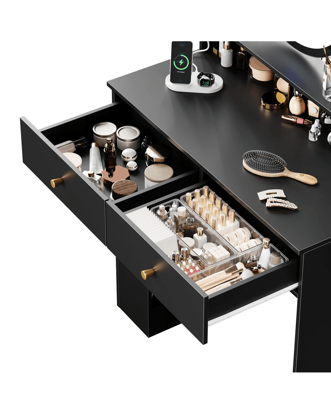 A built-in charging station with 2 AC outlets and 2 USB ports allows you to conveniently power beauty tools and devices. Finished with golden handles and paired with a soft cushioned stool, this stylish vanity desk makes a perfect gift for birthdays, holidays or home upgrades.