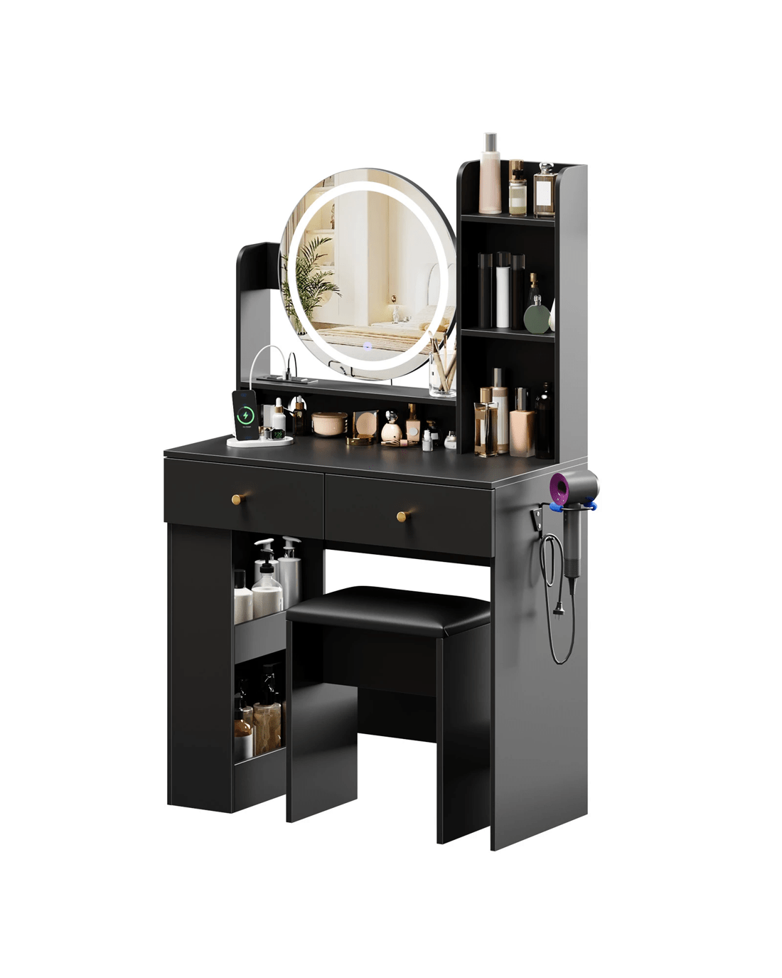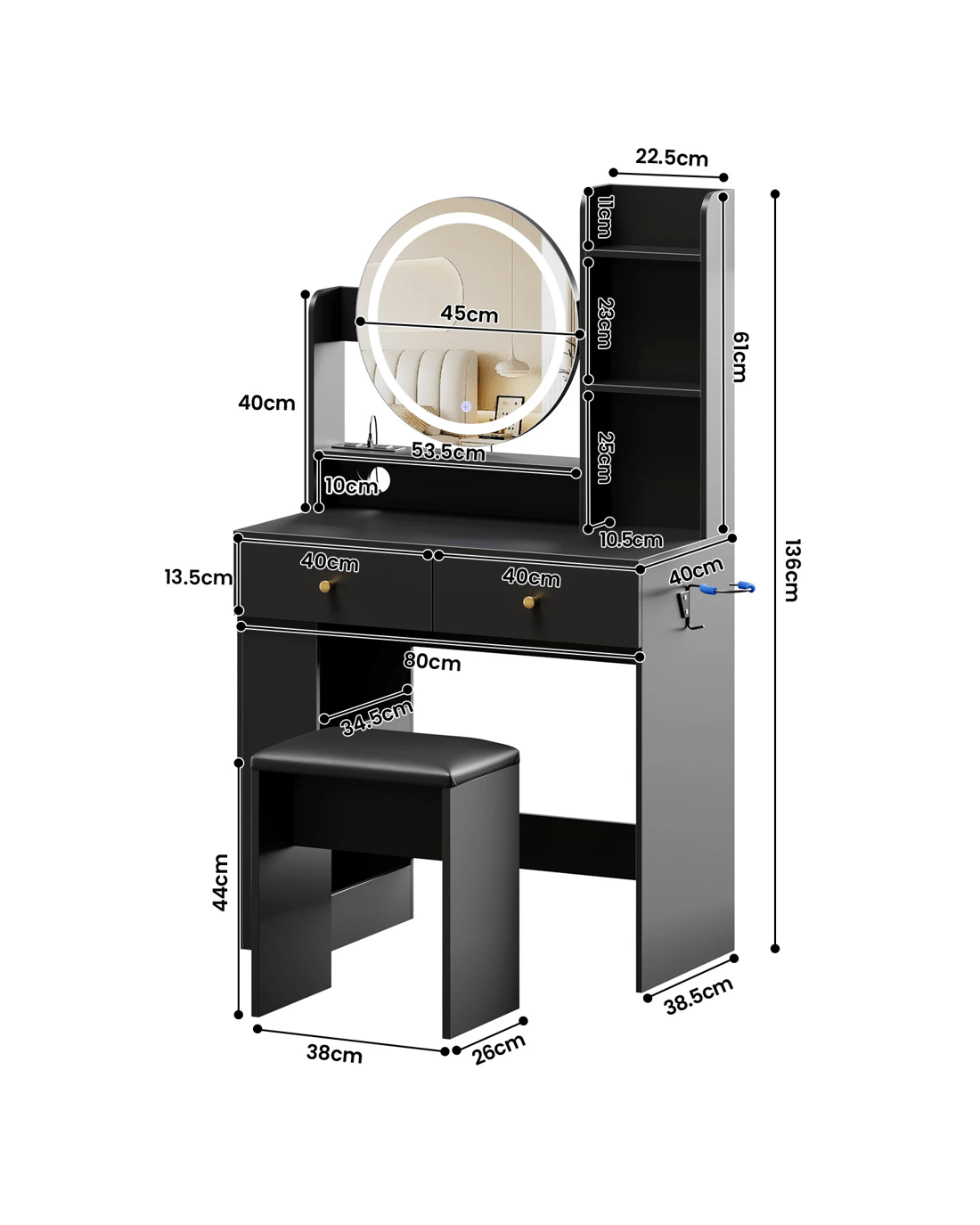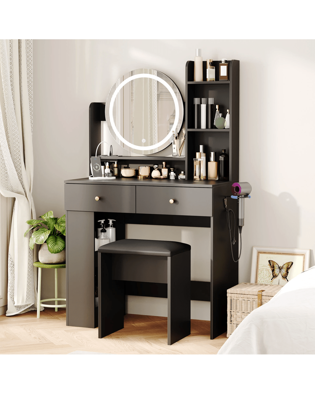 The compact dressing table features a round LED mirror with 3 adjustable color modes for flawless lighting. Designed with open shelves, a spacious tabletop, 2 drawers, a hair dryer rack, and side storage shelves, this multifunctional vanity provides ample space for cosmetics and accessories. The convertible side storage shelves can be installed on either the left or right to suit your room layout.