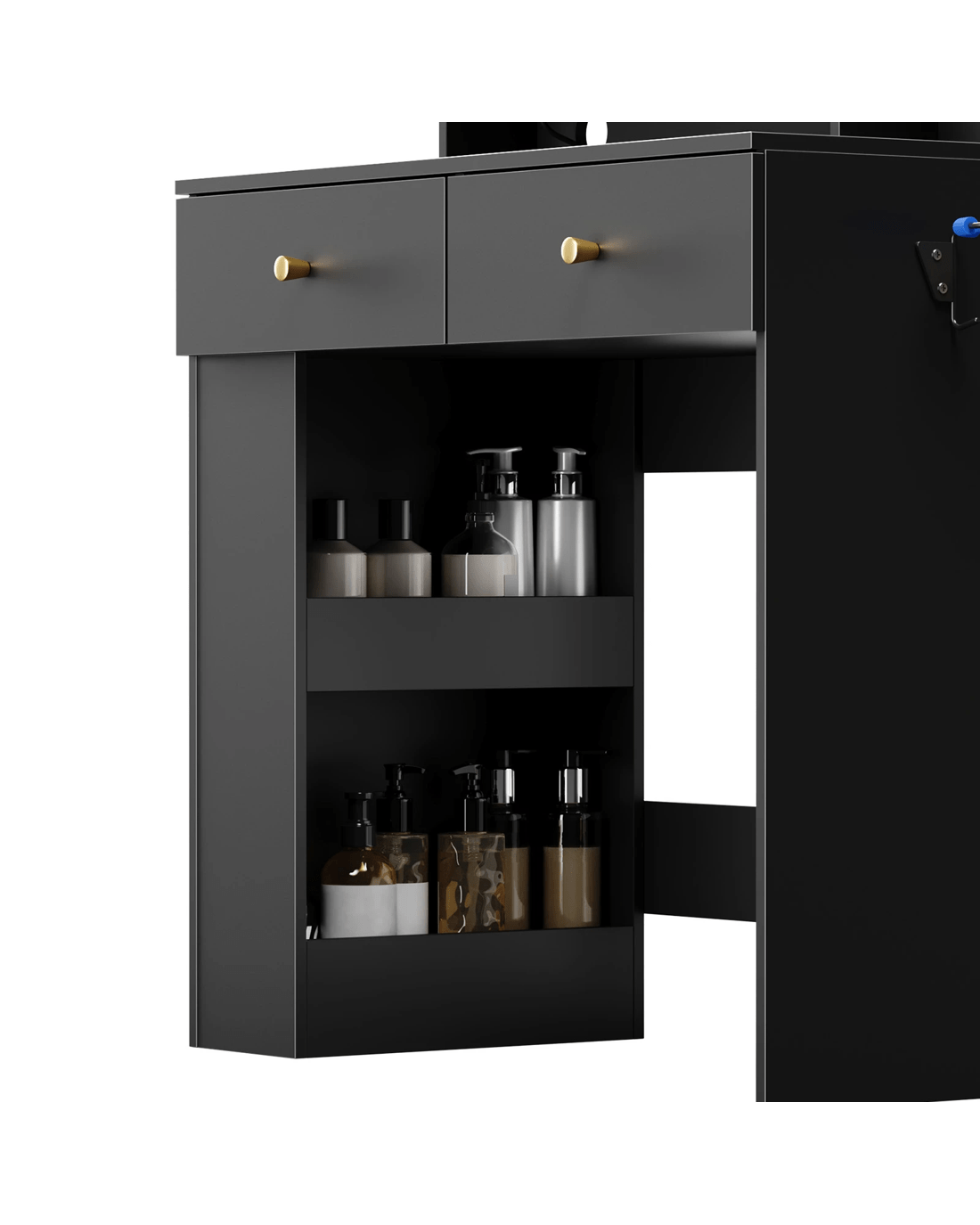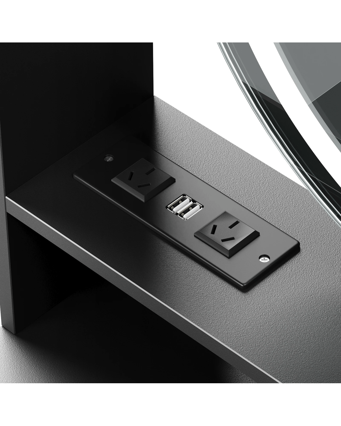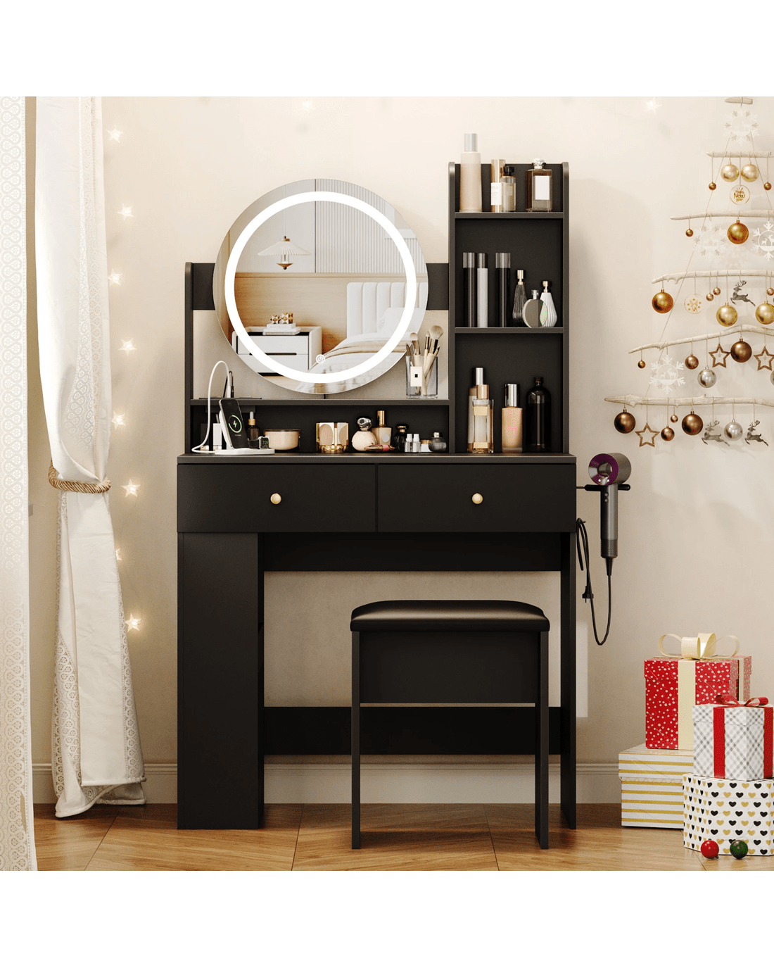 The compact dressing table features a round LED mirror with 3 adjustable color modes for flawless lighting. Designed with open shelves, a spacious tabletop, 2 drawers, a hair dryer rack, and side storage shelves, this multifunctional vanity provides ample space for cosmetics and accessories. The convertible side storage shelves can be installed on either the left or right to suit your room layout.