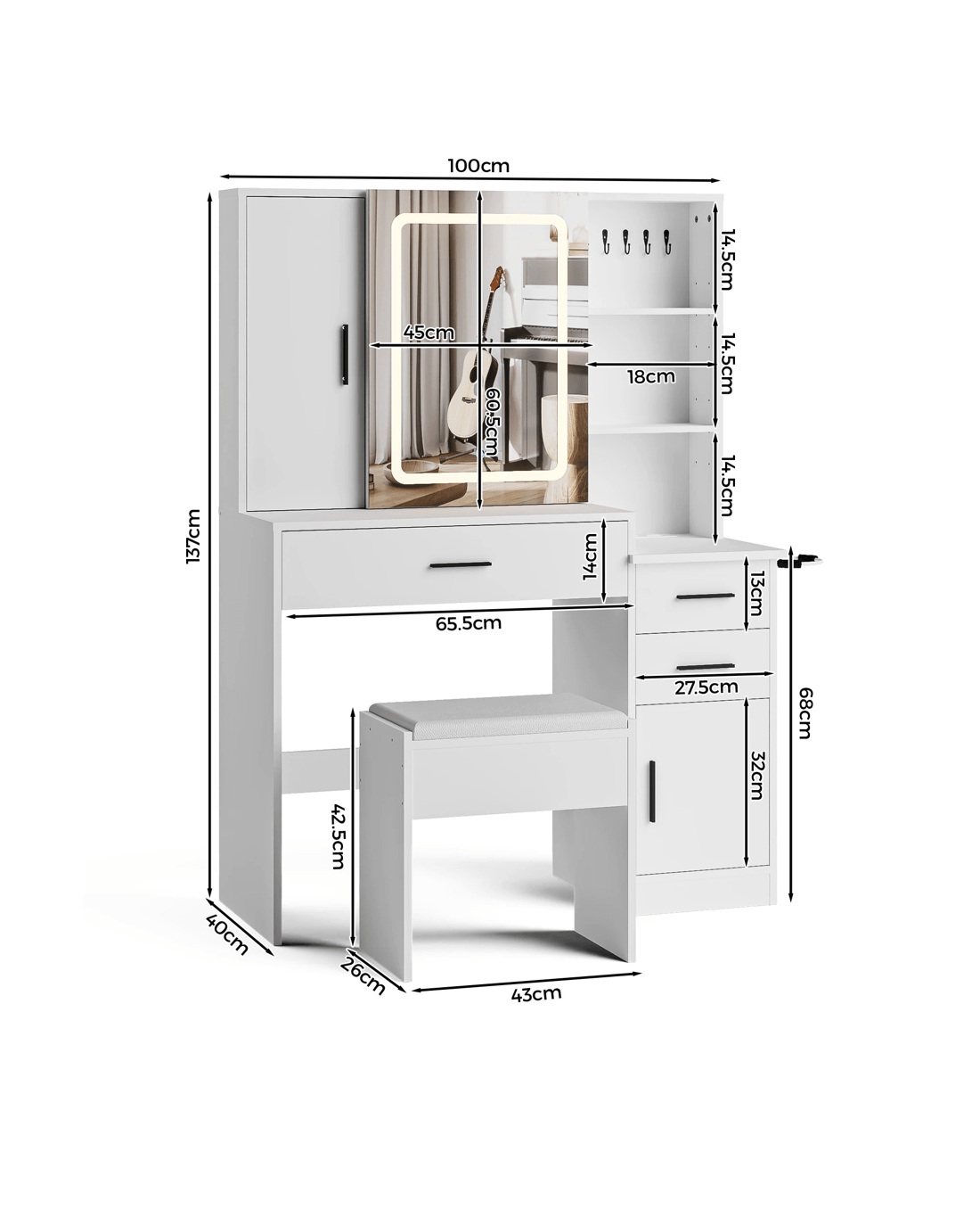 - Dressing Table Size: 100cm(W) x 137cm(H) x 40cm(D)