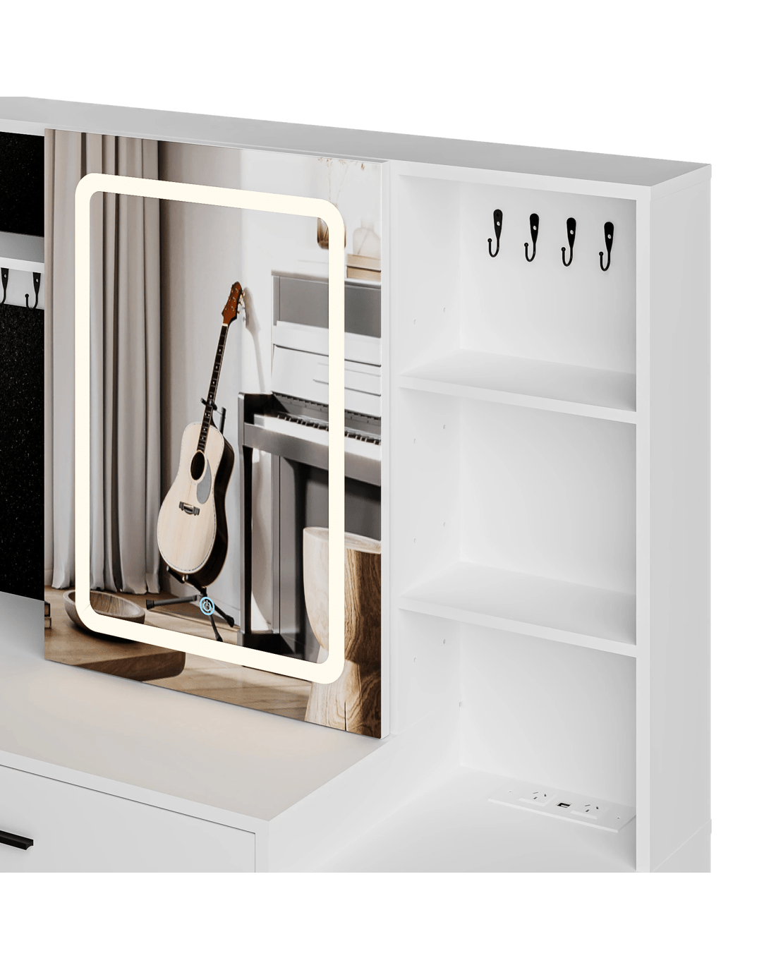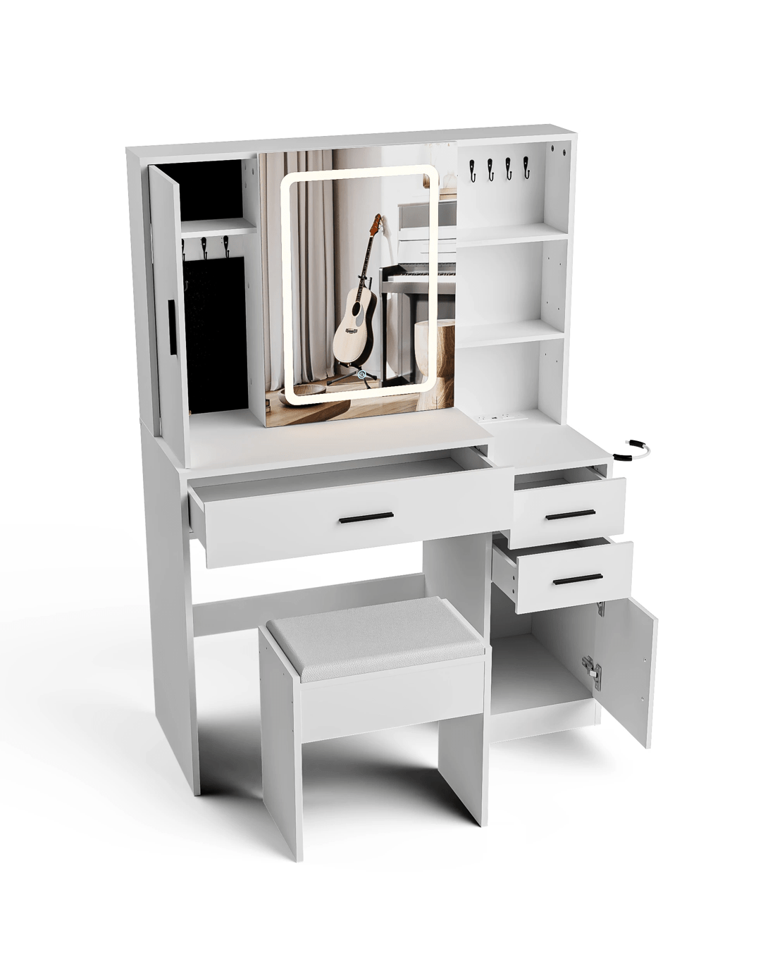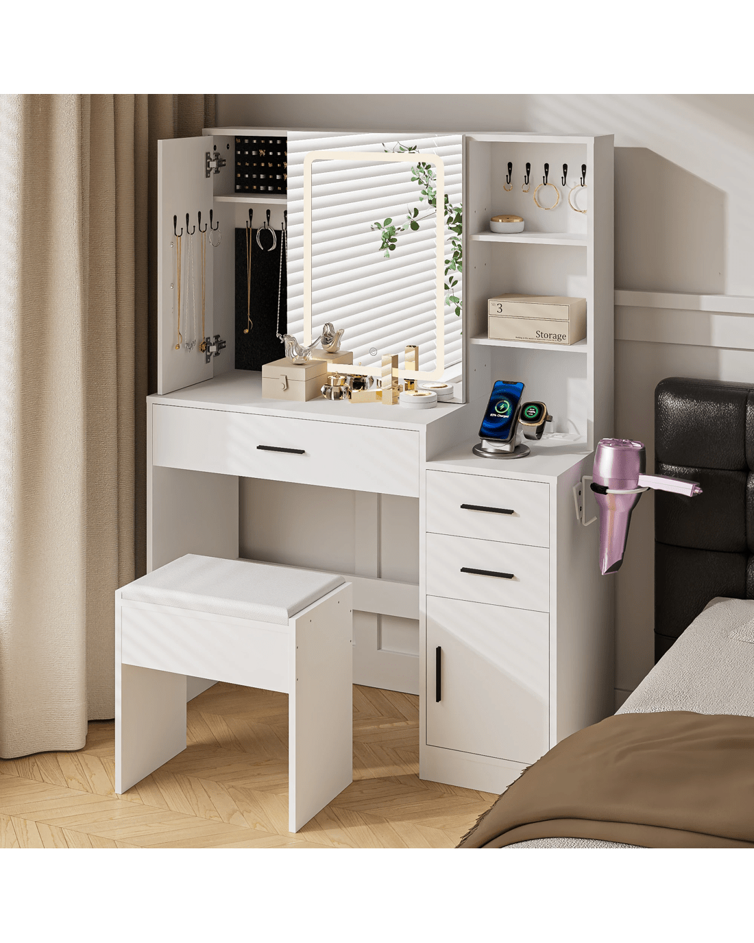 with ample storage, including jewelry cabinets, sliding hidden shelves, side cabinets with adjustable shelf, drawers, makeup worktable, and so on. This fashionable and practical dressing table is the perfect gift for your lover on special occasions,