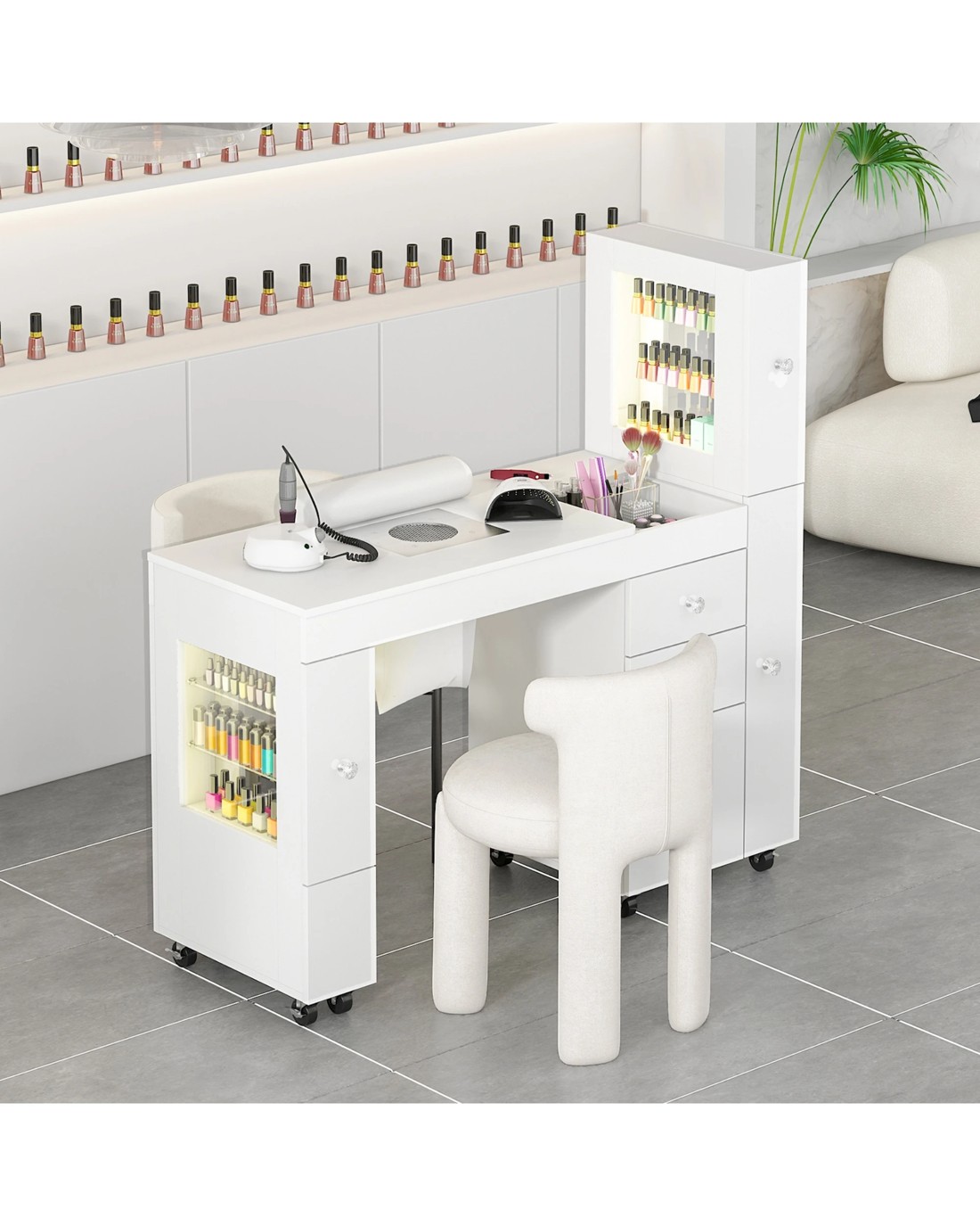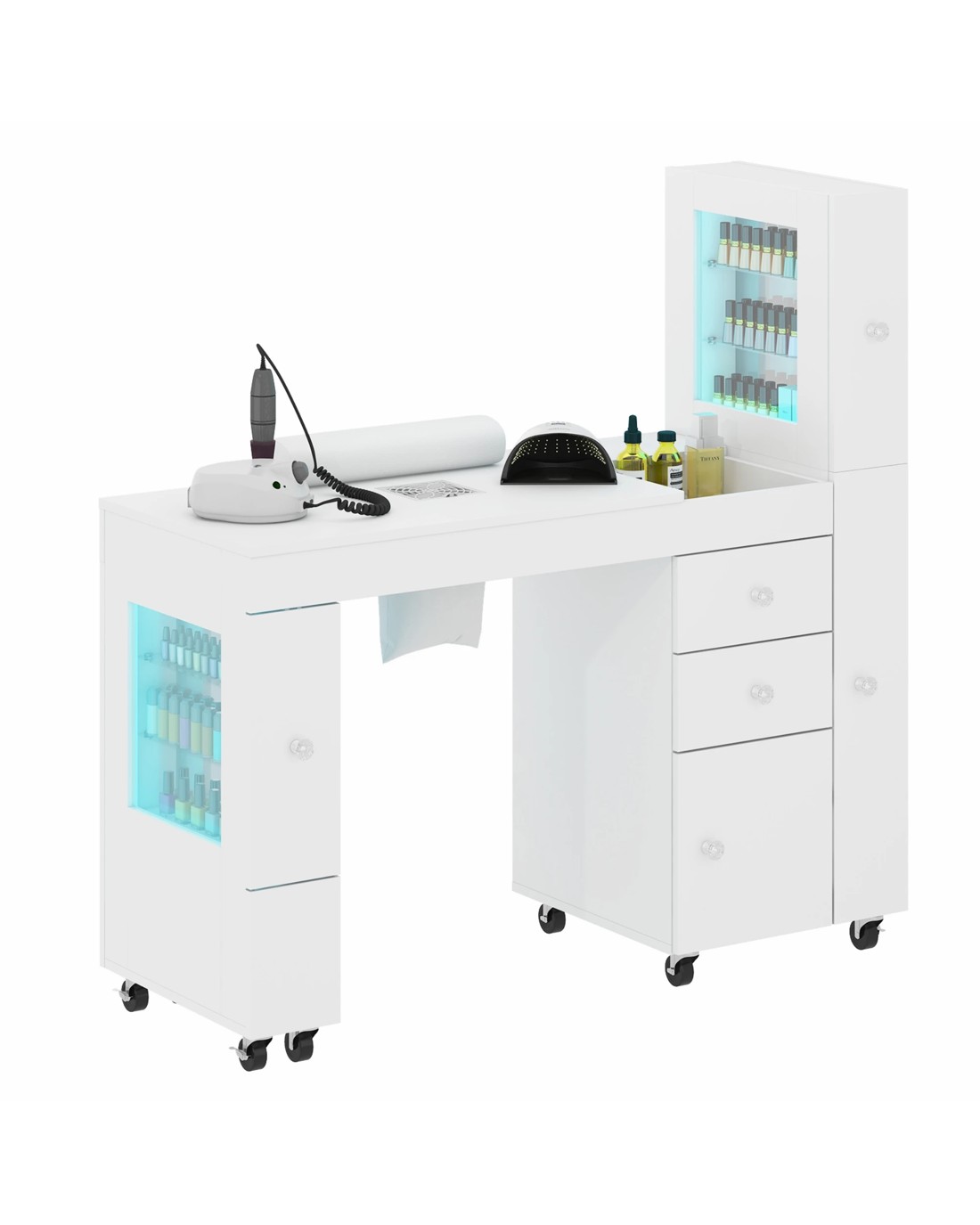 support clean, comfortable sessions. Eight lockable wheels glide smoothly and stay put when you work. Acetone-resistant surfaces and crystal handles fuse durability with modern style—perfect for pros and home nail artists alike.